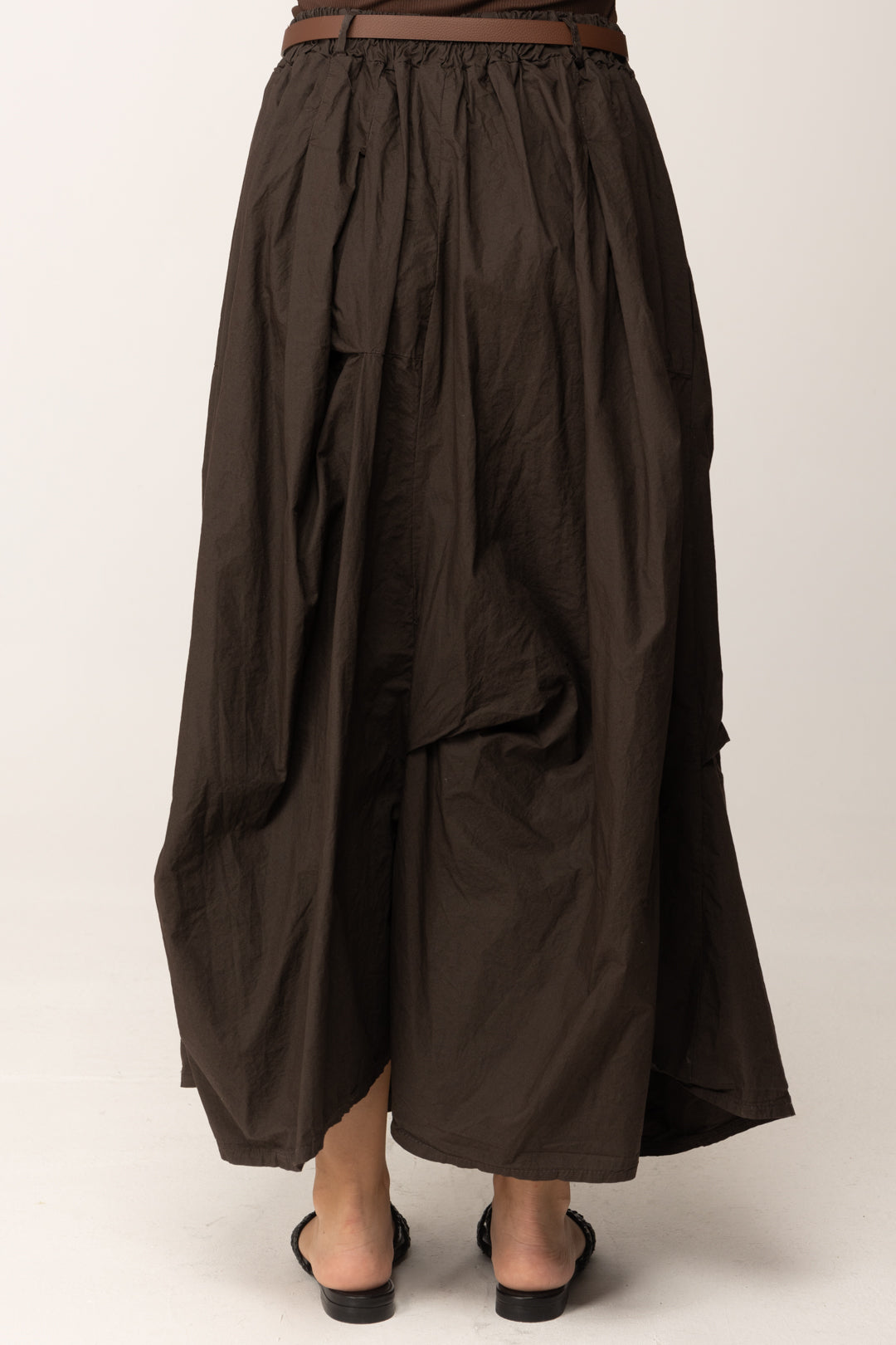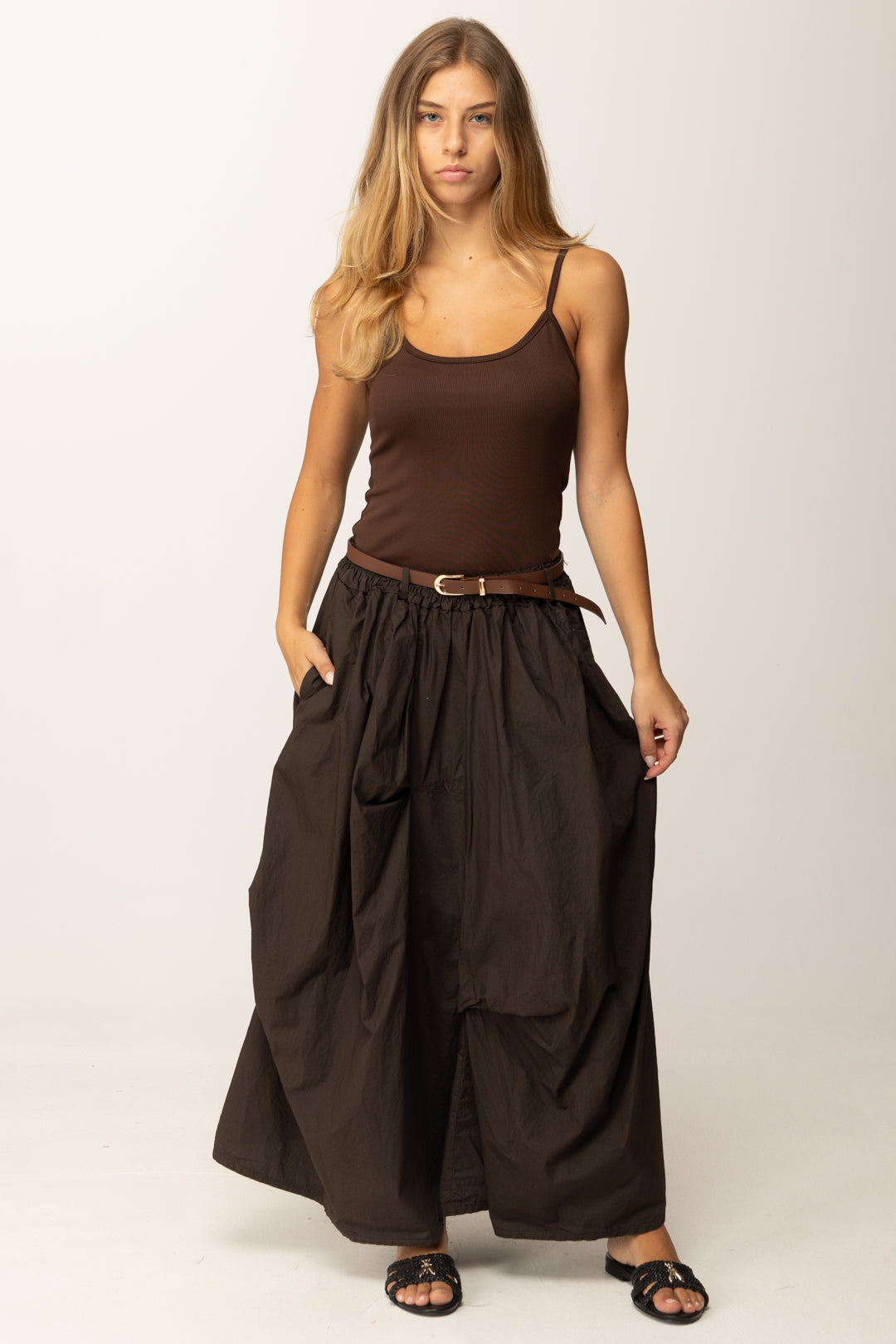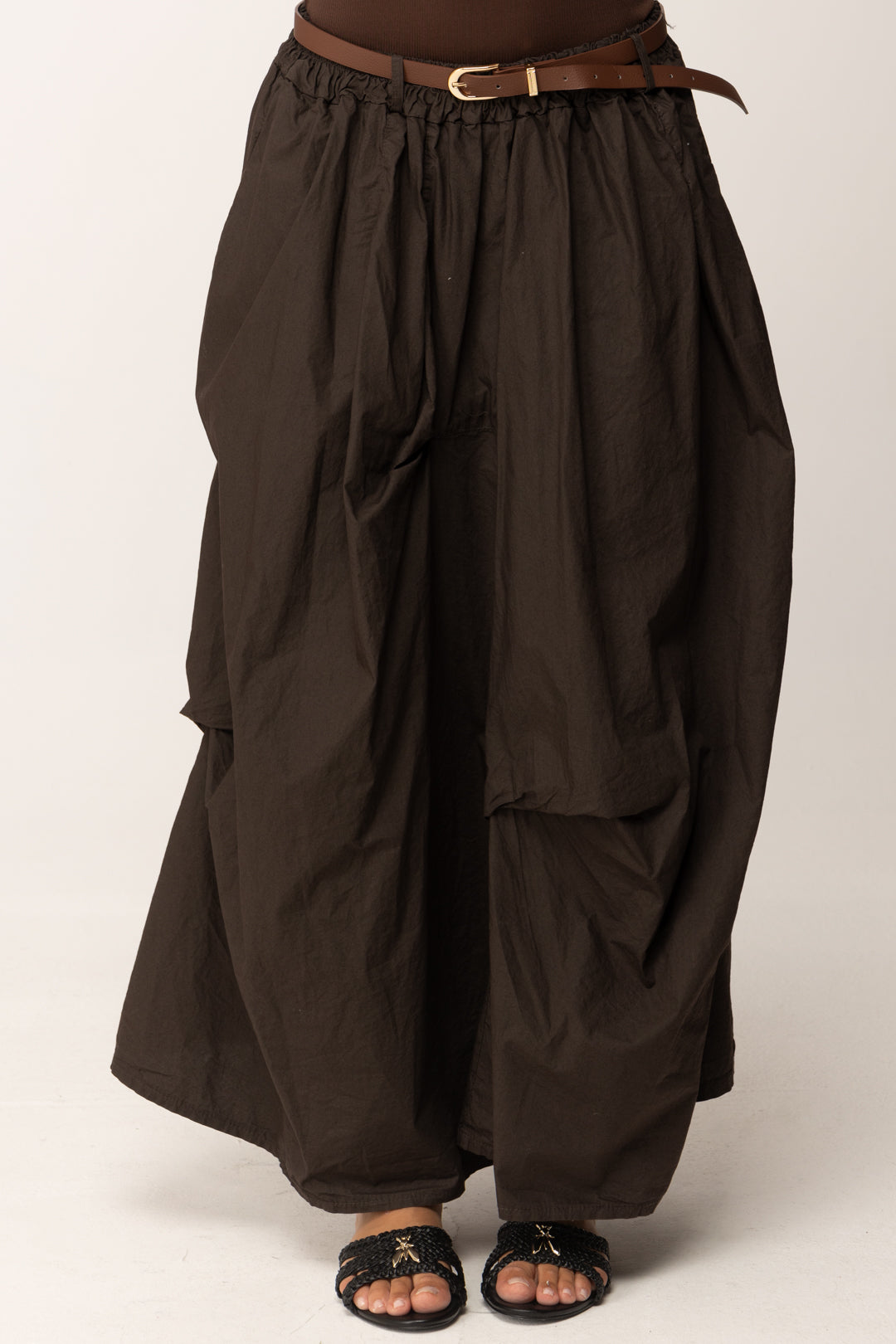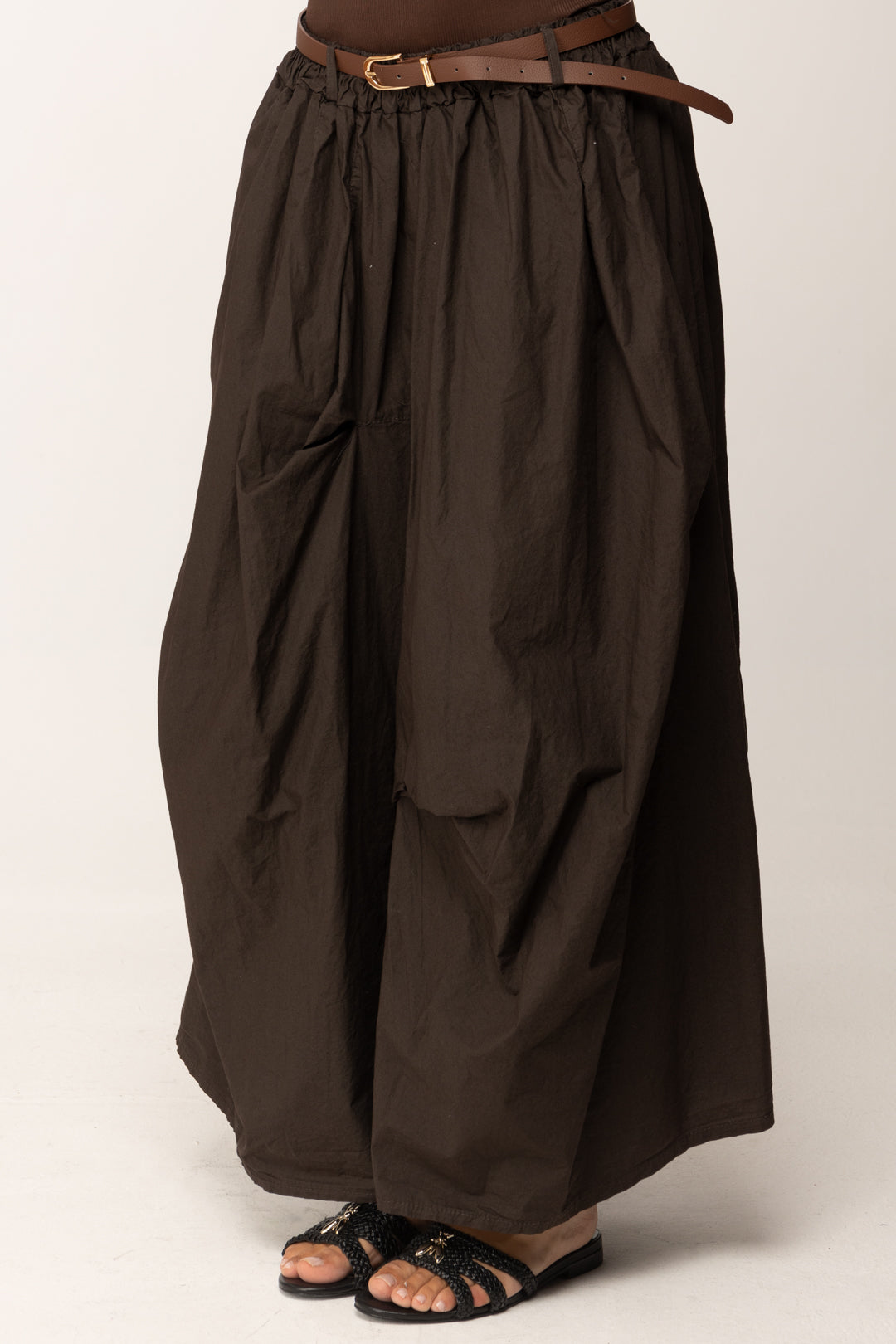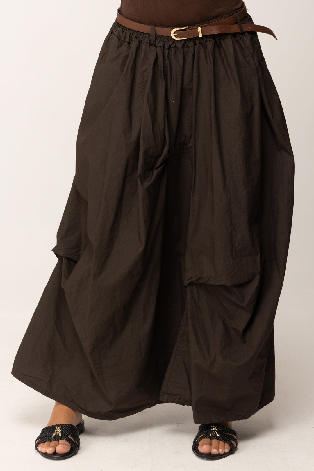 La textura del tejido es intencionadamente irregular, casi desgastada, para evocar una estética natural y auténtica. La cintura es elástica, pero enriquecida con un cinturón de piel sintética con hebilla dorada que define la cintura y añade un toque sofisticado. El color marrón cálido la hace extremadamente versátil, adecuada para cualquier paleta de temporada.