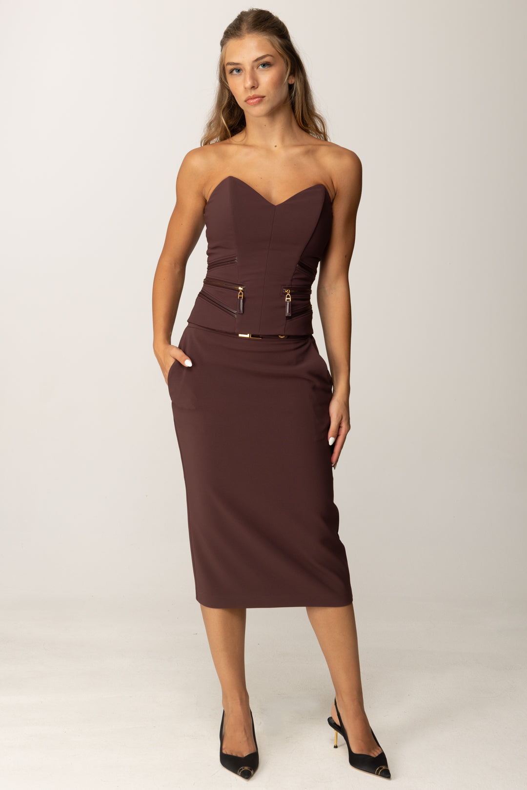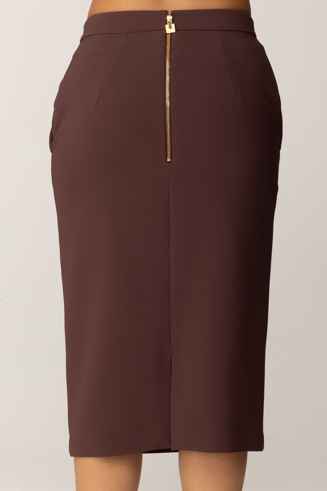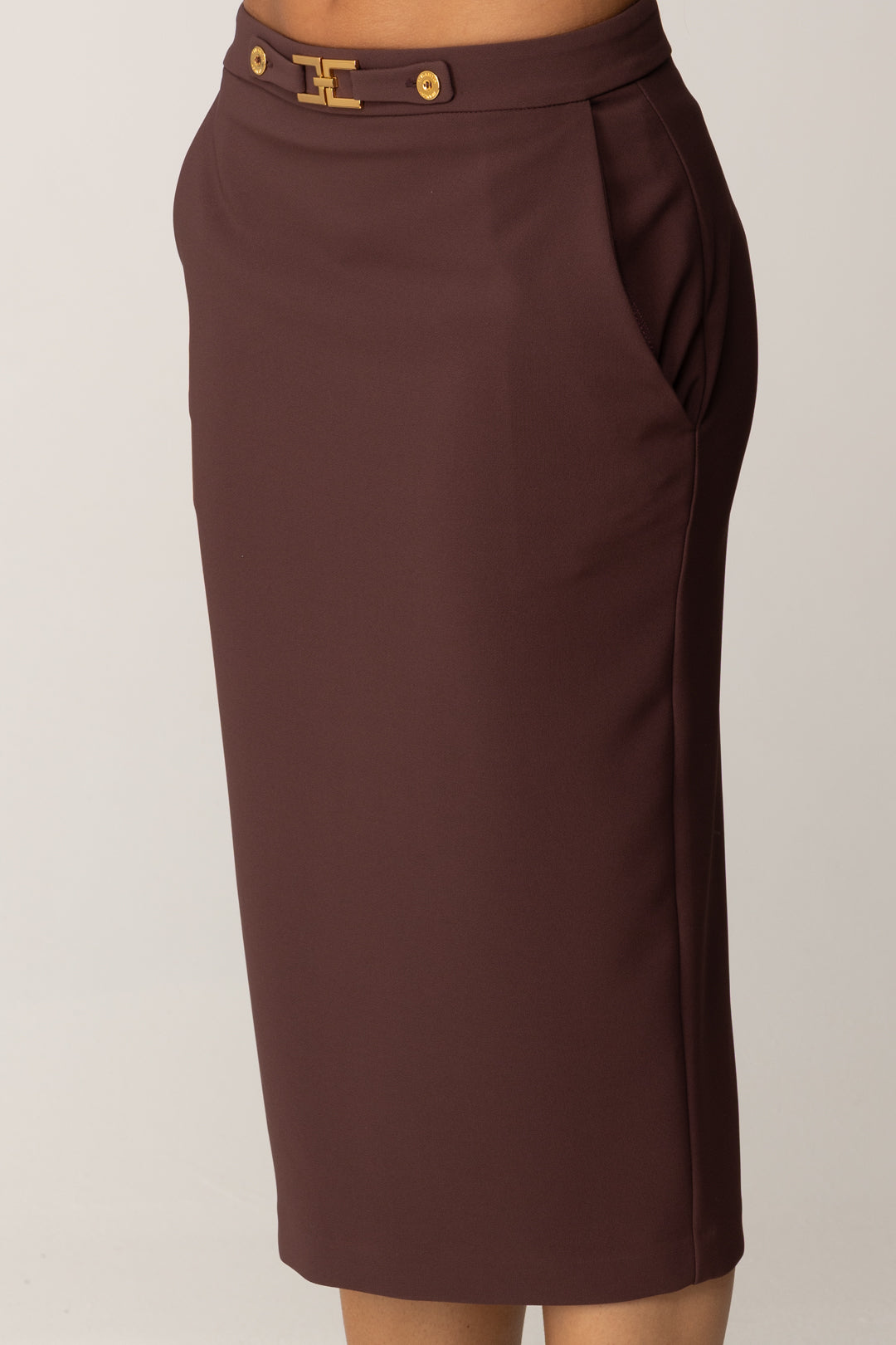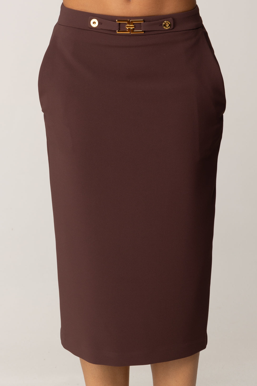 Líneas limpias, carácter decidido y un detalle que captura la mirada: esta gonna Elisabetta Franchi interpreta el estilo lápiz con precisión sartorial y un toque dorado útil para identificar la marca a la que pertenece. El crepé ligero acompaña las formas con naturalidad, mientras la silueta estilizada sigue los movimientos con elegancia sobria. Los bolsillos oblicuos aligeran la construcción, mientras el logo joya en la cintura, compuesto por una placa metálica y pequeños botones dorados, añade luz y personalidad sin resultar nunca invasivo.