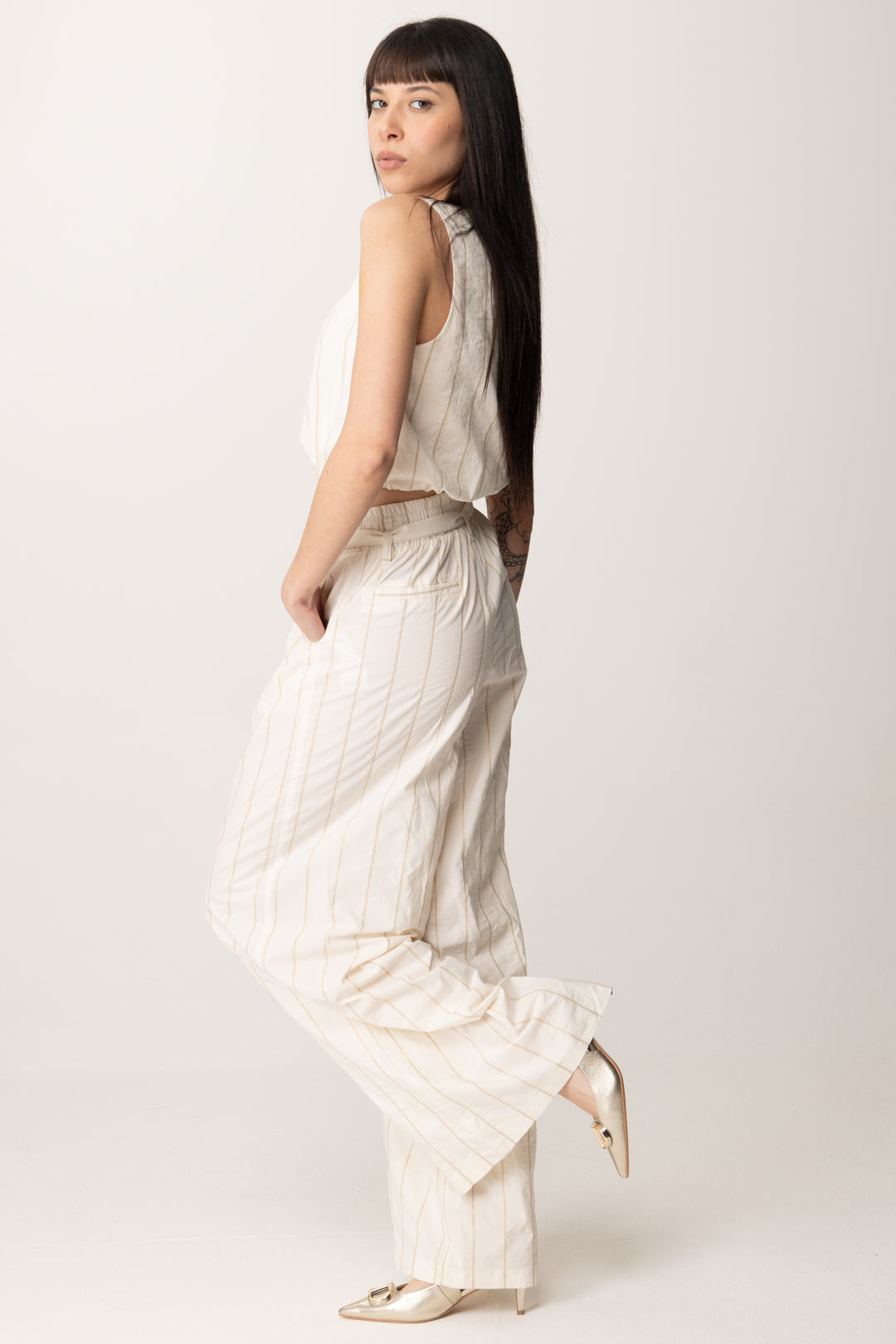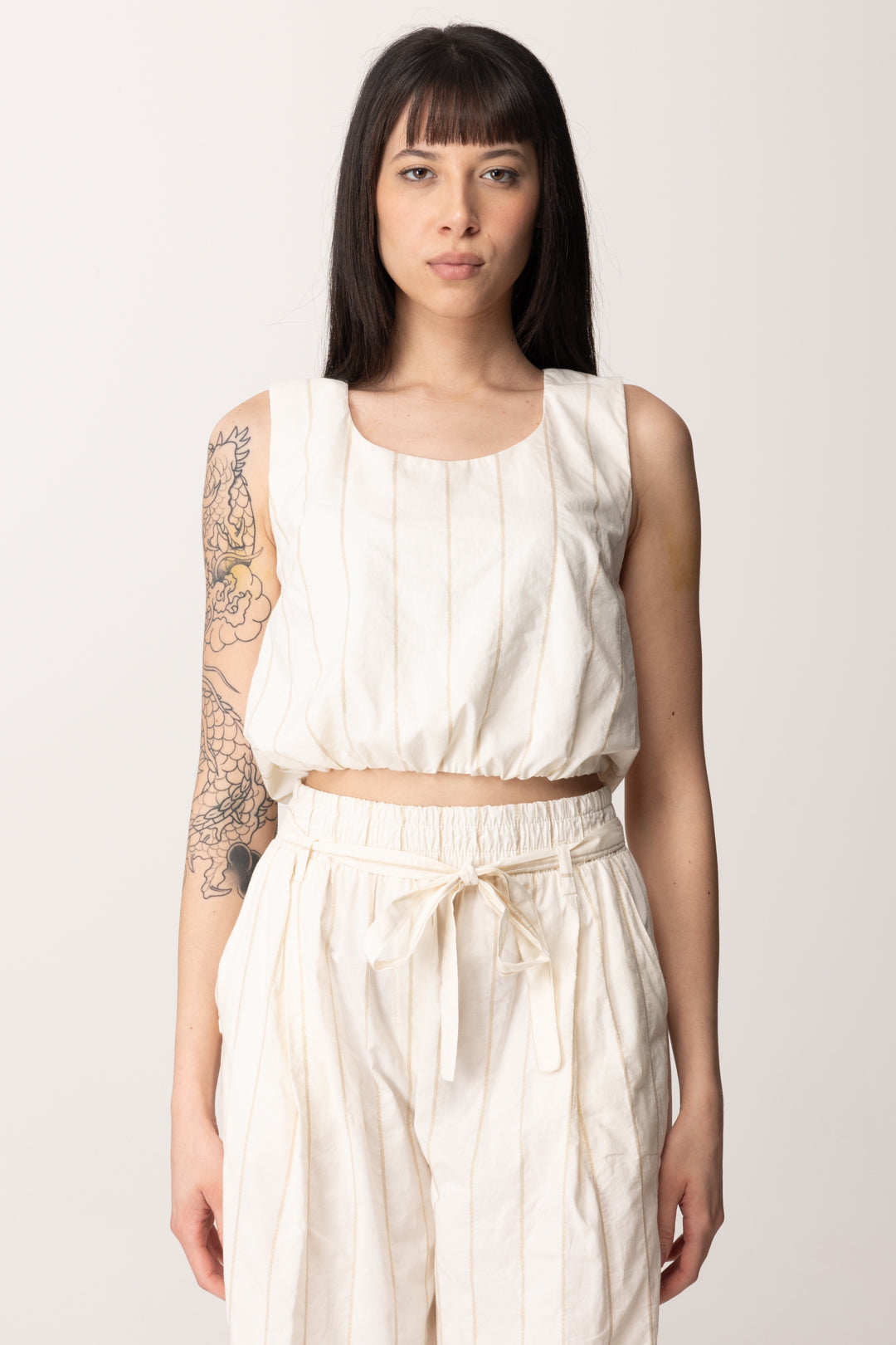 Fresco y veraniego top Manila Grace realizado en algodón y caracterizado por una delicada estampado a rayas y corte crop. Perfecto con muchos bottoms de tu guardarropa, gracias a la coloración neutra y delicada, pruébalo también en combinación con el pantalón con la misma fantasía para un conjunto fresco y femenino que lucir durante todo el verano.