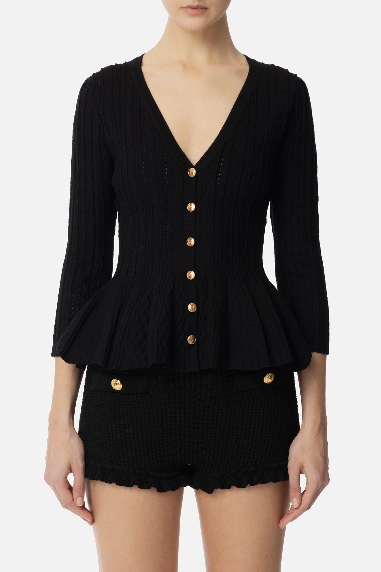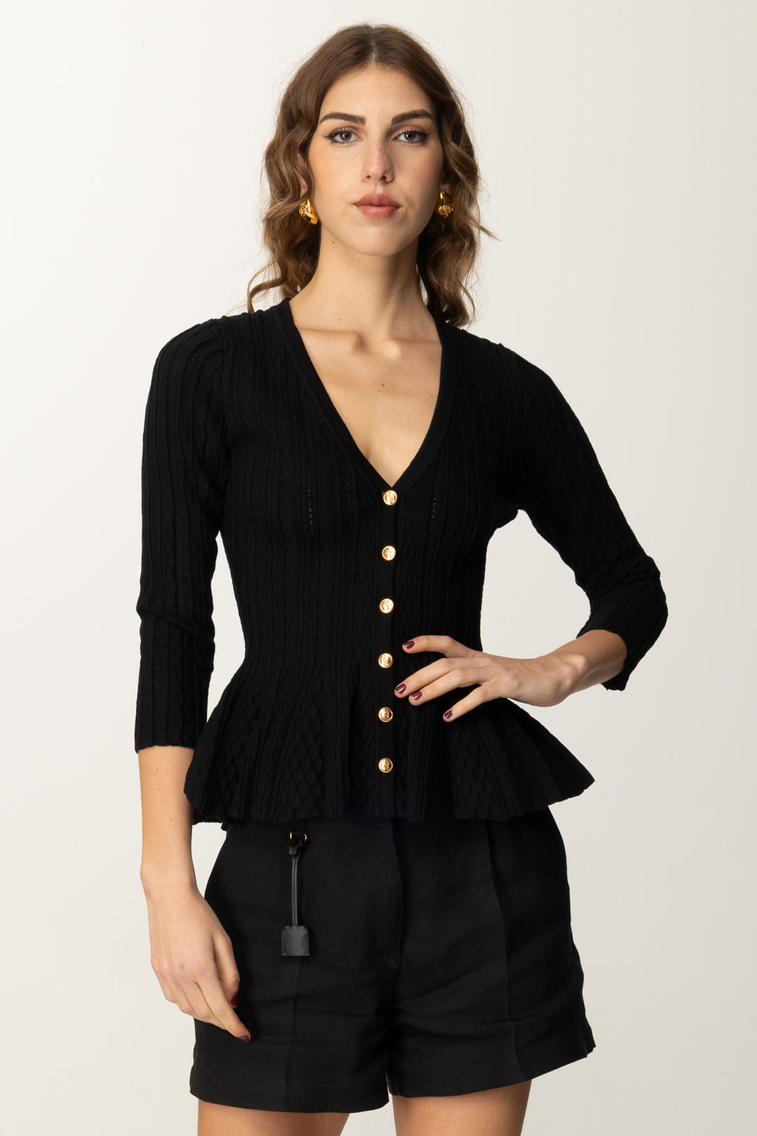 Femenino y sofisticado, este Cardigan Elisabetta Franchi realizado en punto de tela, realza la silueta gracias a la línea ajustada, caracterizada por un volante plisado en el fondo. El escote en V, los botones brillantes y las mangas ¾ completan esta prenda haciéndola ideal para todos los looks casual-chic, con una gonna midi para una elegancia refinada o jeans para un toque sofisticado.