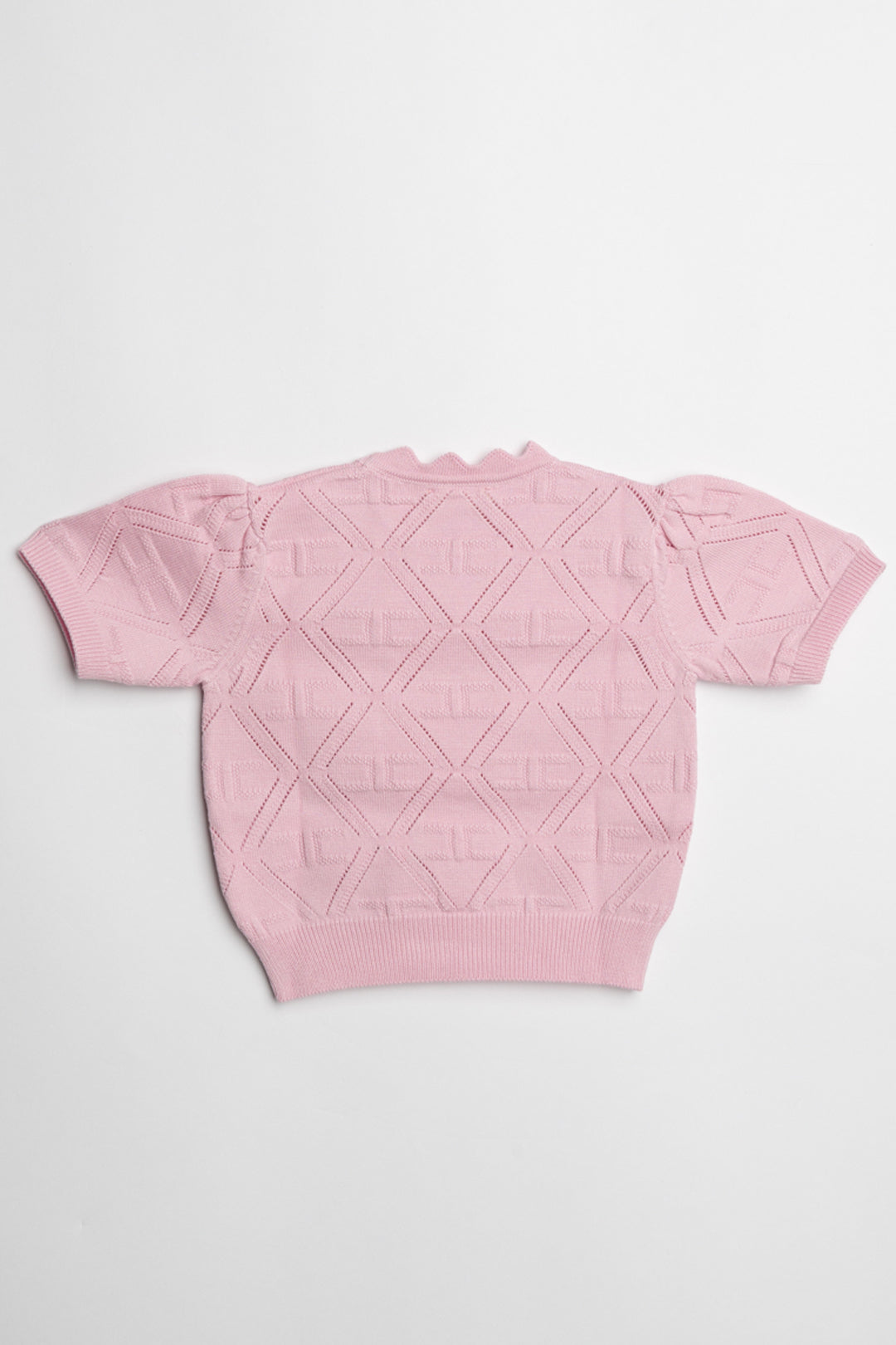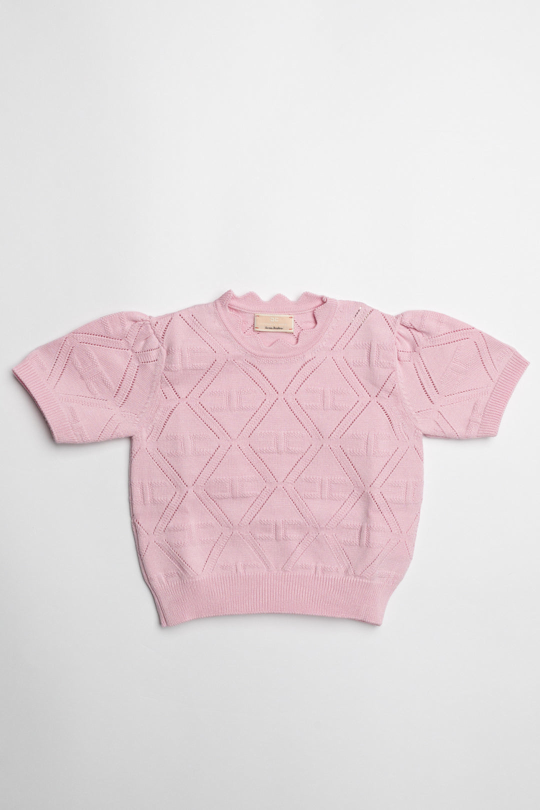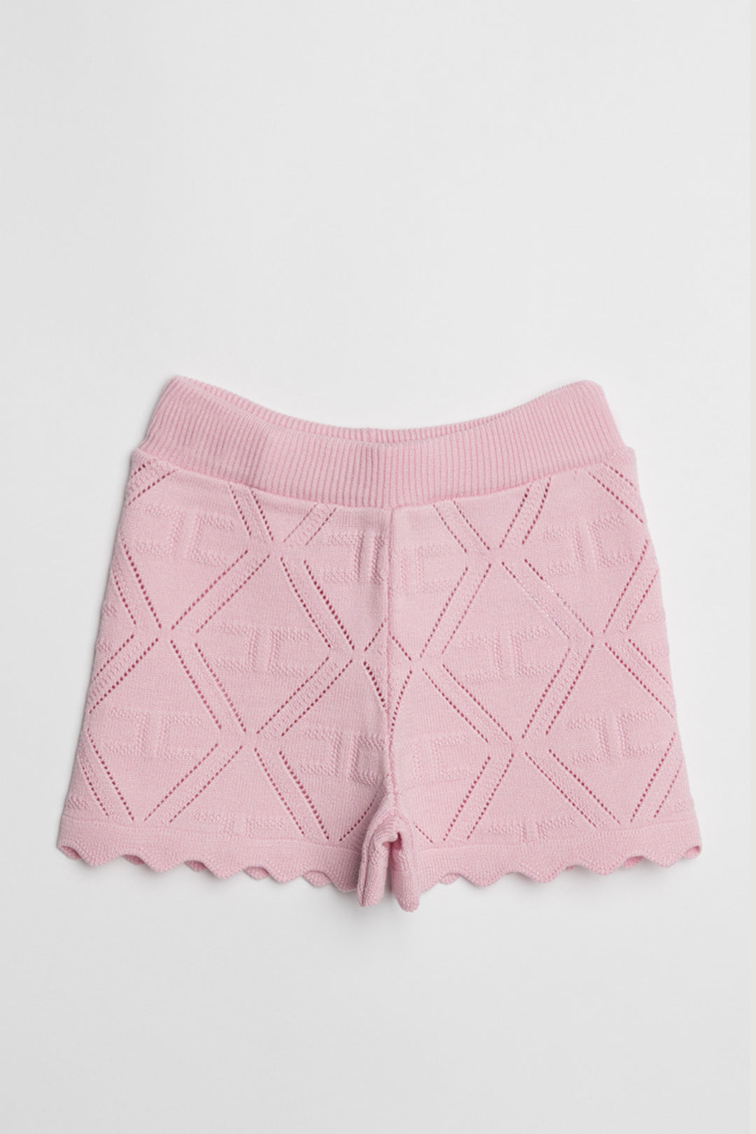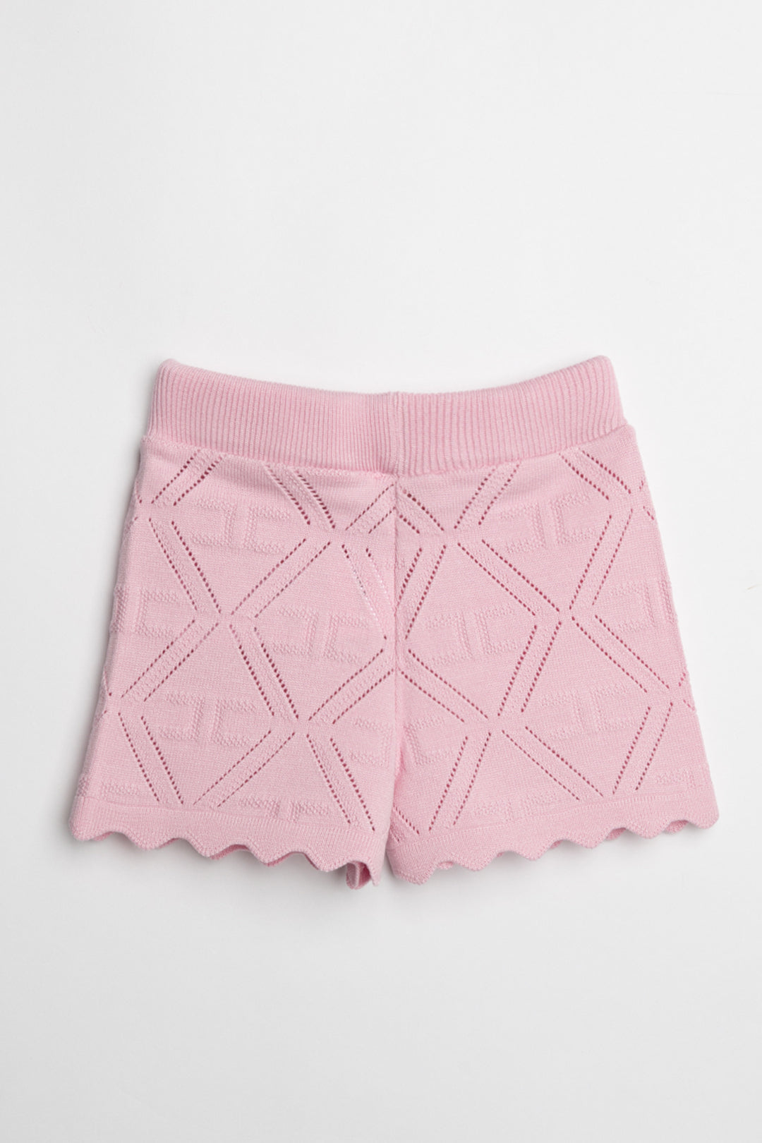 Delicioso Completo Elisabetta Franchi La Mia Bambina en punto calado con logo all-over, compuesto por top de manga corta y shorts con bordes ondulados. El must-have mini-me con espíritu contemporáneo y cómodo.