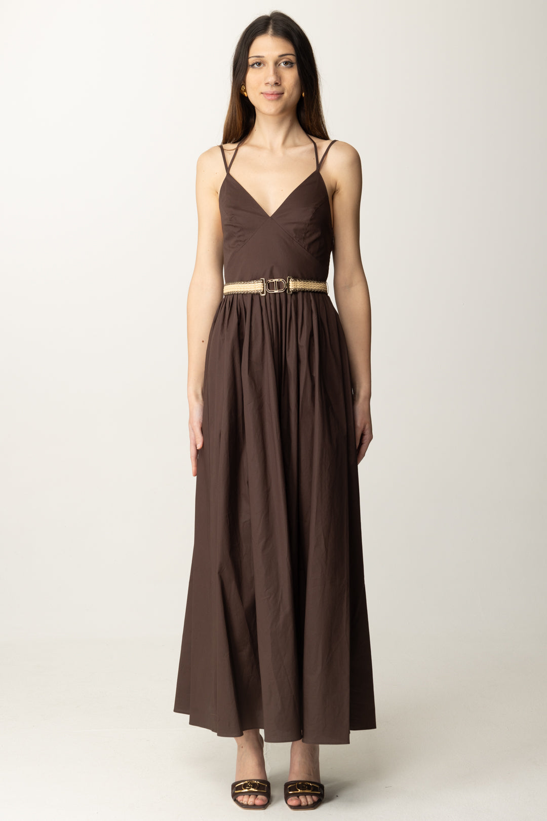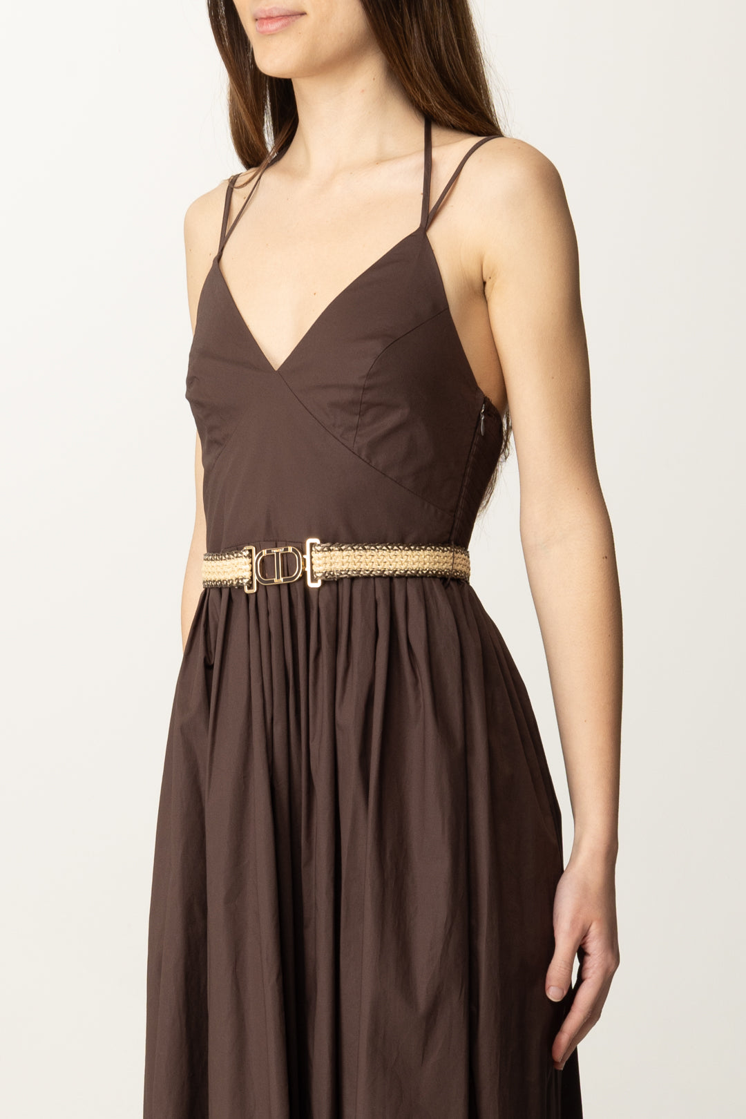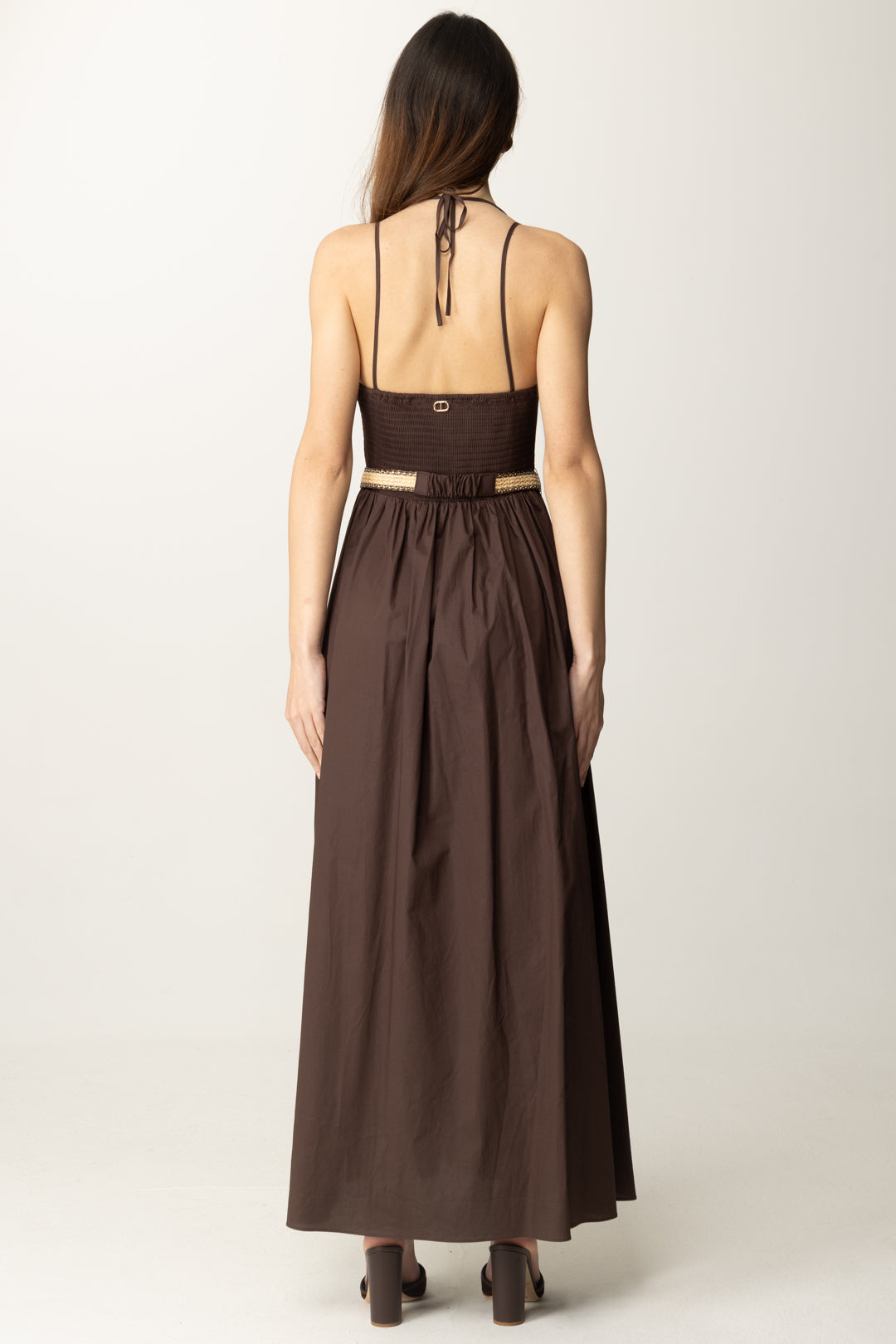 Vibes estivales para este abito lungo Twinset en popelina de algodón, que tiene su particularidad en el juego de las dobles tirantes, de las cuales un par se atan al cuello. Cintura rematada con cinturón con logo, un conjunto despreocupado para momentos que lo sean igualmente, ¡como requiere la temporada!