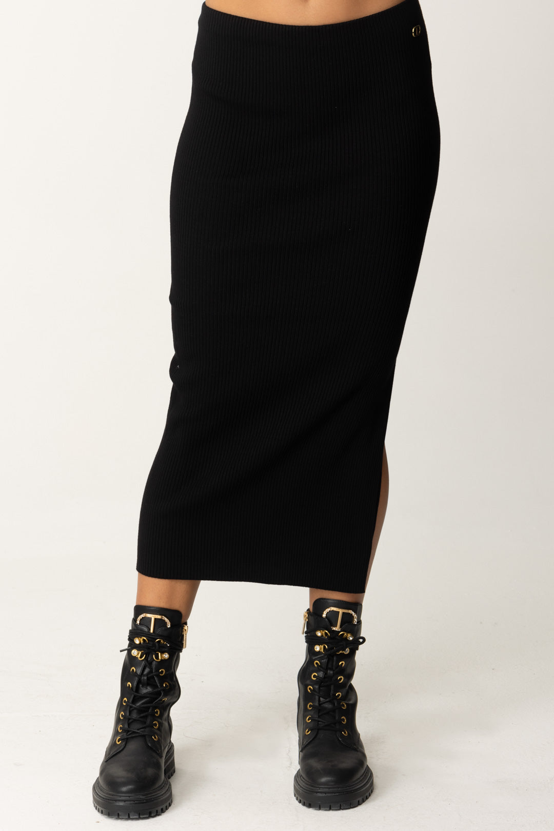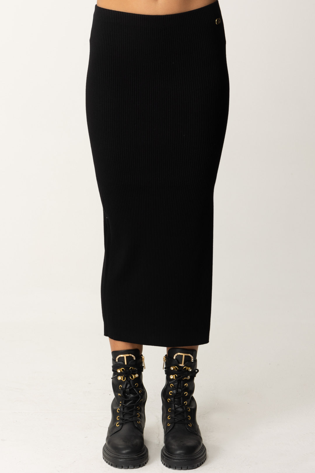Para ti que eres amante del midi, otra propuesta de temporada: una gonna de punto Twinset en viscosa elástica, estrecha como un vestido tubo pero abierta lateralmente con una abertura profunda que además es esa nota sexy que te hará apreciarla aún más. Básicos y versátiles, ¡para outfits cuyo humor marcarás!