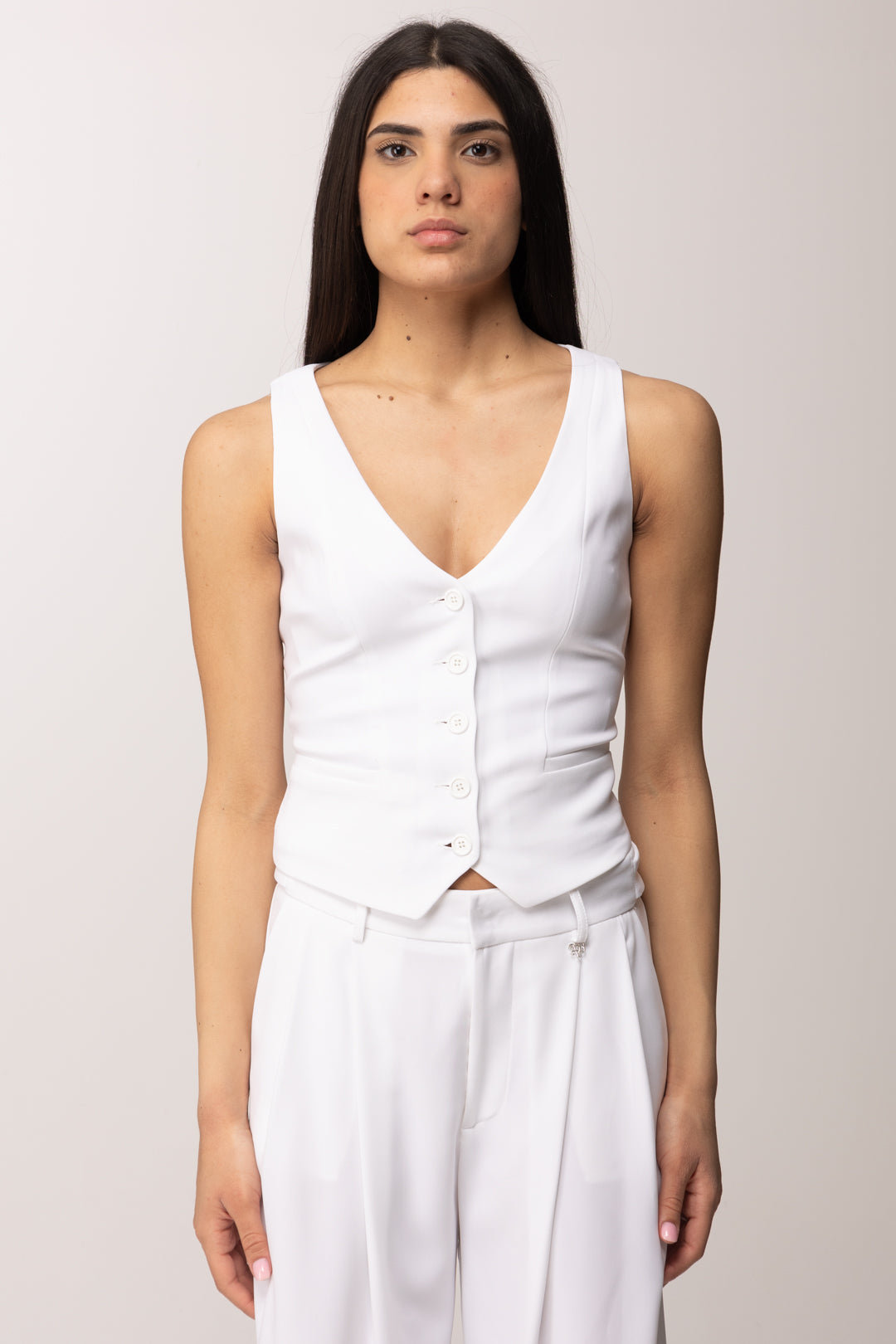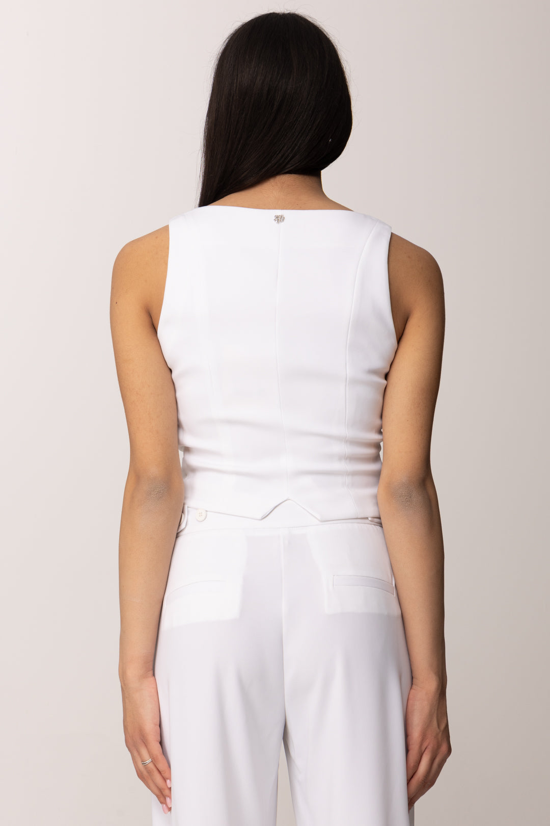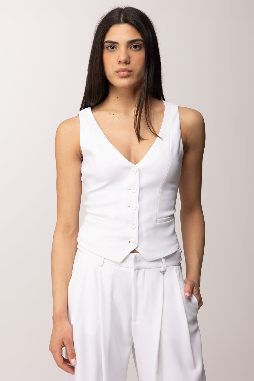 Un capo che sa farsi notare per le sue linee pulite e per i dettagli sartoriali, perfetto per chi ama uno stile contemporaneo e ben definito. Indossalo sopra un top minimal o una camicia leggera e abbinalo a pantaloni sartoriali a vita alta per un look da giorno curato e sofisticato. Per un outfit da sera o cerimonia elegante, prova a indossarlo anche a pelle e a combinarlo con una gonna fluida e accessori metallici: il contrasto tra la silhouette strutturata di questo top e i tessuti morbidi degli altri capi crea un equilibrio stilistico davvero chic.