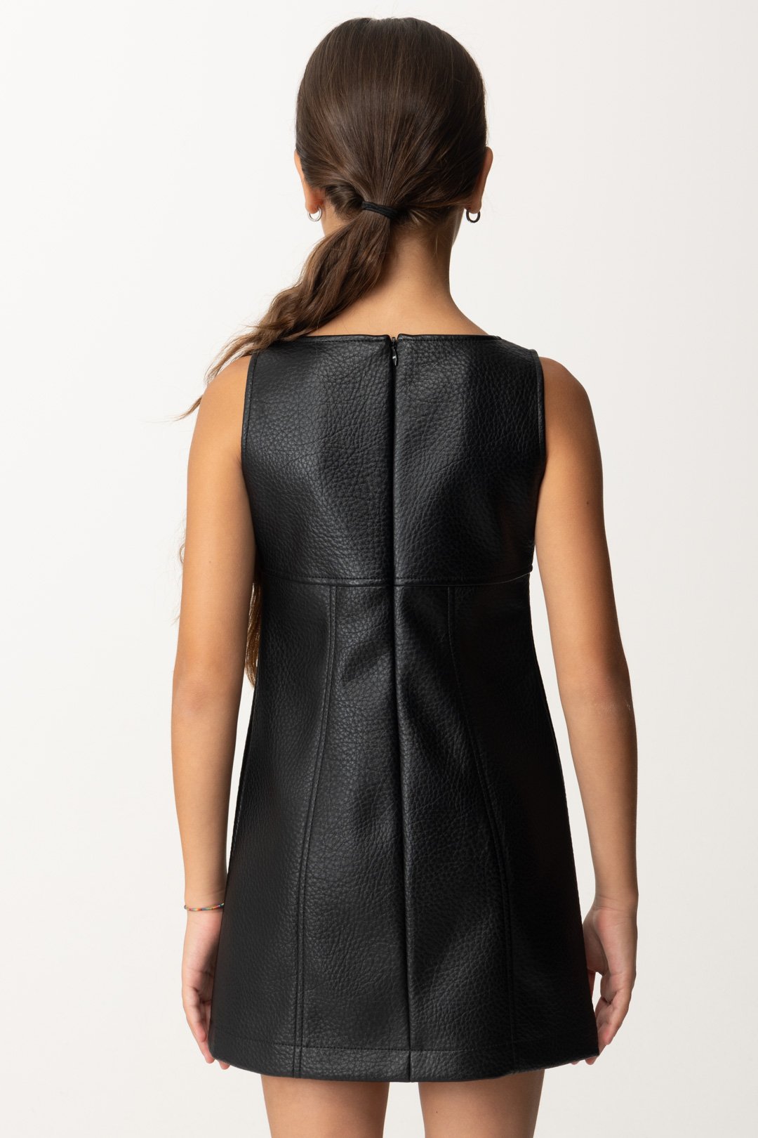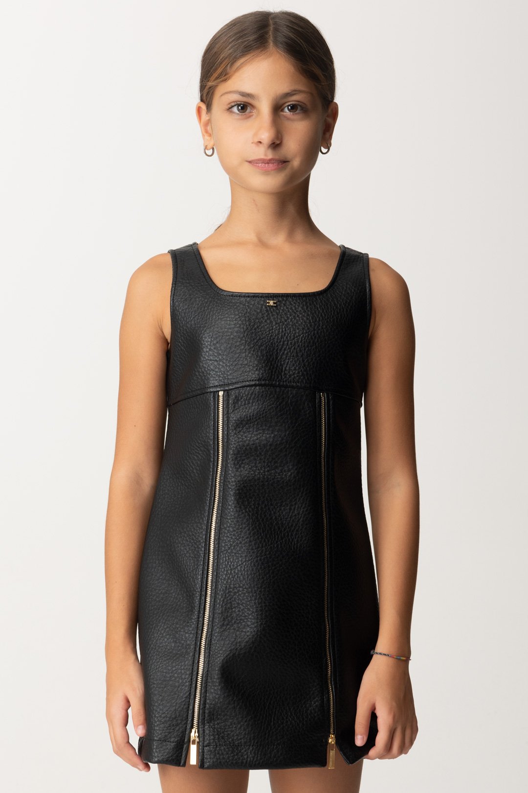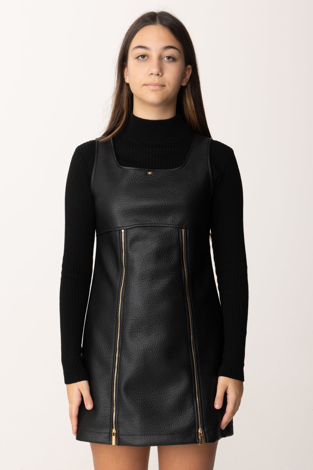 Un mini vestido La mia bambina Elisabetta Franchi para verdaderas señoritas! Realizado en eco-piel con un ajuste boxy, se caracteriza por cremalleras frontales ornamentales y escote cuadrado. Crea outfits también en combinación con blusas y suéteres de cuello alto, y completa todo con unas botas: ¡será súper glamuroso!
