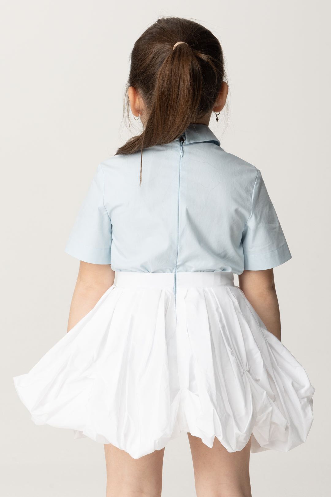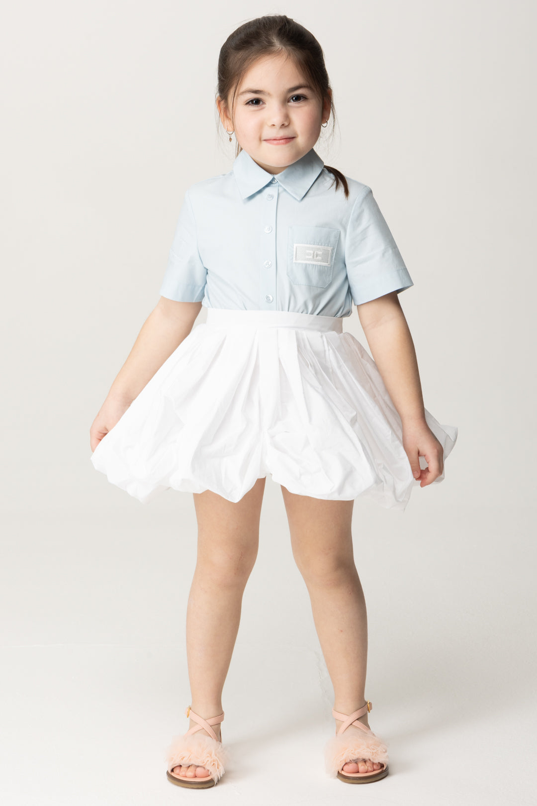 Vestido Elisabetta Franchi La mia Bambina que te permite lucir la belleza de un conjunto bien diseñado pero con la practicidad de una sola pieza! Top de camisa con mangas cortas y bolsillo en el pecho con etiqueta de logo bordada, gonna volumétrica de tafetán, que crea un delicioso efecto globo que anima el conjunto: un mini vestido que se convierte en un evento cuando es necesario, pero también para paseos en familia con bailarinas y mini bolso.