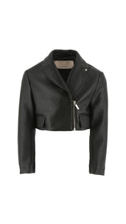 Un abrigo lleno de garra para señoritas llenas de energía: el chiodo Elisabetta Franchi La mia bambina es la versión para niñas de esta prenda de abrigo atemporal, realizada en versión crop y con materiales sintéticos efecto piel martillada. Pequeñas solapas en la cintura y cierre con cremallera descentrada, un verdadero toque de estilo para sus conjuntos casuales pero no solo. Placa con logo CC en la solapa del cuello.