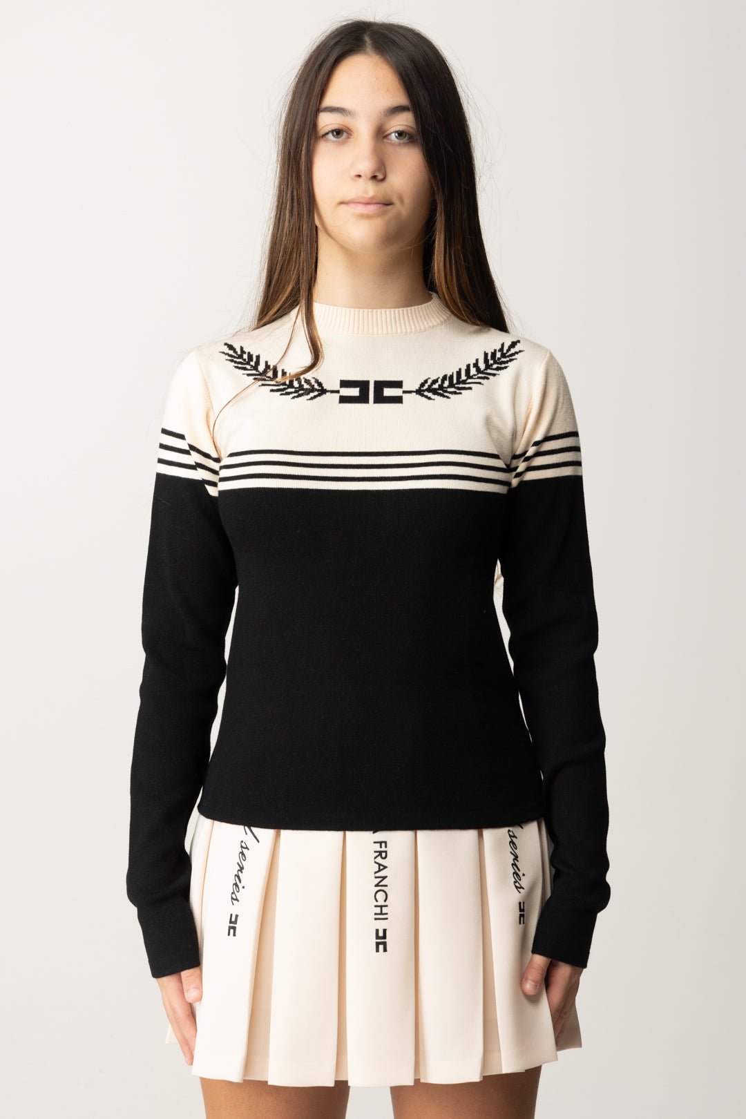 Sencillo pero no demasiado, lo suficientemente sabroso como para llamar la atención: el logo en el pecho te hace reconocer inmediatamente este suéter Elisabetta Franchi la mia Bambina en mezcla de viscosa, que te encantará combinar con pantalones casuales para complementar un toque elegante, pero también con elegantes faldas y pantalones de temporada.