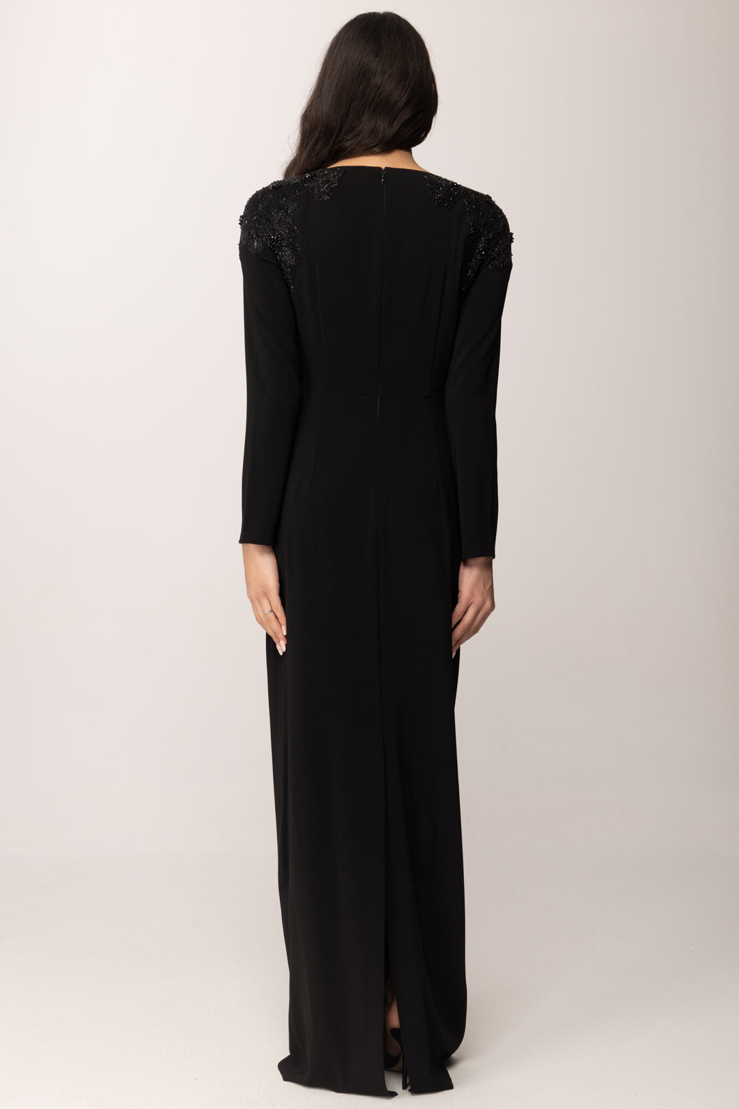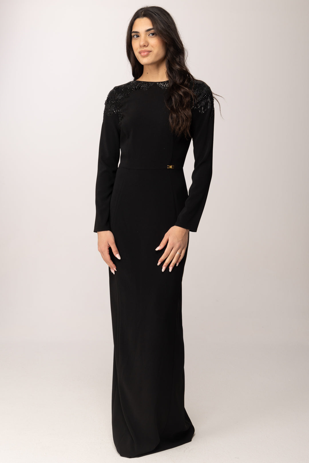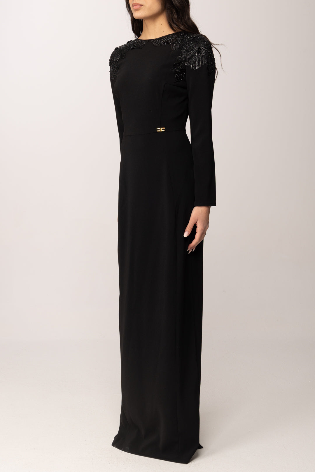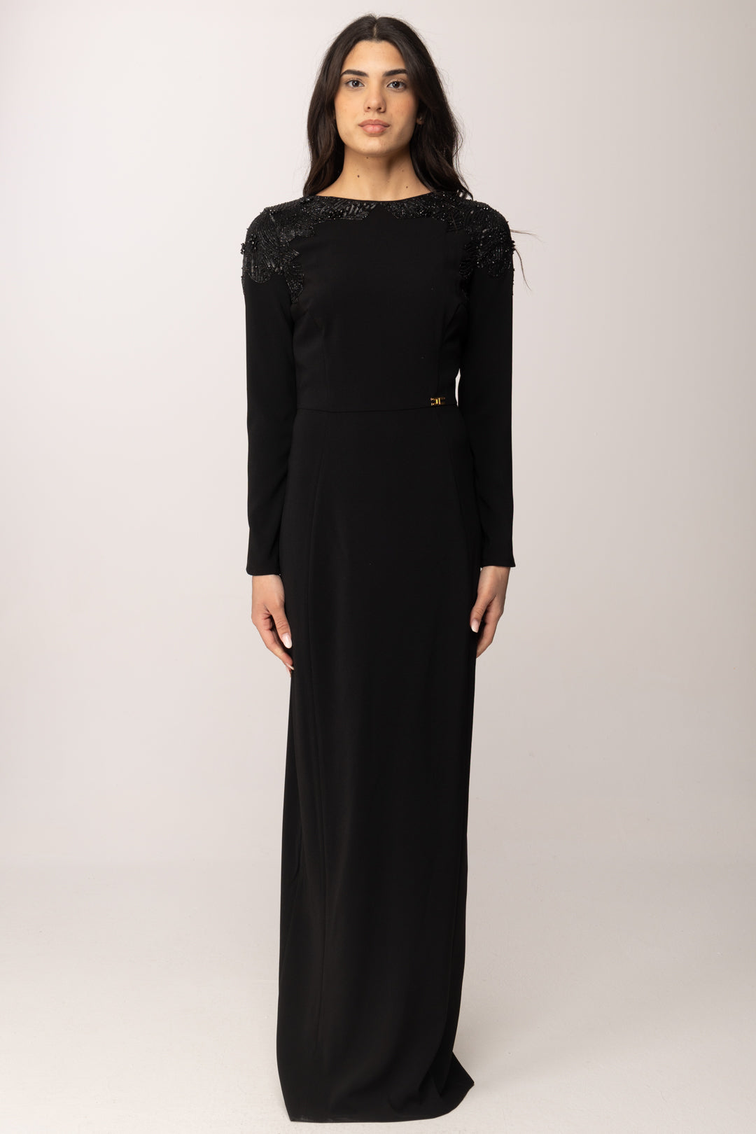 Un abito lungo Elisabetta Franchi che interpreta l'eleganza con decisione e gusto contemporaneo. La linea è pulita, essenziale, quasi scultorea, ma viene trasformata dai preziosi ricami gioiello che incorniciano le spalle come un’armatura luminosa. Il contrasto tra la superficie compatta del tessuto e la tridimensionalità dorata dei ricami crea un equilibrio raffinato tra rigore e ostentazione. a silhouette è aderente sul busto, con vita definita e gonna che scivola dritta fino a terra, allungando visivamente la figura. Le maniche lunghe contribuiscono a mantenere l’impianto formale e solenne del capo, mentre il dettaglio logo in metallo in vita sottolinea il punto focale con discrezione e carattere