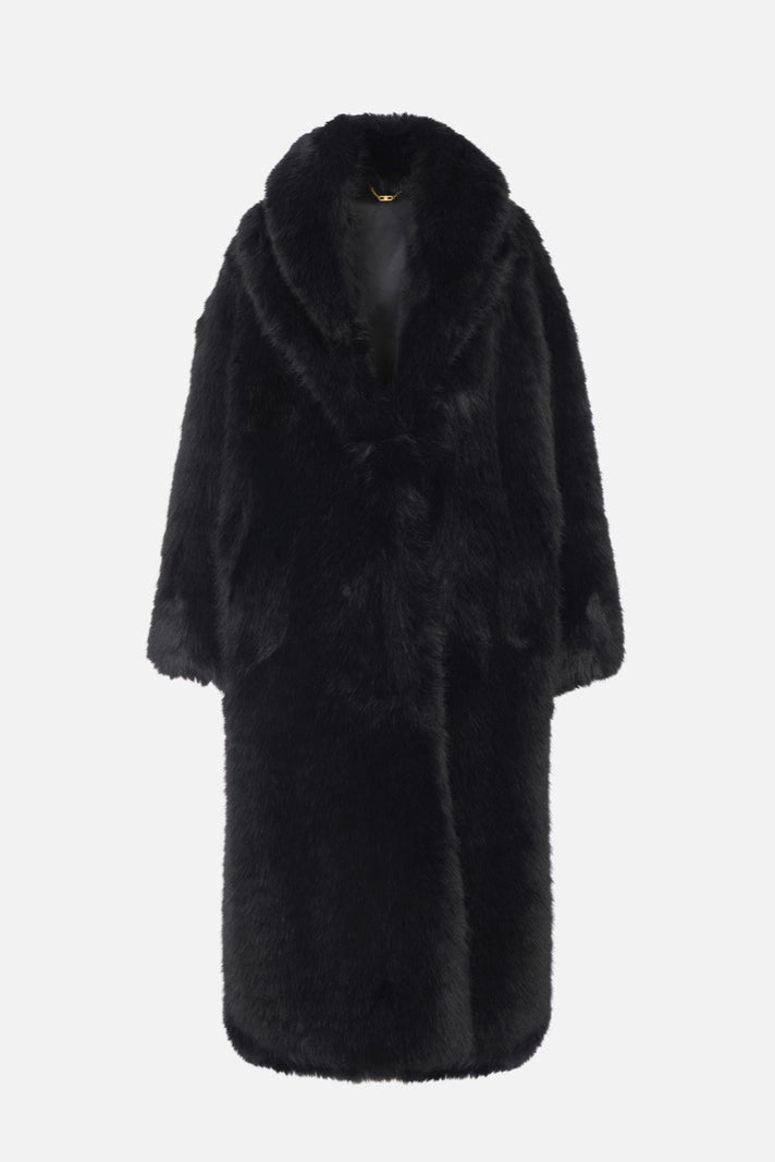 Un ícono de estilo que transforma el invierno en una pasarela de elegancia. Este abrigo largo firmado Elisabetta Franchi está realizado con una textura efecto pelo que aporta volumen, luz y una extraordinaria sensación envolvente. El cuello de chal oversize enmarca el rostro y añade un toque teatral al look, mientras que la línea suave y amplia se desliza sobre el cuerpo con naturalidad. La talla oversize lo hace perfecto para llevar sobre vestidos elegantes o conjuntos más casuales, para un efecto dramático pero sofisticado. El diseño está pensado para envolver, mimar y destacar, gracias a una estructura fluida y al mismo tiempo escenográfica. Una verdadera declaración de estilo, pensada para quienes aman las prendas fuera de lo común, sin renunciar a la sofisticación. Forrado internamente en raso monogram para un toque adicional de lujo, es ideal para afrontar la temporada fría con carácter. Llévalo con botas de punta, zapatos de tacón o incluso zapatillas para un estilo ecléctico pero siempre impecable.