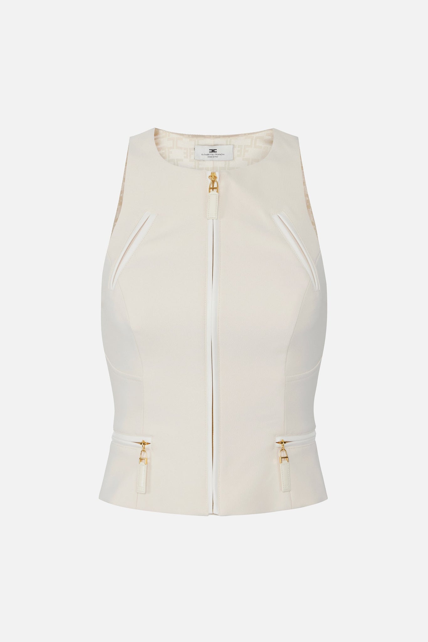 Estilo minimalista y líneas limpias se encuentran en este top Elisabetta Franchi realizado en doble crepé y pensado para quien ama la refinada discreción. El ajuste ceñido sigue la silueta con elegancia, mientras que el escote americano aporta un toque femenino y contemporáneo, realzando los hombros. Los detalles en cremallera - enmarcados por finos ribetes tono sobre tono - añaden un elemento couture, uniendo estética y carácter en una prenda versátil y estructurada.