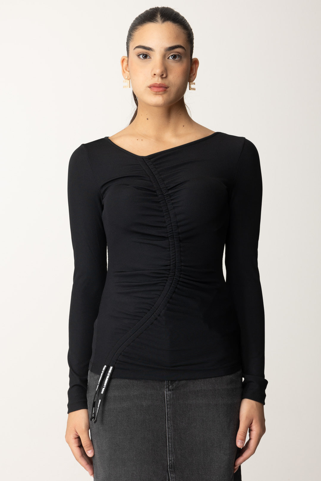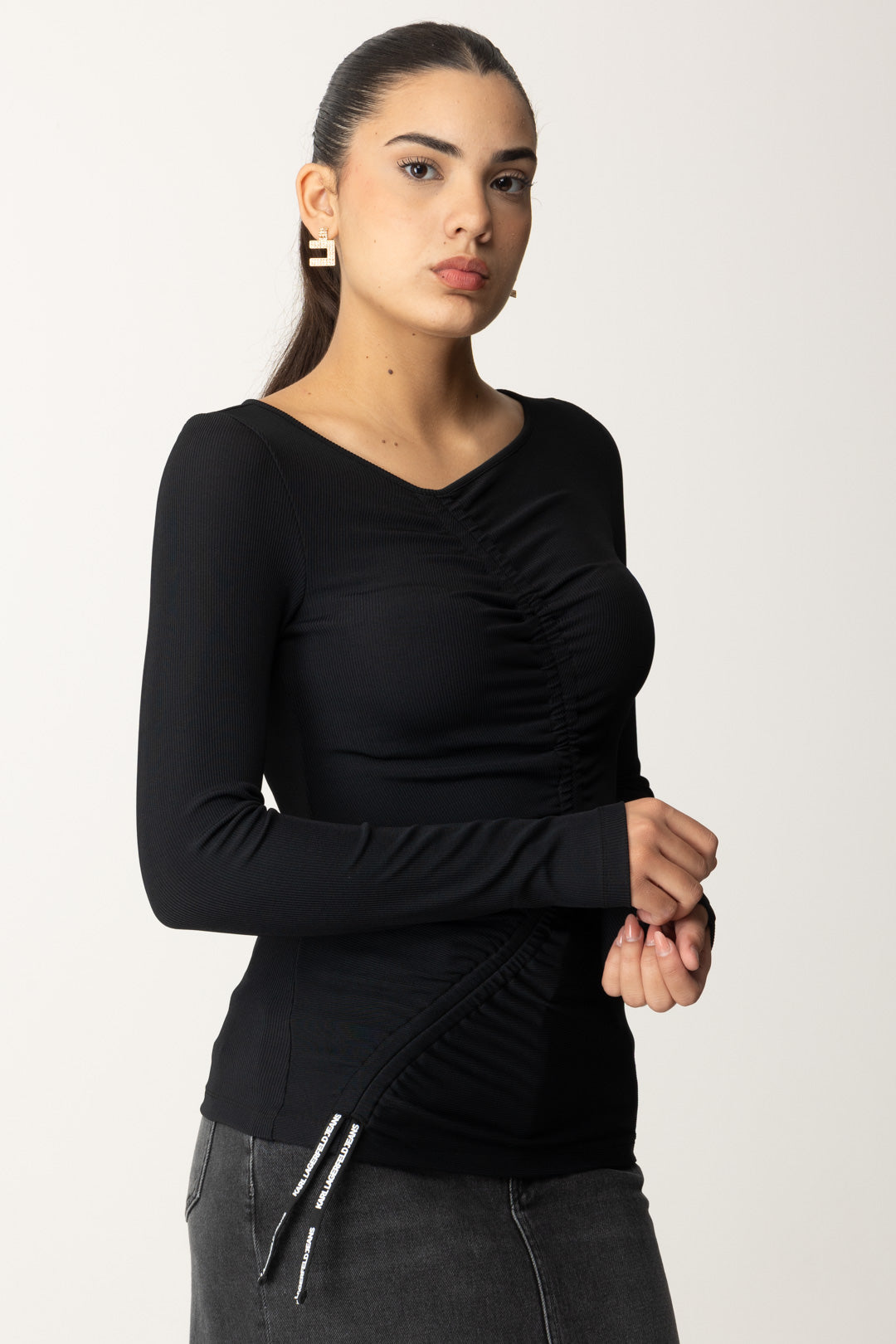 Este top Karl Lagerfeld será tu nueva prenda imprescindible para looks casual y deportivos. De manga larga y fruncido en la parte delantera, tiene un diseño asimétrico con cordones con logo al final, perfecto para crear un interesante efecto visual. Llévalo con una prenda vaquera para un look deportivo y moderno.