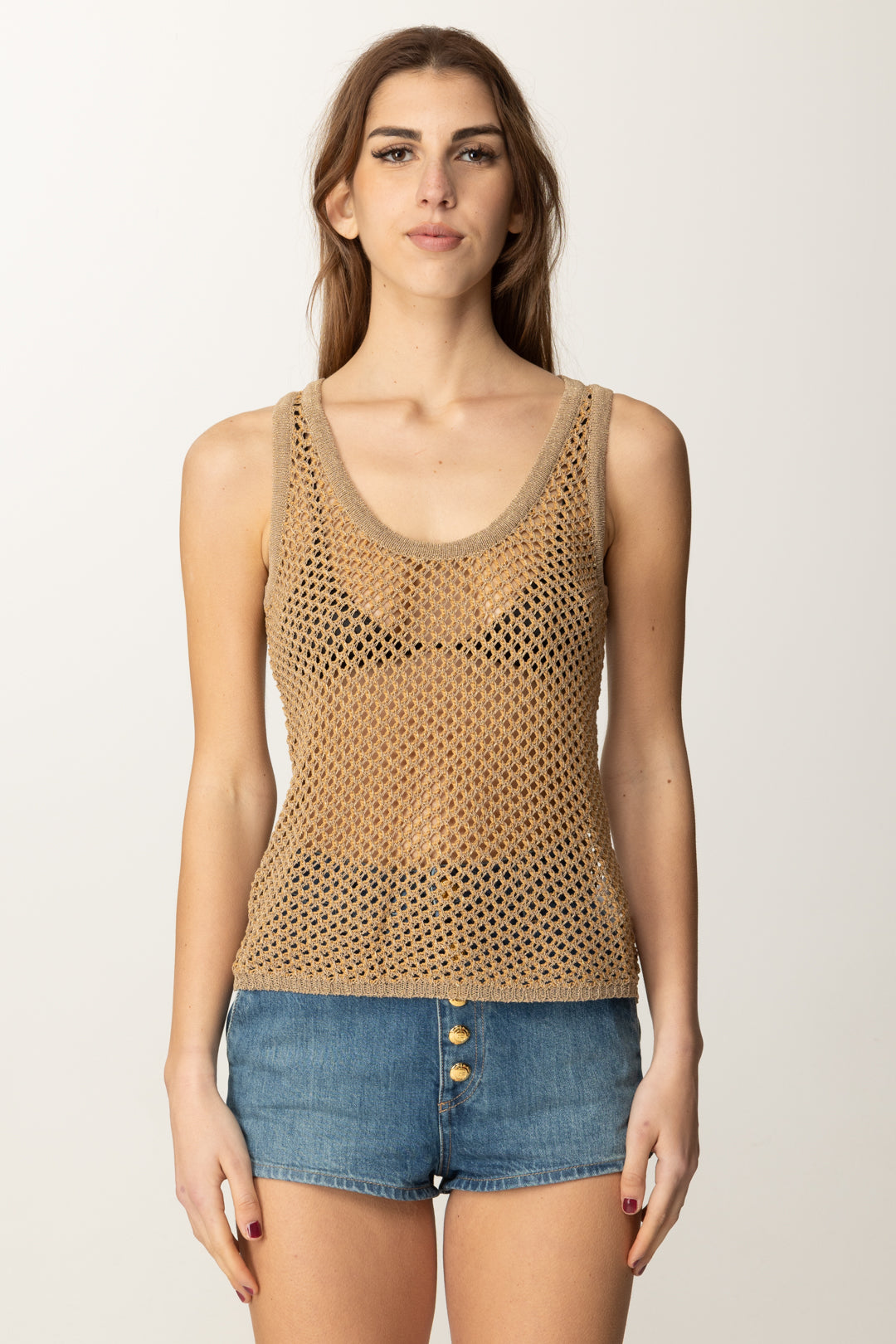 El punto de red con su intrigante efecto transparente es un imprescindible para el verano: así que no te pierdas esta camiseta sin mangas Manila Grace para looks veraniegos frescos y coquetos, que puedes personalizar como quieras jugando con los colores de lo que quieras llevar debajo, pero también combinándolo con el cárdigan de la marca con las mismas características.