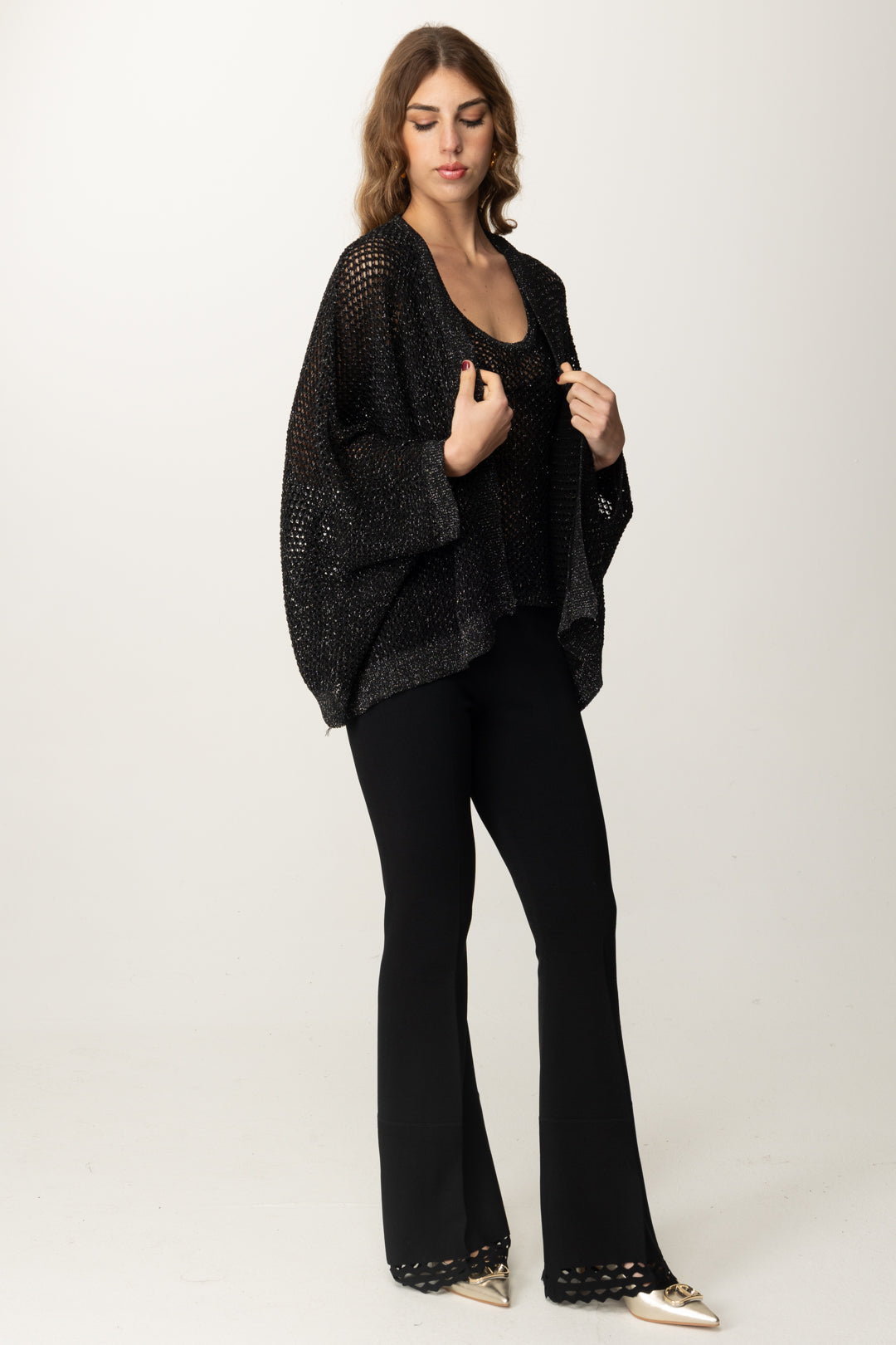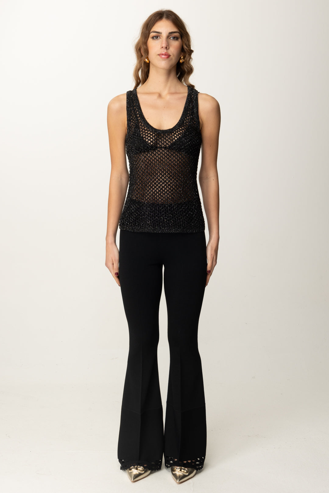 El punto de red con su intrigante efecto transparente es un imprescindible para el verano: así que no te pierdas esta camiseta sin mangas Manila Grace para looks veraniegos frescos y coquetos, que puedes personalizar como quieras jugando con los colores de lo que quieras llevar debajo, pero también combinándolo con el cárdigan de la marca con las mismas características.