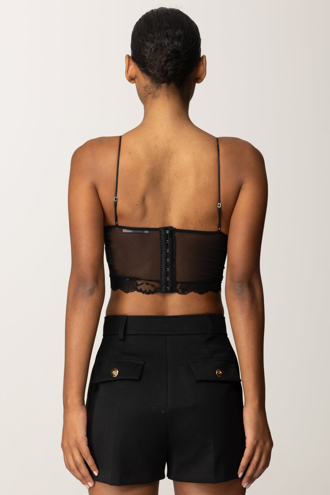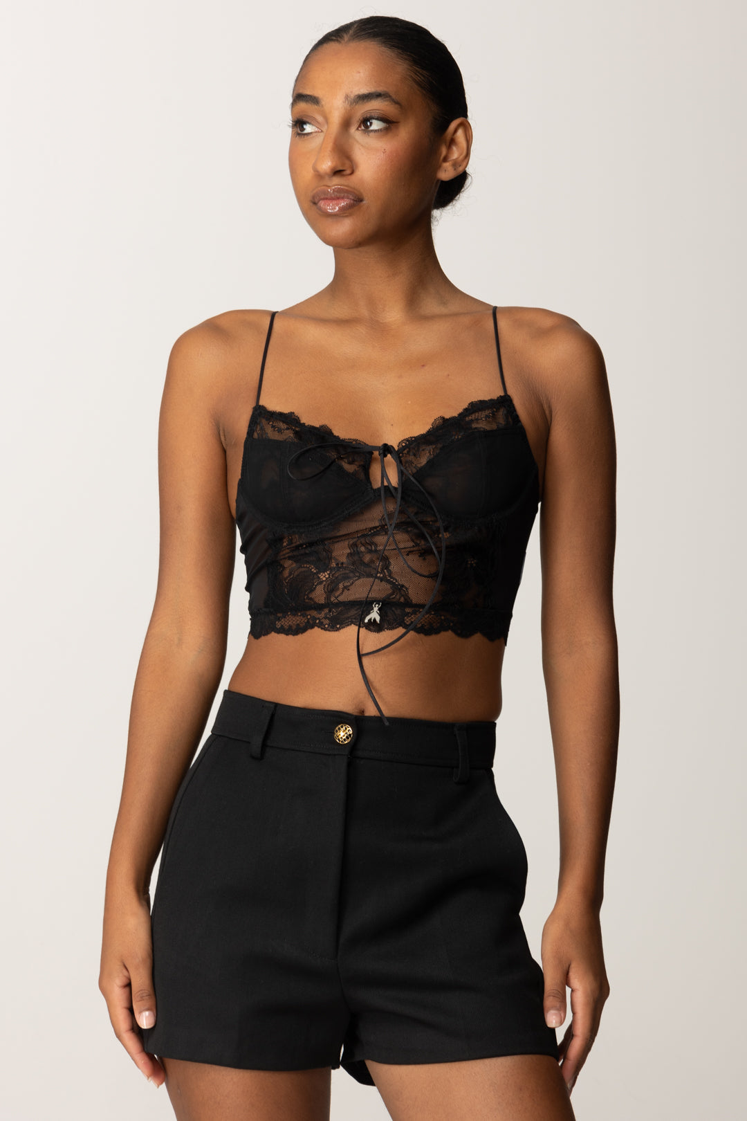Una prenda que coquetea con tu lencería más sensual para darte un resultado hiperfemenino: top Patrizia Pepe realizado en delicado encaje, con copas bien definidas y lazos para atar en la espalda o al cuello para un juego de entrelazados que se dibuja en el pecho. Corte crop con bordes festoneados, los tirantes son muy finos pero ajustables, y el cierre de ganchos en la parte trasera añade una nota de sensualidad que remite aún más al mundo de la ropa interior.