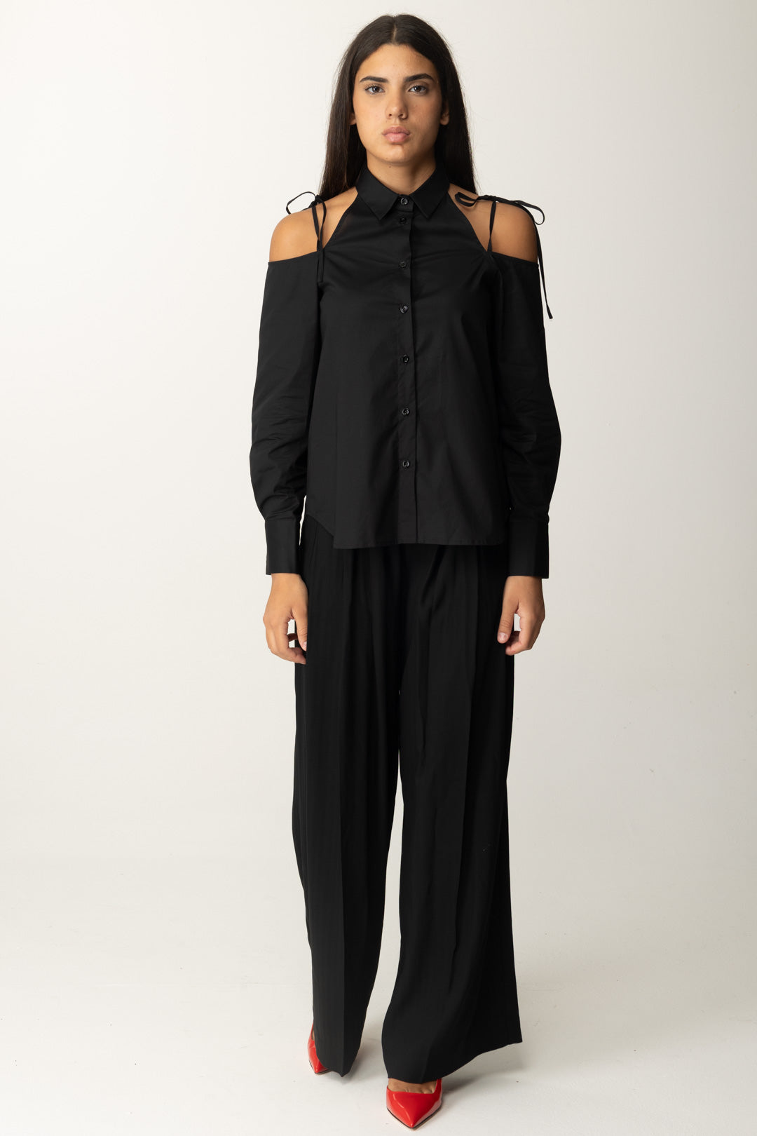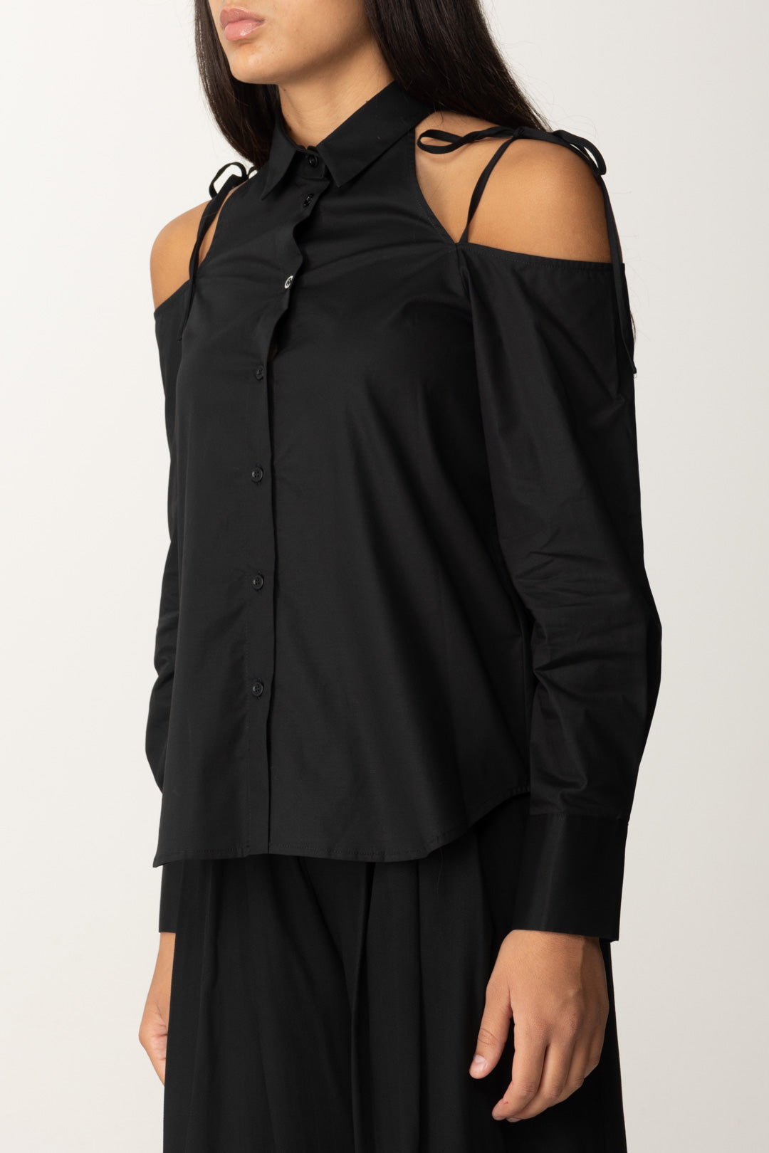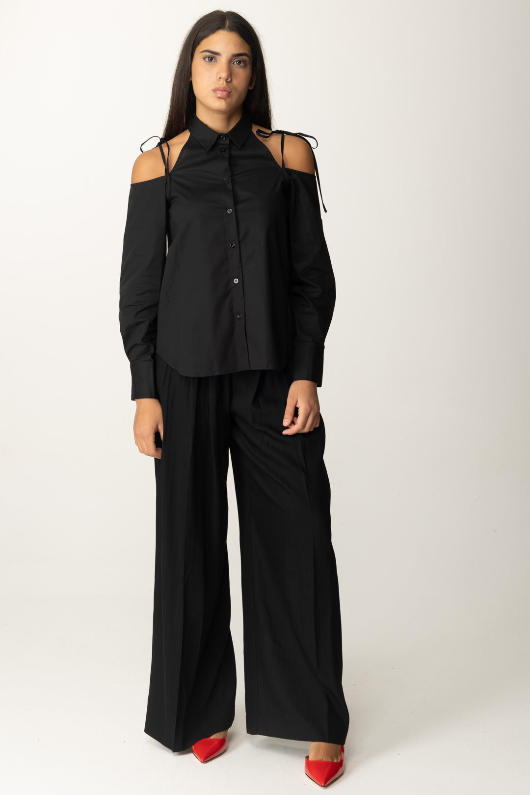 Camisa semi costura refinada y femenina, con un toque original que la diferencia del modelo clásico. La apertura en los hombros con lazos crea un estilo atrevido que combina a la perfección con el resto de la silueta. Ideal para llevar con jeans o pantalones para un look efectivo pero con un toque original.