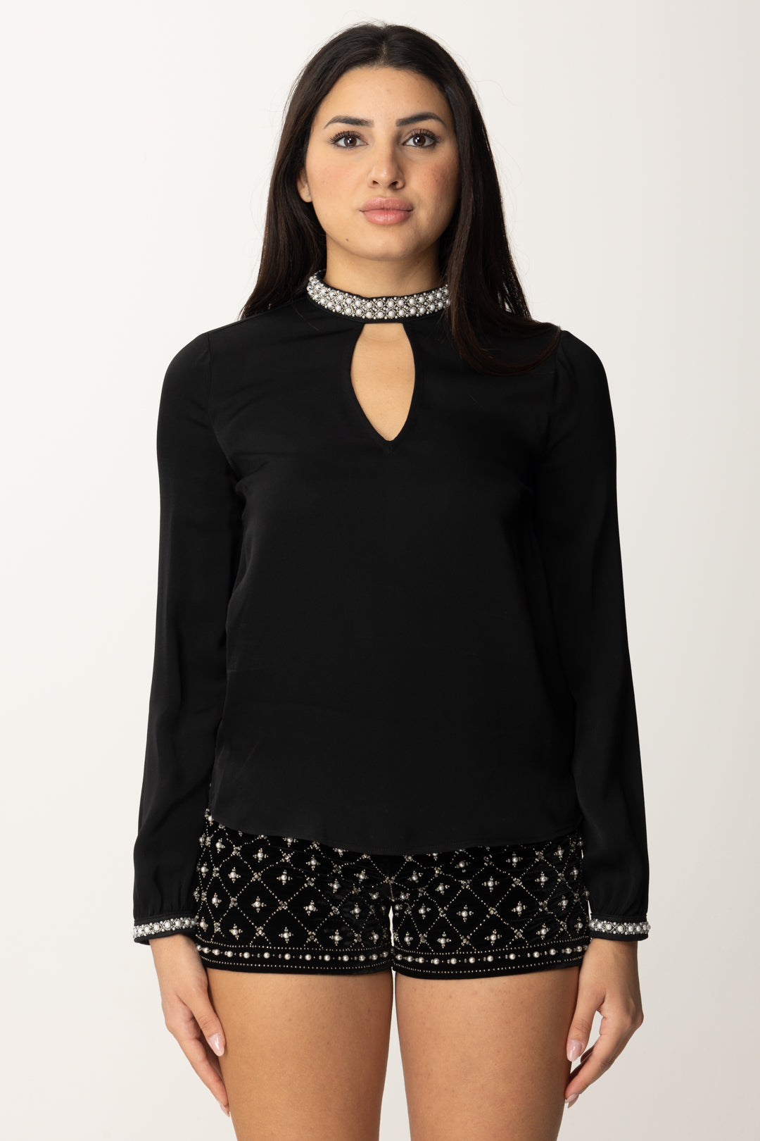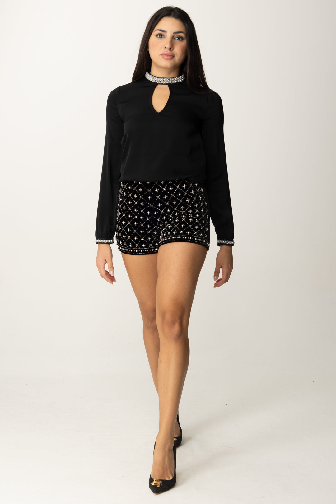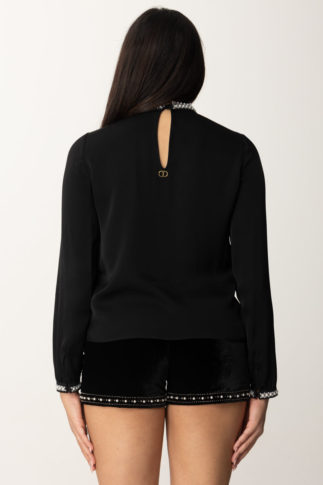 Una blusa Twinset con un encanto refinado y elegante. Presenta un diseño con cuello alto adornado con abalorios y pedrería, escote en forma de cerradura y manga larga que refleja el mismo detalle de brillo que el cuello. Un charm glamuroso para llevar por la mañana y por la noche, con vaqueros o pantalones elegantes.