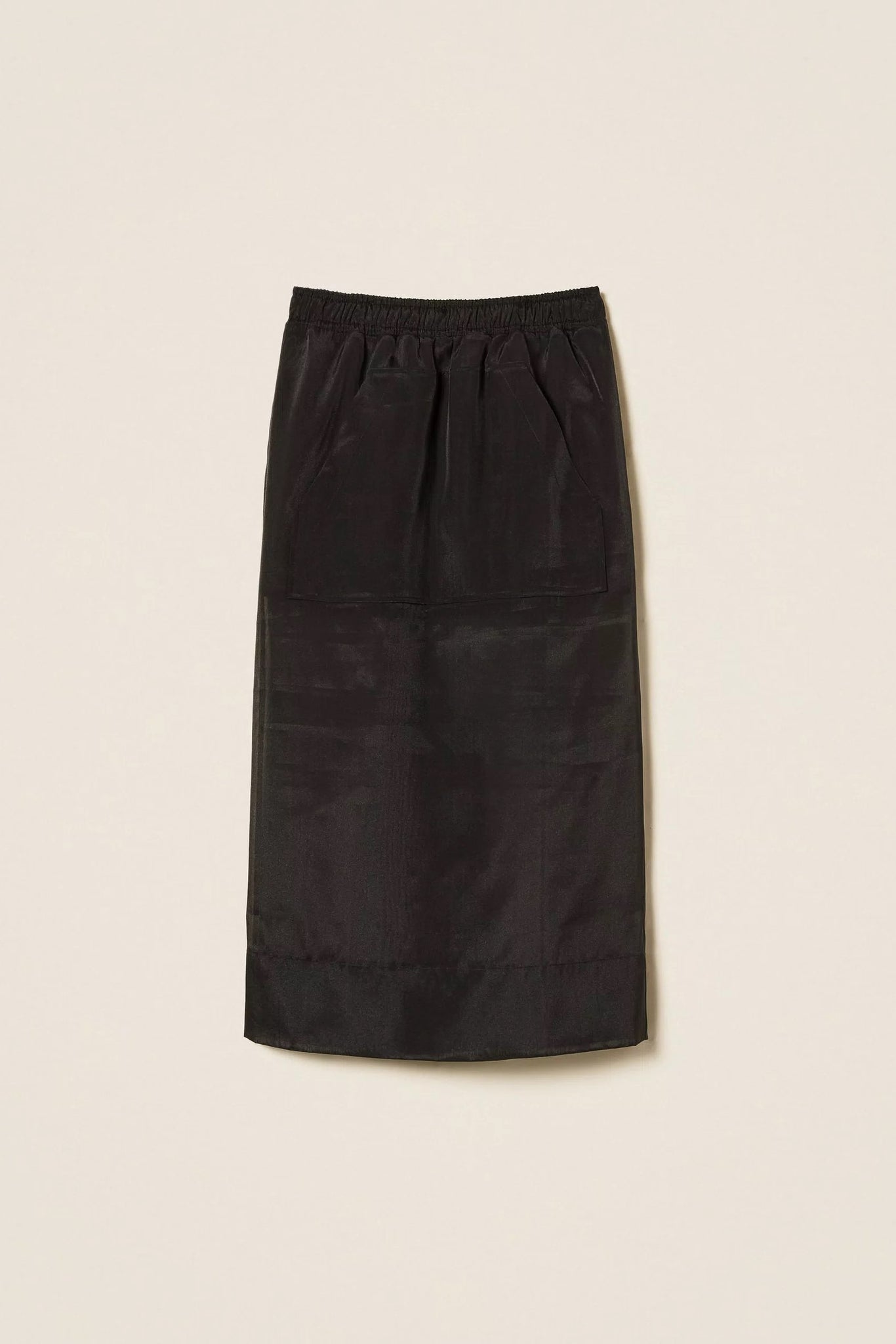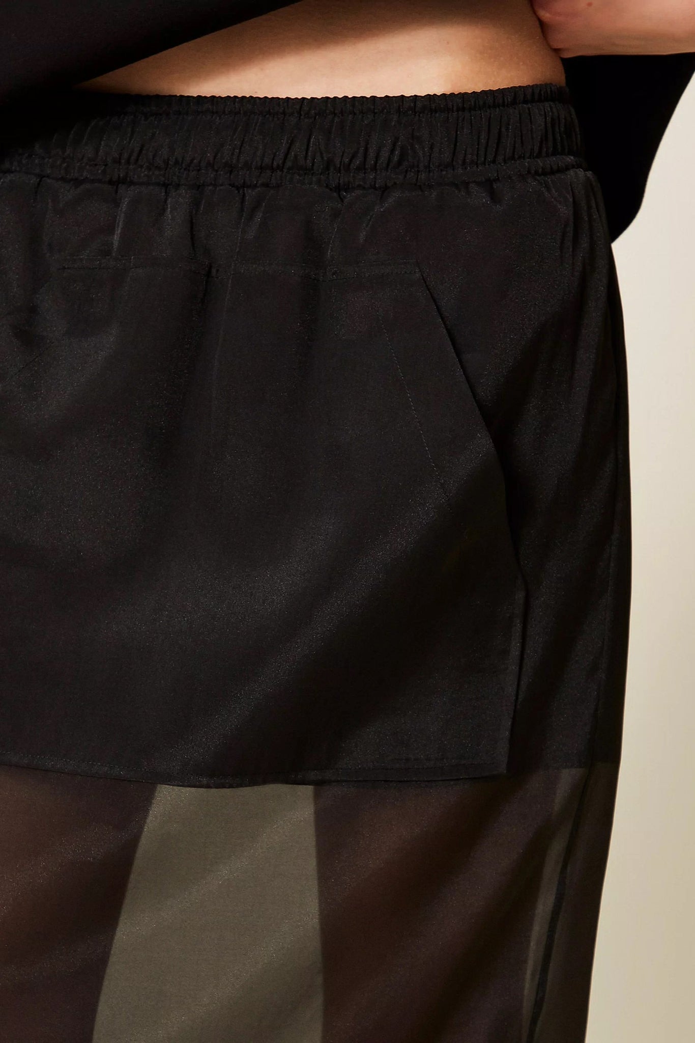 Un mood urban chic para esta gonna Twinset realizada en organza transparente con forro a juego y detalles deportivos, como la cintura elástica y el gran bolsillo frontal que revolucionan la esencia de esta prenda. Corte recto y largo hasta el tobillo, la parte trasera está abierta con una abertura para facilitar los movimientos, perfecta para pasear.