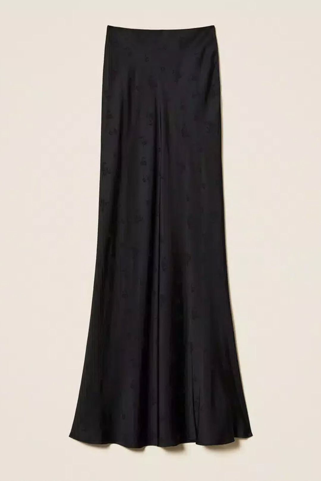 La gonna Twinset de raso de viscosa jacquard es una prenda que combina romanticismo y sofisticación en un diseño atemporal. El tejido brillante, cortado al bies para realzar el movimiento natural de la silueta, se desliza suavemente a lo largo de la figura creando un efecto fluido y sensual. El diseño floral jacquard, discreto pero sofisticado, embellece la superficie con una textura luminosa que captura la luz en cada paso.