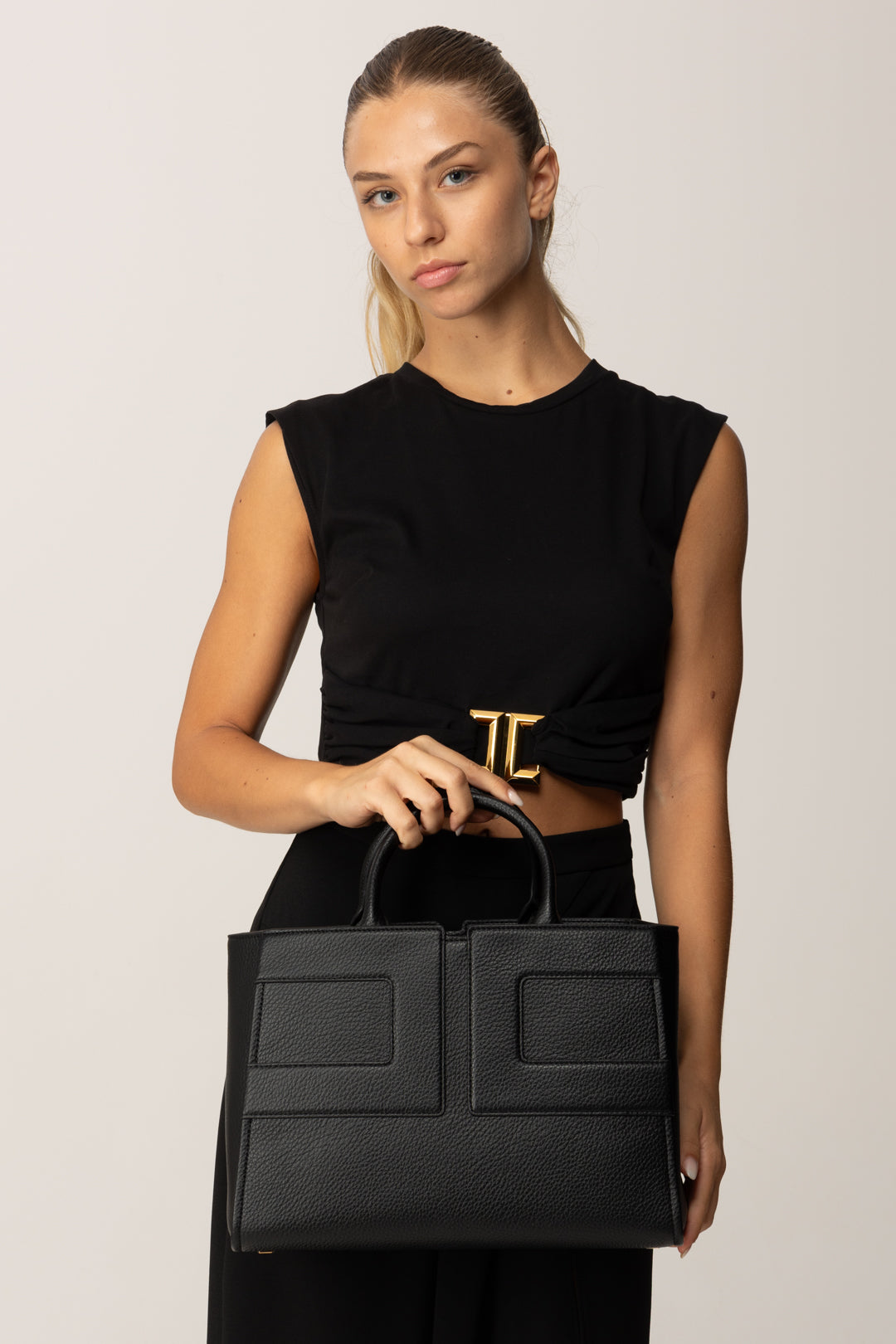 Spacieuse, sophistiquée et structurée : ce borsa Elisabetta Franchi est conçu pour vous accompagner à chaque moment de la journée avec élégance et praticité. Le design rigide et architectural est rythmé par un logo géométrique décoratif qui valorise la silhouette carrée, tandis que le revêtement effet cuir apporte profondeur et une texture agréable au toucher. La double poignée rigide et l’ouverture supérieure zippée la rendent parfaite à porter à la main, mais aussi à poser sur le bureau avec décontraction. À l’intérieur, la doublure en coton accueille tout le nécessaire avec ordre et goût : documents, ordinateur portable, portefeuille et trousse de beauté trouvent leur place, accompagnés d’une pochette coordonnée pratique. Ce grand tote est le choix idéal pour un usage quotidien, surtout si vous aimez un style formel mais distinctif. Associez-le à un blazer oversize, des manteaux sur mesure ou des robes fourreau minimalistes pour un style métropolitain, ou utilisez-le pour compléter une tenue avec jean, chemise blanche et mocassins : il ajoutera toujours une touche recherchée.