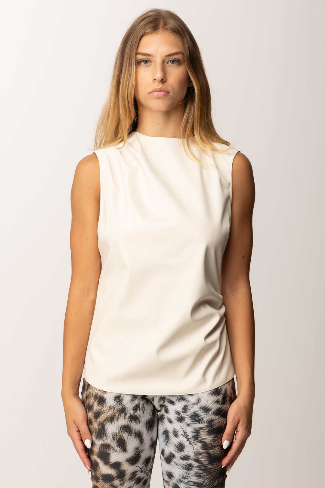 Beaucoup de choses à dire sur ce top Aniye By, super polyvalent et particulier dans le choix du revêtement en tissu synthétique effet cuir, qui sera la clé de nombreux de tes looks. Encolure ronde et design sans manches avec drapés à partir de l'épaule qui ajoutent de la douceur à l'ensemble, l'intérieur est doublé de manière confortable, pour le rendre tout de même agréable et chaud à porter.