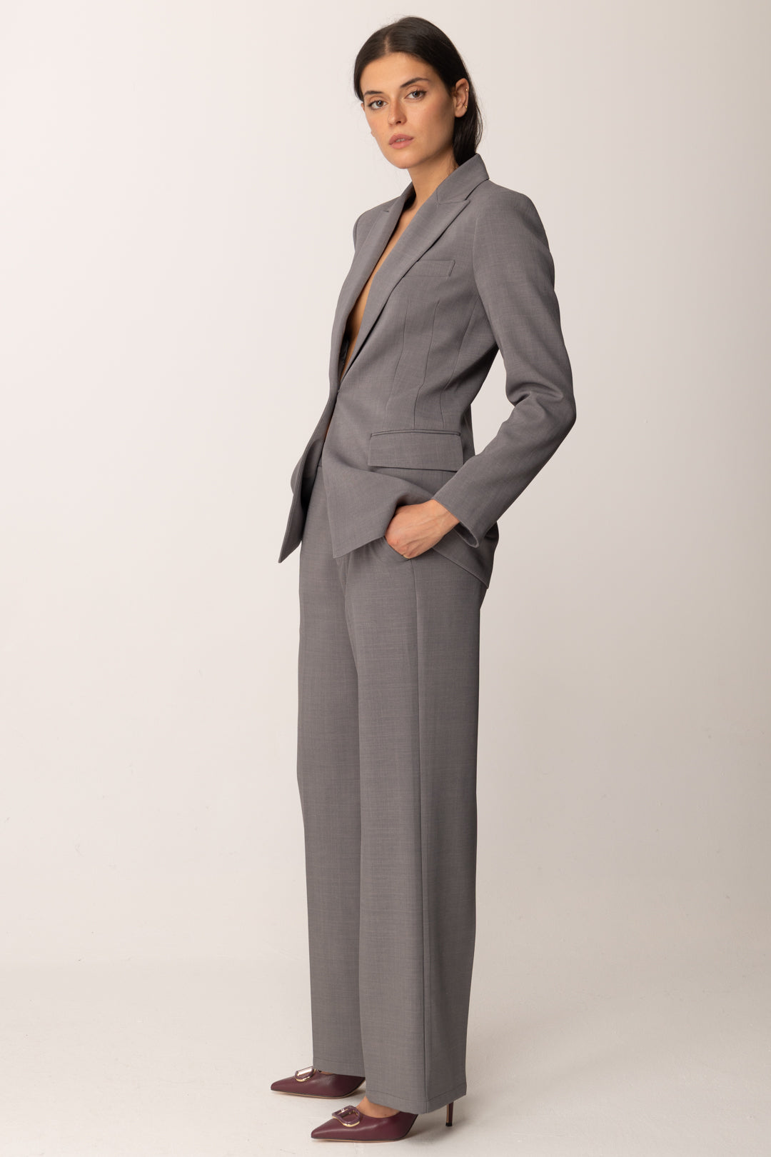 La palette neutre et lumineuse se révèle extrêmement polyvalente : parfaits avec la veste slim coordonnée pour un power suit à l'élégance contemporaine, ces pantalons fonctionnent aussi avec des blouses fluides ou des pulls légers pour des tenues de jour plus faciles à porter. Du travail au dîner, ils seront toujours un choix raffiné.