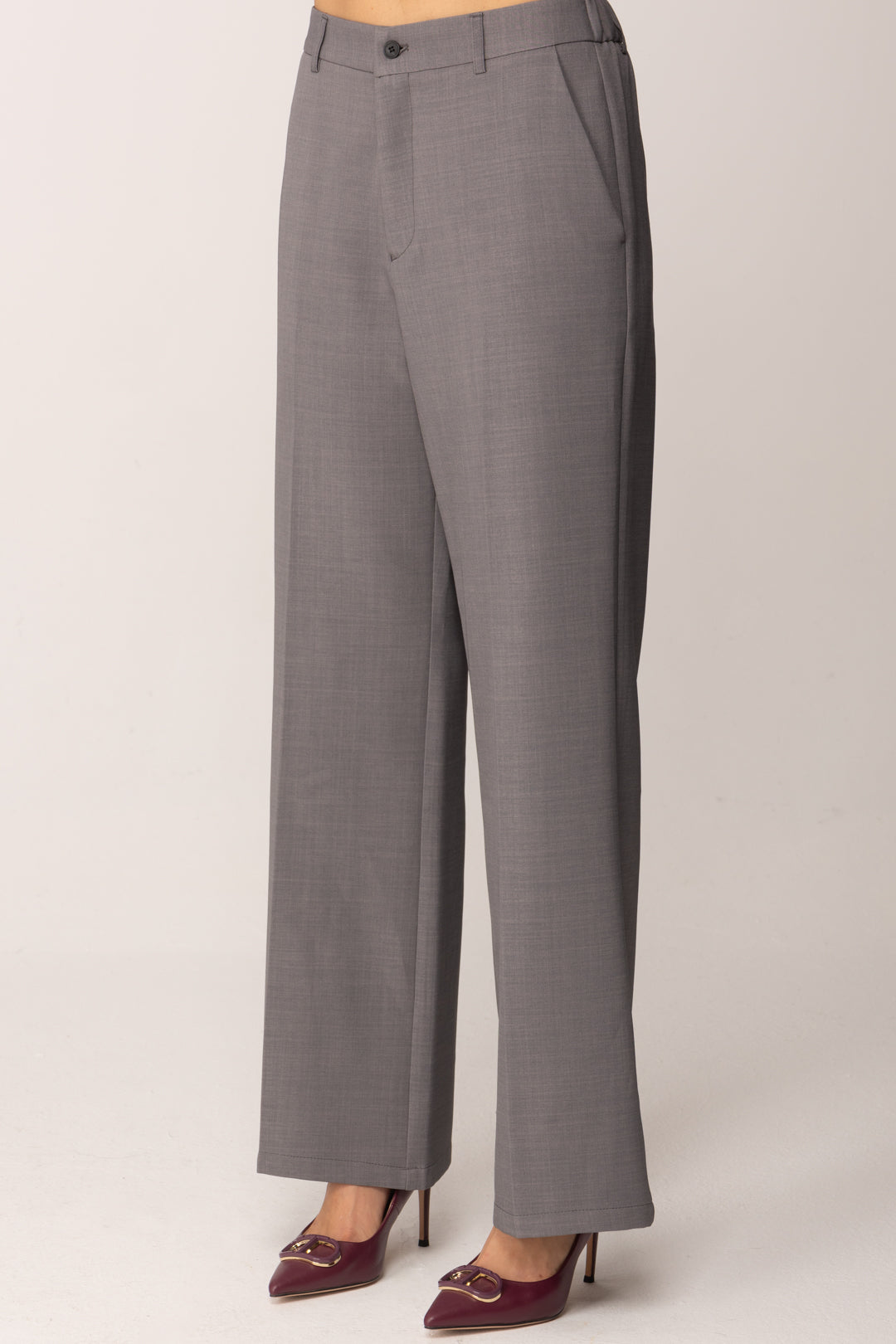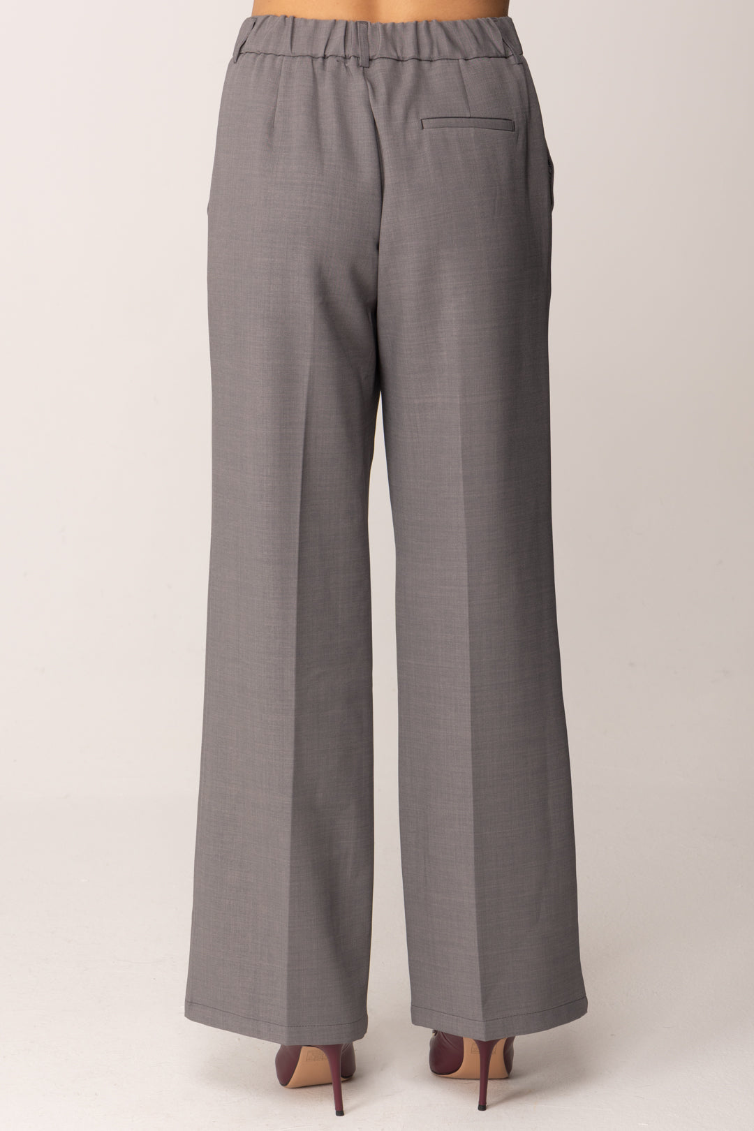 La construction de la taille est conçue pour offrir un équilibre : à l'avant, la ligne reste élégante et lisse, à l'arrière l'élastique garantit confort et liberté de mouvement, suivant les formes sans les contraindre. Les poches latérales ajoutent de la praticité, tandis que la poche arrière passepoilée maintient l'esthétique tailleur du vêtement.