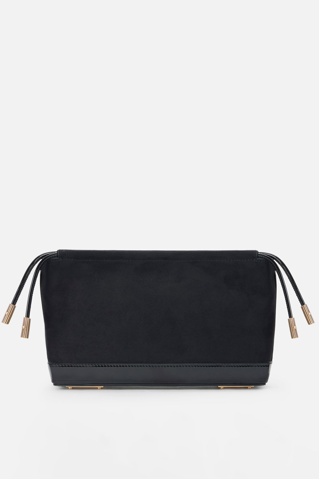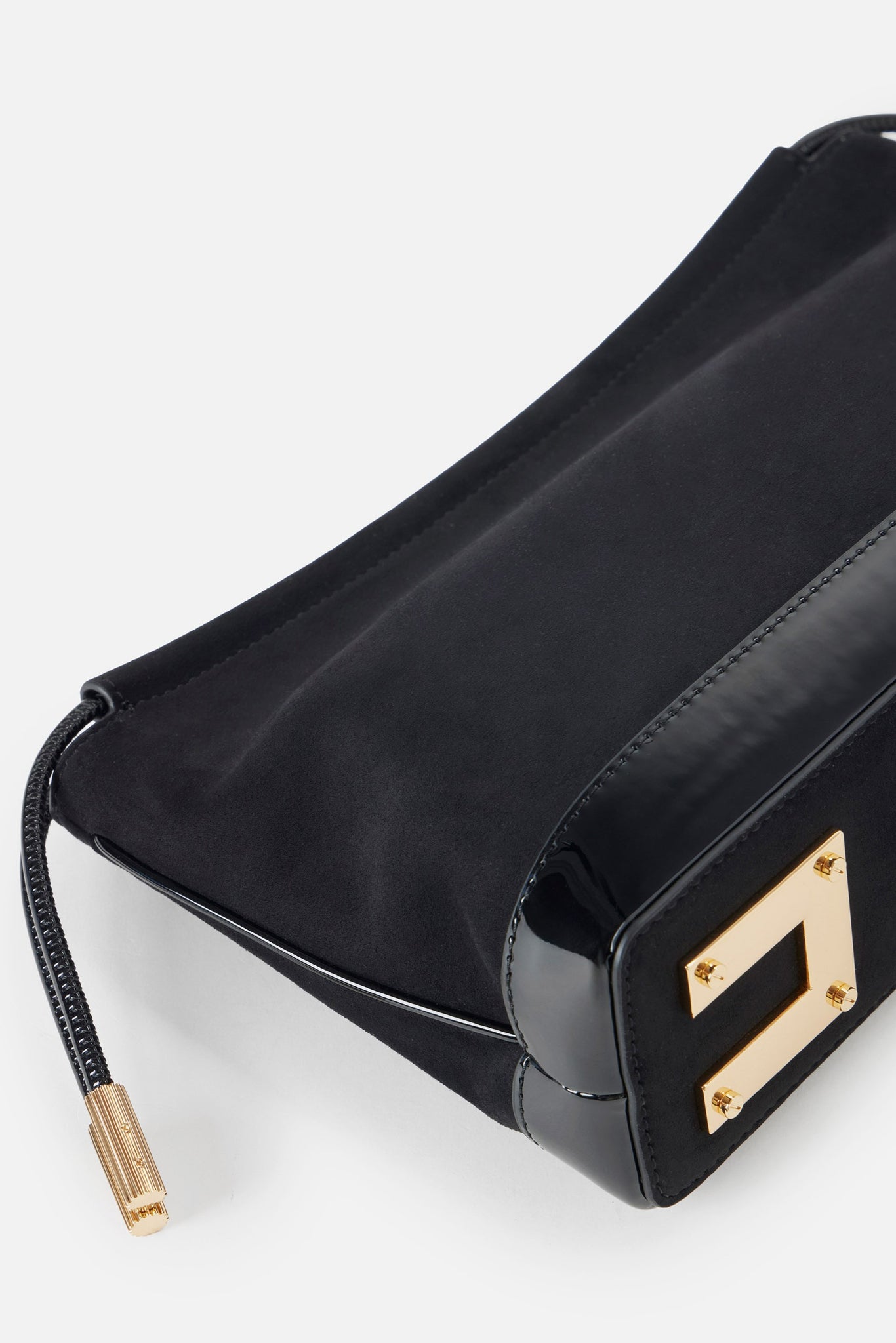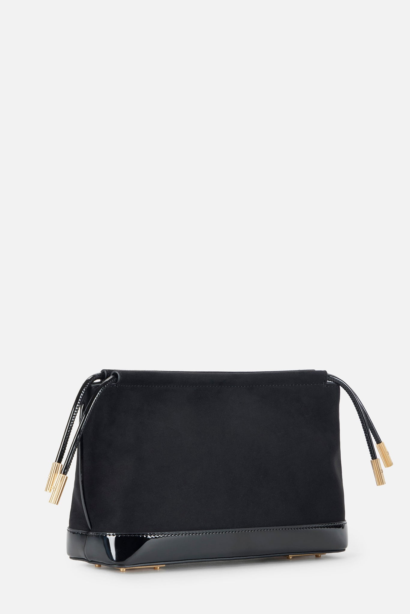 Un accessoire petit et indispensable : vous pouvez le glisser dans vos maxi sacs de jour et emporter votre pochette en cas de besoin, ainsi que le porter comme pouch bag pour le soir ou pour un événement important. Vous souhaitez mettre en valeur son mélange de matériaux ? Associez-la à des tissus mats, comme la laine ou le crêpe, pour faire ressortir à la fois le vernis et le suède.
