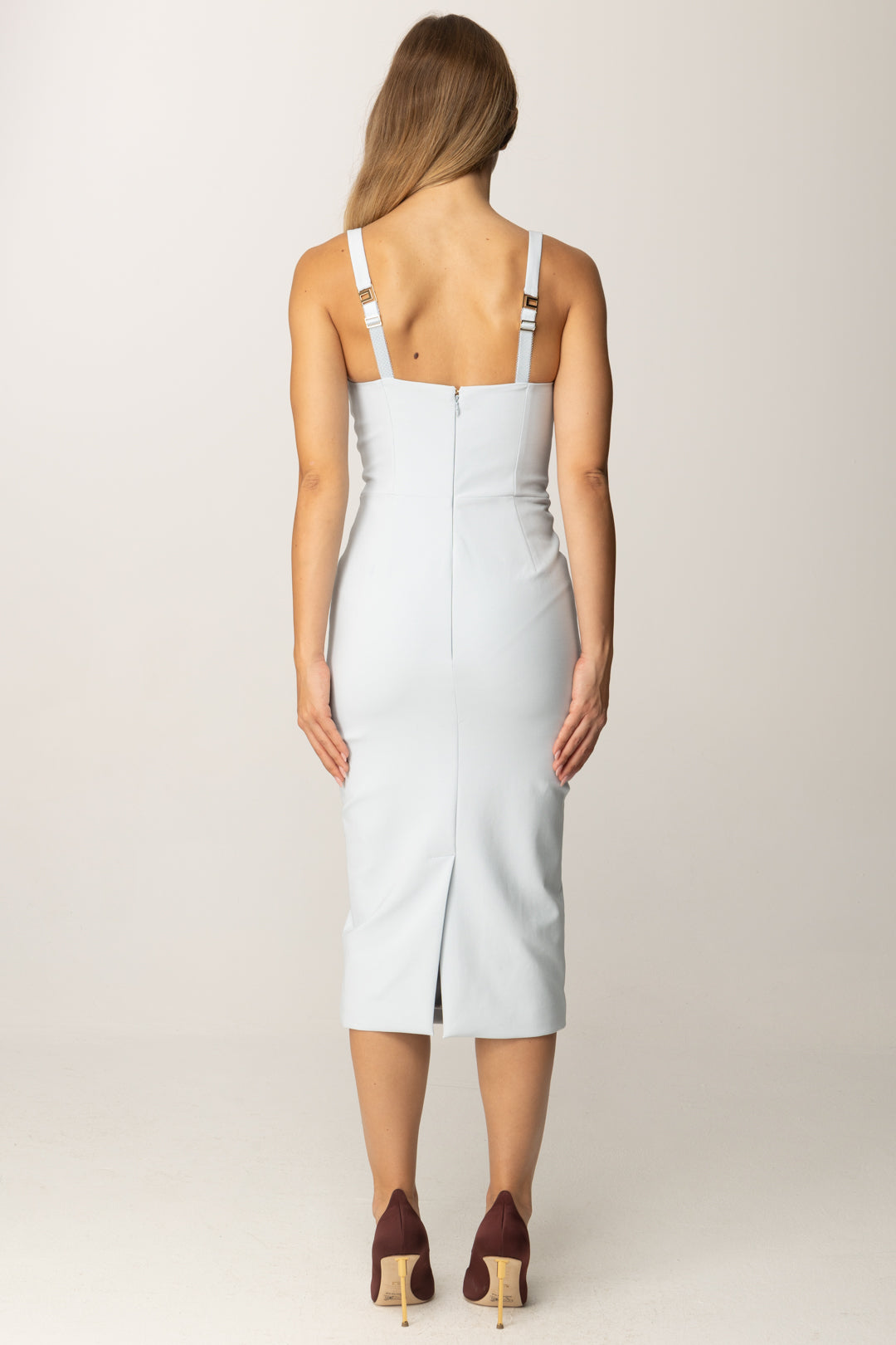 Une robe Elisabetta Franchi qui célèbre l'équilibre entre structure et sensualité en revisitant une pièce iconique de la marque : réalisée en tissu bi-extensible, elle enveloppe la silhouette avec une coupe slim fit, valorisée par des bretelles réglables garantissant un ajustement parfait. Le détail distinctif ? Les découpes sur le buste ornées de lacets croisés ton sur ton, illuminés par des boutons dorés avec logo - un élément qui capte l'attention avec grâce. La gonna longue jusqu'au mollet, enrichie d'une fente arrière, ajoute un mouvement fluide et une note résolue de féminité.