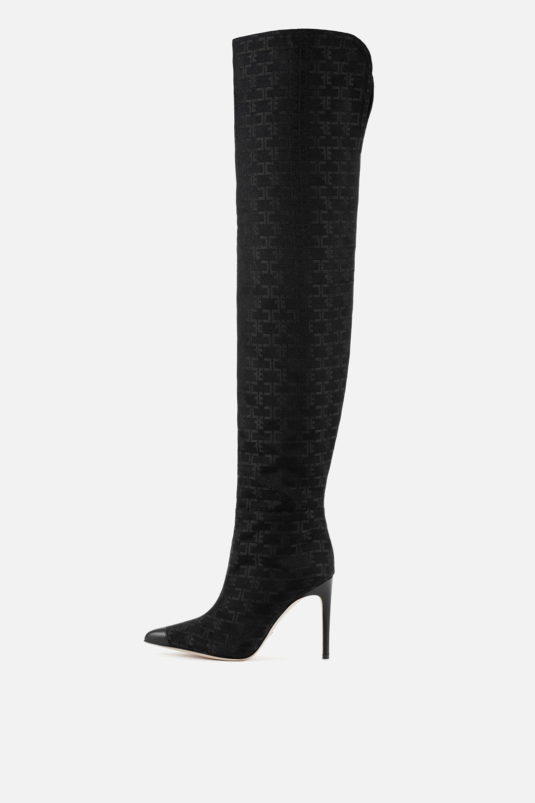 Questi stivali Elisabetta Franchi reinterpretano il concetto di cuissardes in chiave moderna, audace e impeccabilmente femminile. La tela monogram, protagonista assoluta del design, avvolge la gamba con un effetto grafico deciso e riconoscibile, trasformando ogni passo in un’affermazione di stile. La silhouette affusolata, slanciata e scenografica rende questo modello un vero statement piece per chi desidera un accessorio capace di cambiare l’impatto dell’intero outfit.