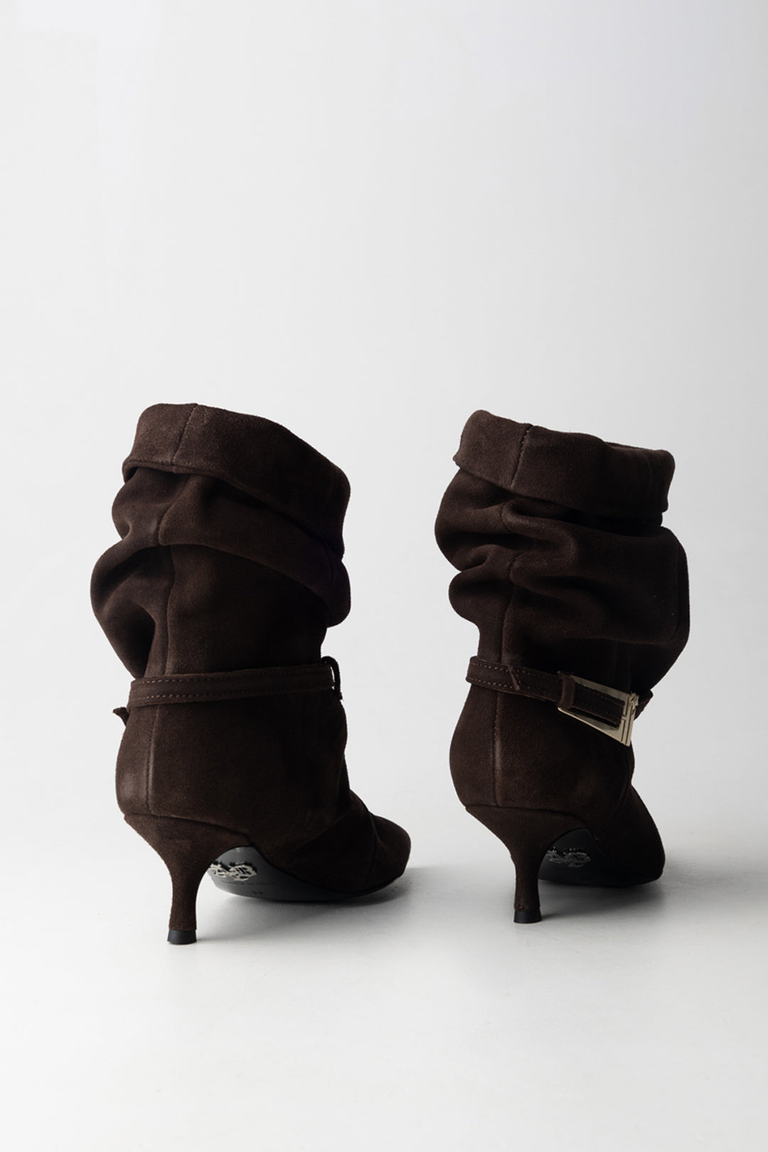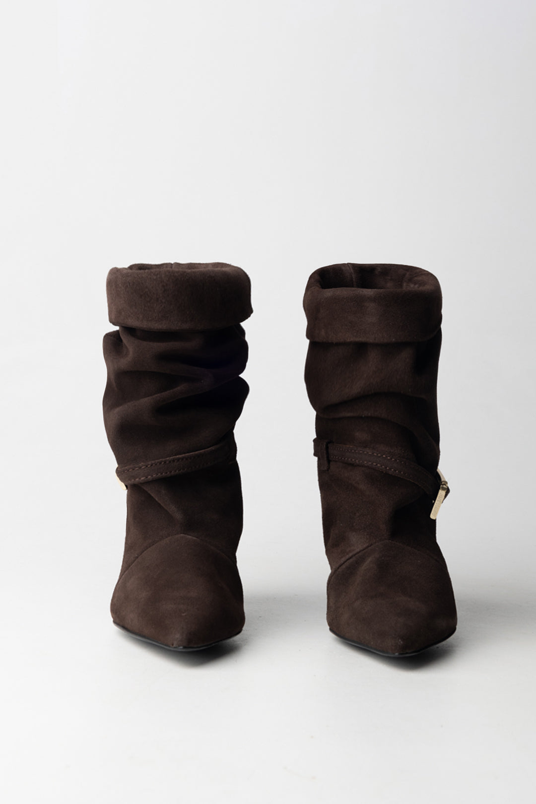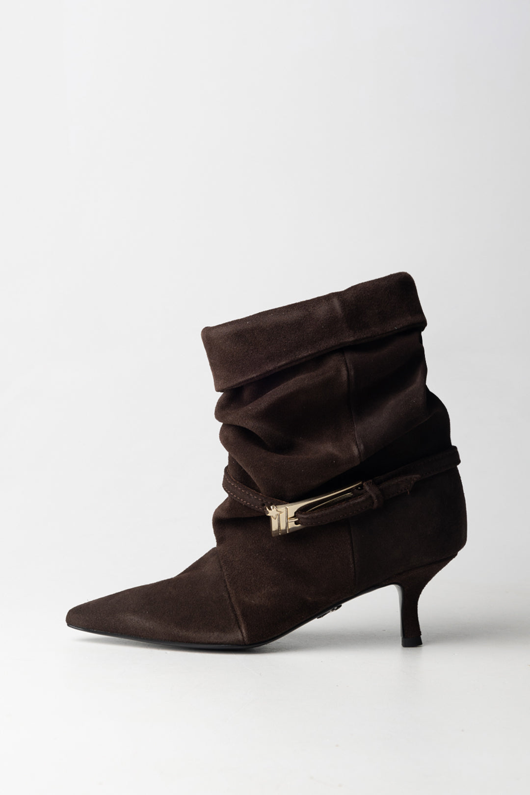 Une touche contemporaine pour un grand classique de la garde-robe. Les stivaletti Aniye By en suede marron foncé combinent silhouette rétro et détails modernes, parfaits pour compléter vos tenues de saison. La ligne à bout pointu rencontre le charme de la tige souple et froncée, tandis que la bride latérale avec boucle métallique dorée ajoute un détail qui capte la lumière avec discrétion.