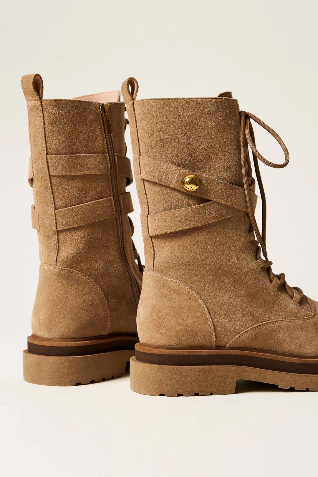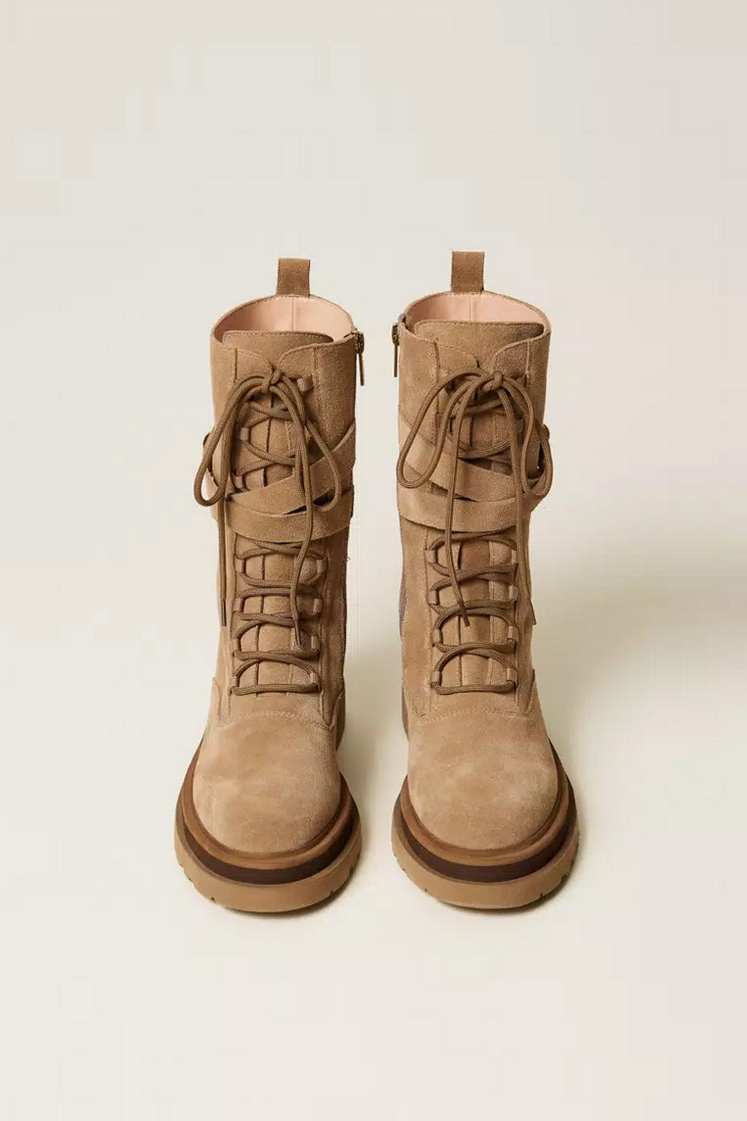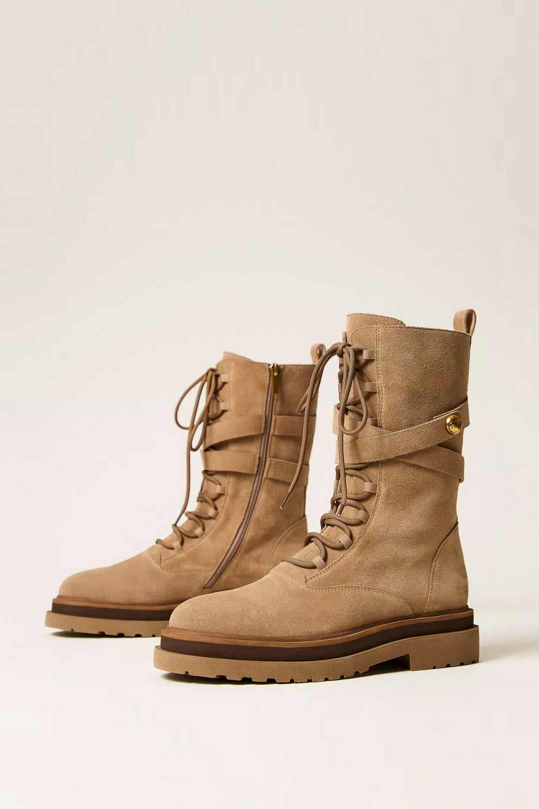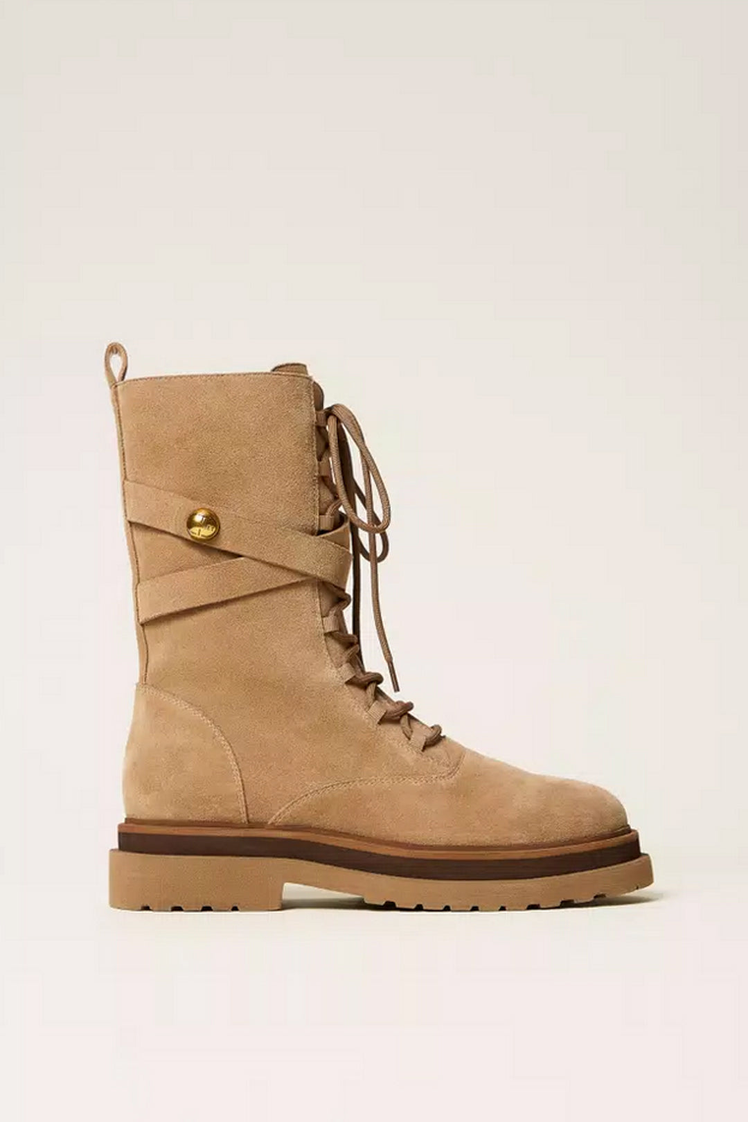 Ces anfibi Twinset changent l'ambiance typique du modèle, combinant au confort quotidien une réalisation inédite en cuir suédé doux. Design élégant, avec bout arrondi, une bride croisée avec bouton-pression logoté Oval T vient se superposer à la fermeture frontale, ajoutant un élément de style ainsi que la signature de la marque de manière très discrète.