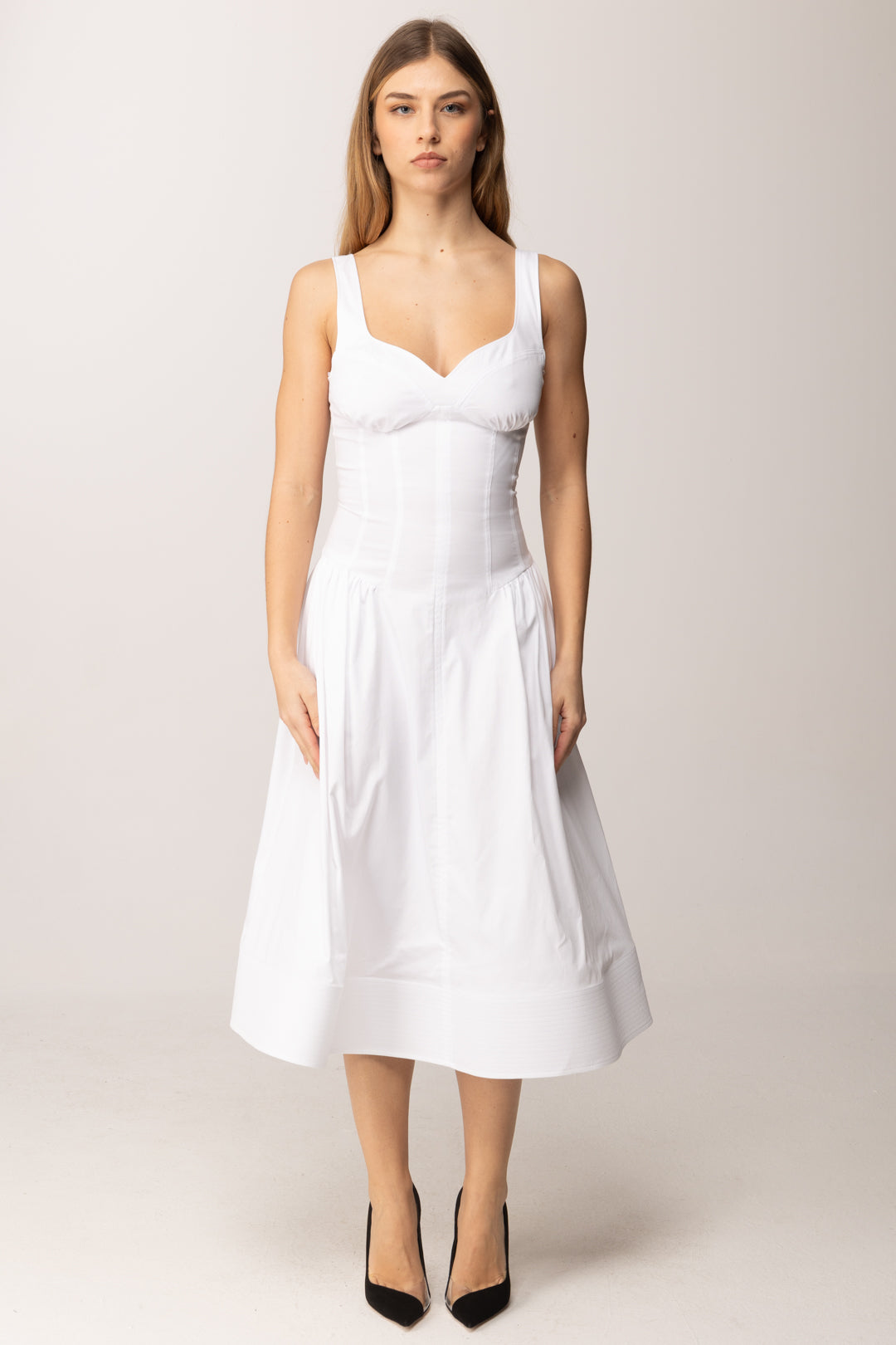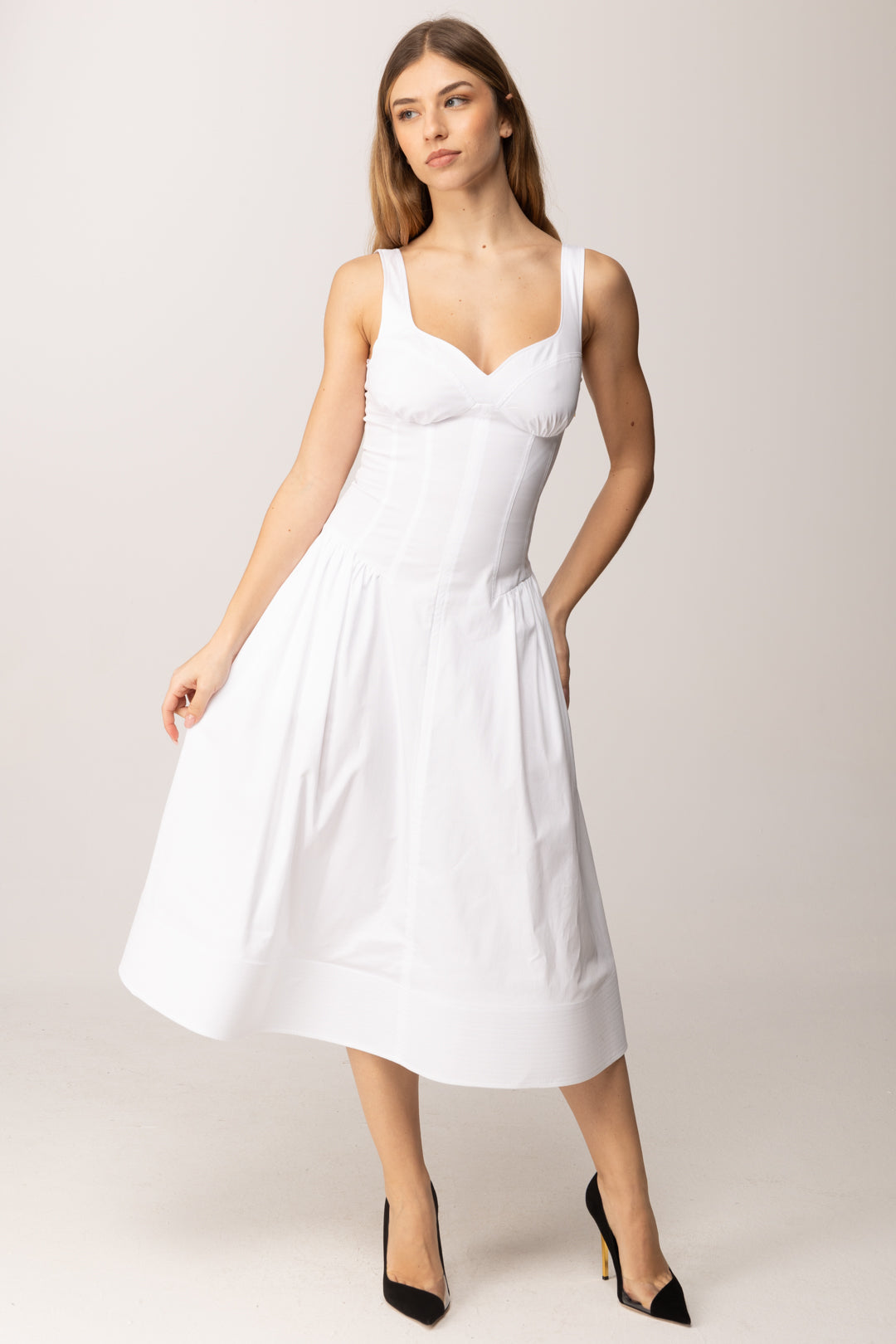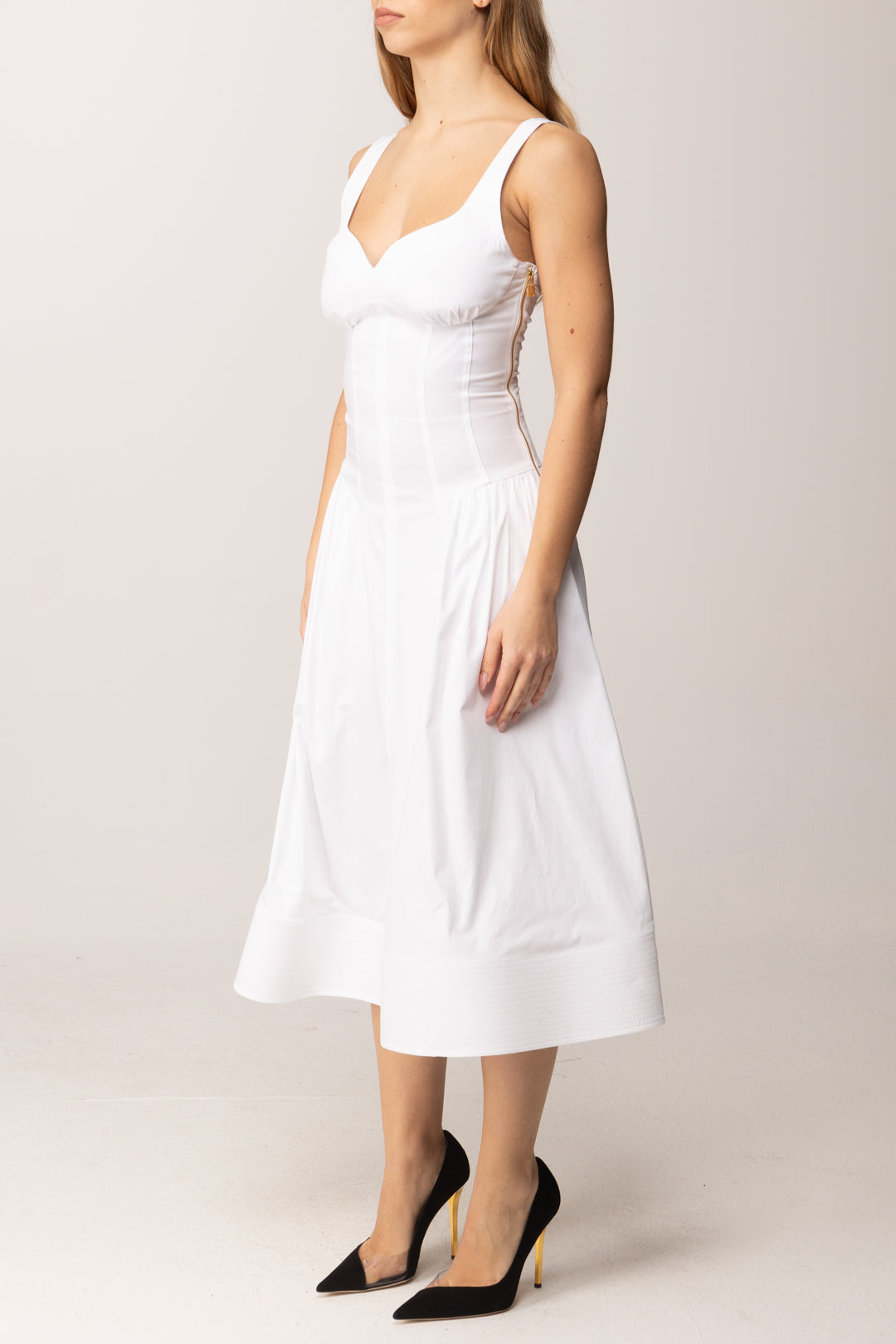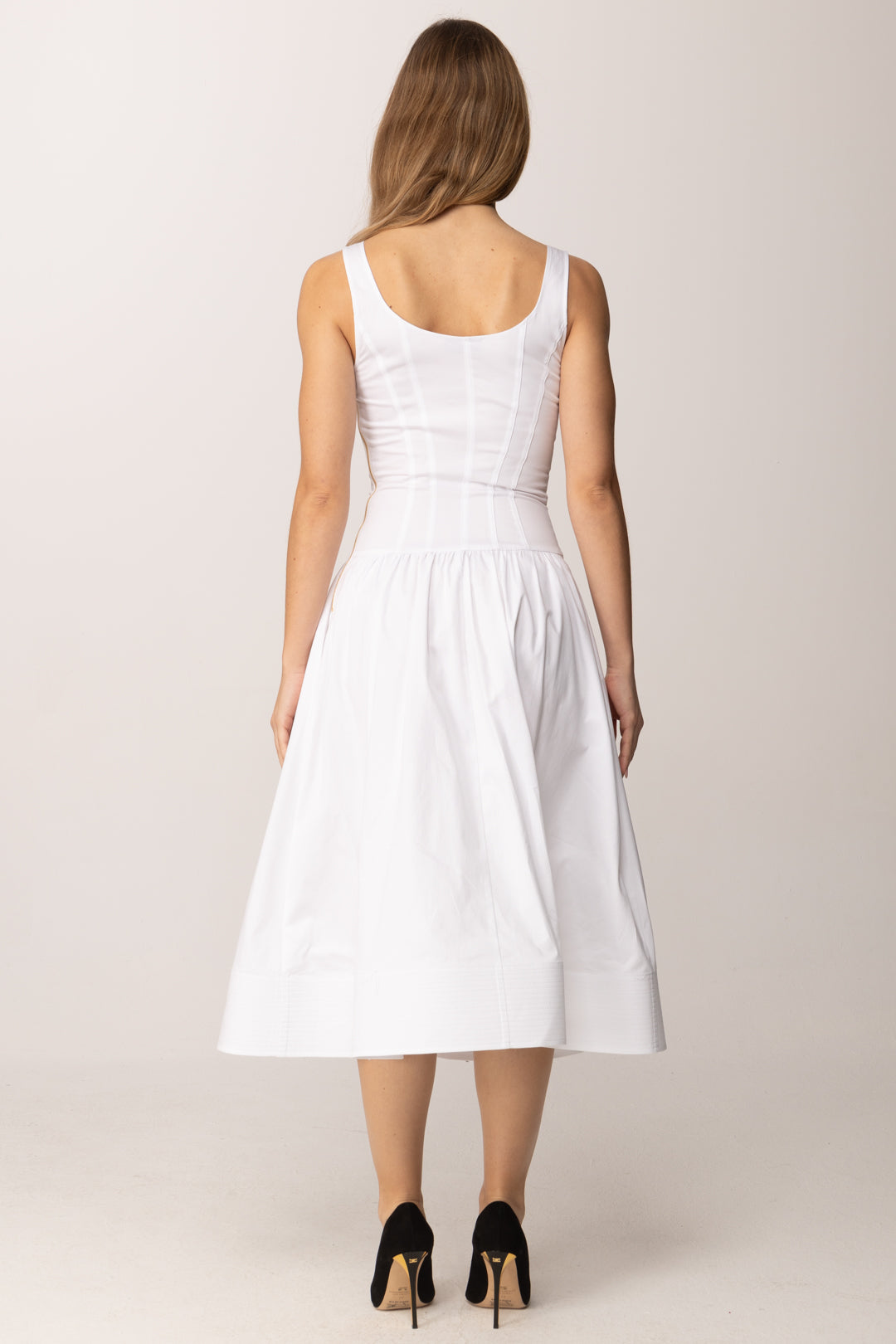 Freschezza sartoriale e silhouette scultorea si incontrano in questo abito Elisabetta Franchi realizzato in cotone stretch, che segue e valorizza le linee del busto strutturandosi come un corsetto – coppe con arricciature, cuciture a mo’ di bustier – per poi aprirsi nella gonna ampia e svasata. La gonna, arricchita da una crinolina interna che ne amplifica il volume, scivola con grazia dal punto vita creando un gioco di proporzioni che cattura lo sguardo ad ogni passo. Perfetto per chi desidera un abito che sia al contempo capo di carattere e versatile, questa creazione si presta con naturalezza tanto agli appuntamenti diurni quanto alle serate in cui vuoi essere impeccabile ma senza eccessi.