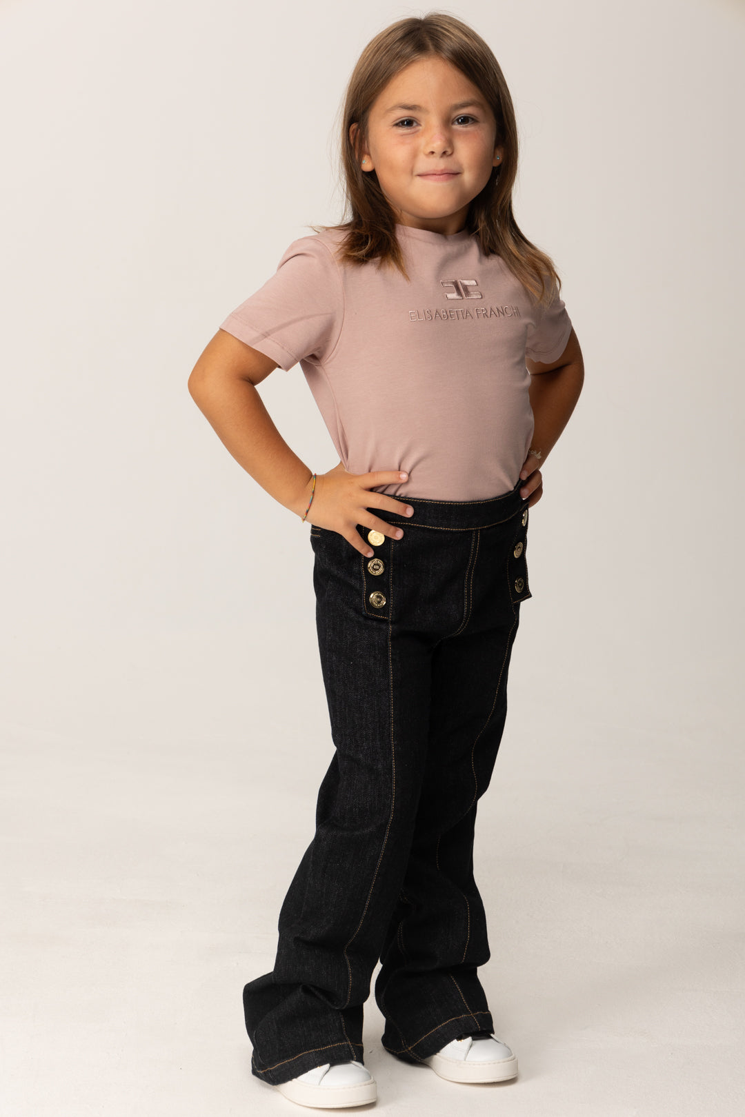 Lignes rétro et détails modernes se rencontrent dans cette proposition baby de jeans Elisabetta Franchi La mia Bambina en denim lavage foncé. La silhouette évasée avec coutures apparentes et la patte de boutonnage décorative à l'avant rappellent le charme des modèles marinière, revisités de manière contemporaine. La taille élastiquée à l'arrière garantit confort et un ajustement parfait.