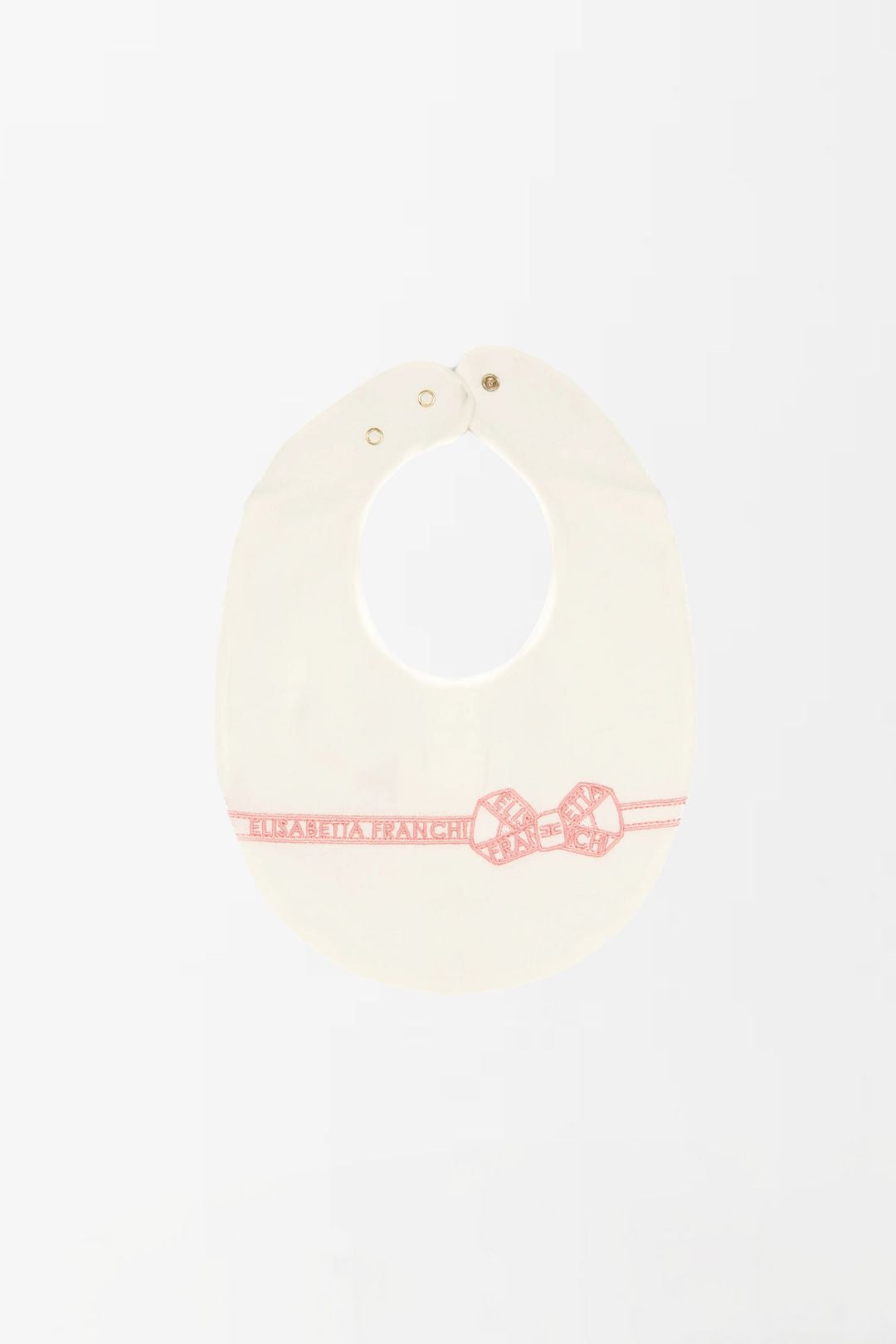Questa bavetta Elisabetta Franchi La mia Bambina è un accessorio pensato per unire praticità quotidiana e dettagli curati, ideale per accompagnare i pasti con dolcezza e stile. Realizzata in jersey, morbido sulla pelle delicata dei più piccoli, garantisce comfort e protezione con una sensazione piacevole e leggera. La base neutra si arricchisce di un motivo a fiocco ricamato, che aggiunge un tocco di carattere giocoso e tenero, e diventa anche il punto in cui si inserisce la firma del brand.