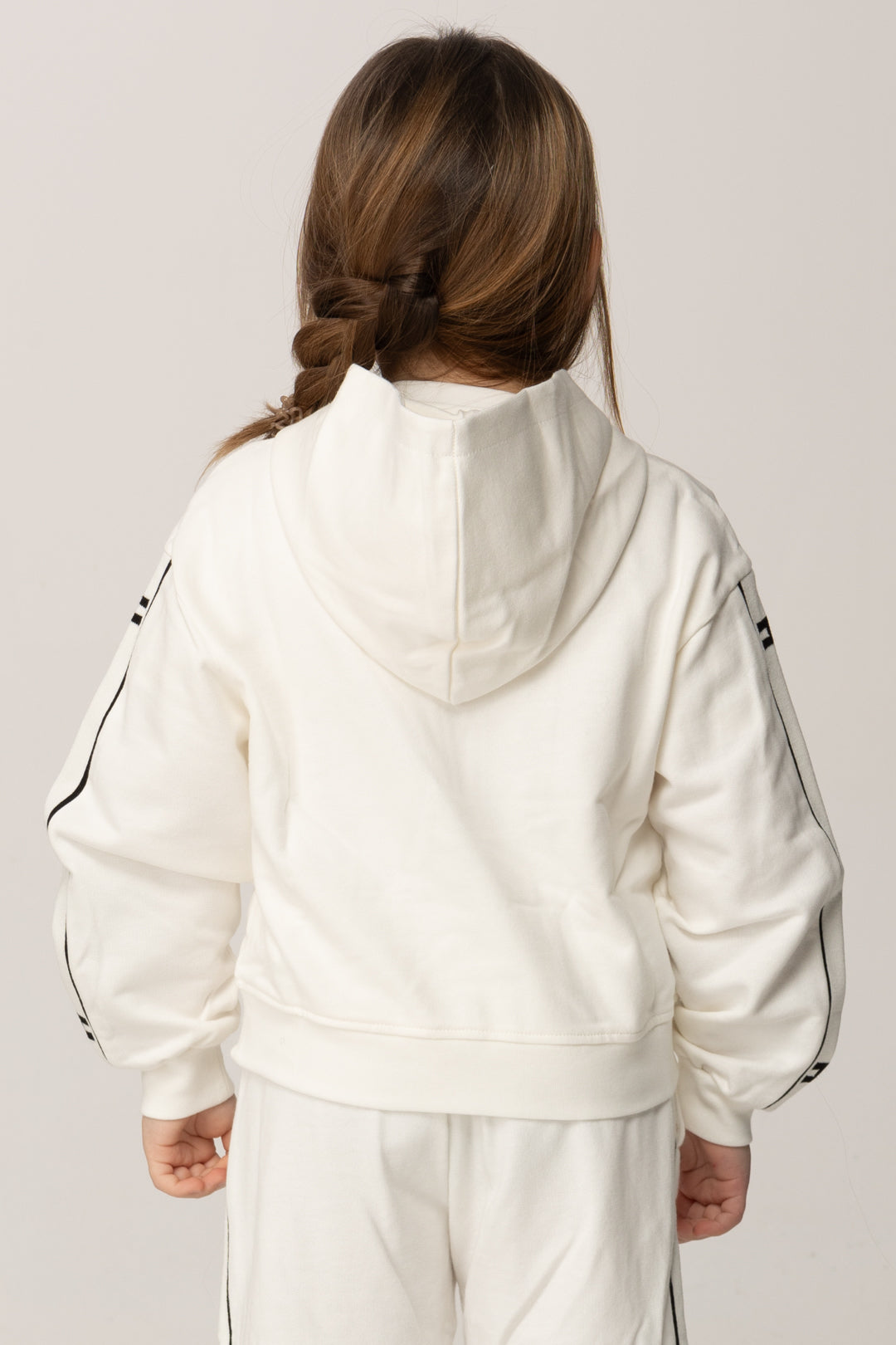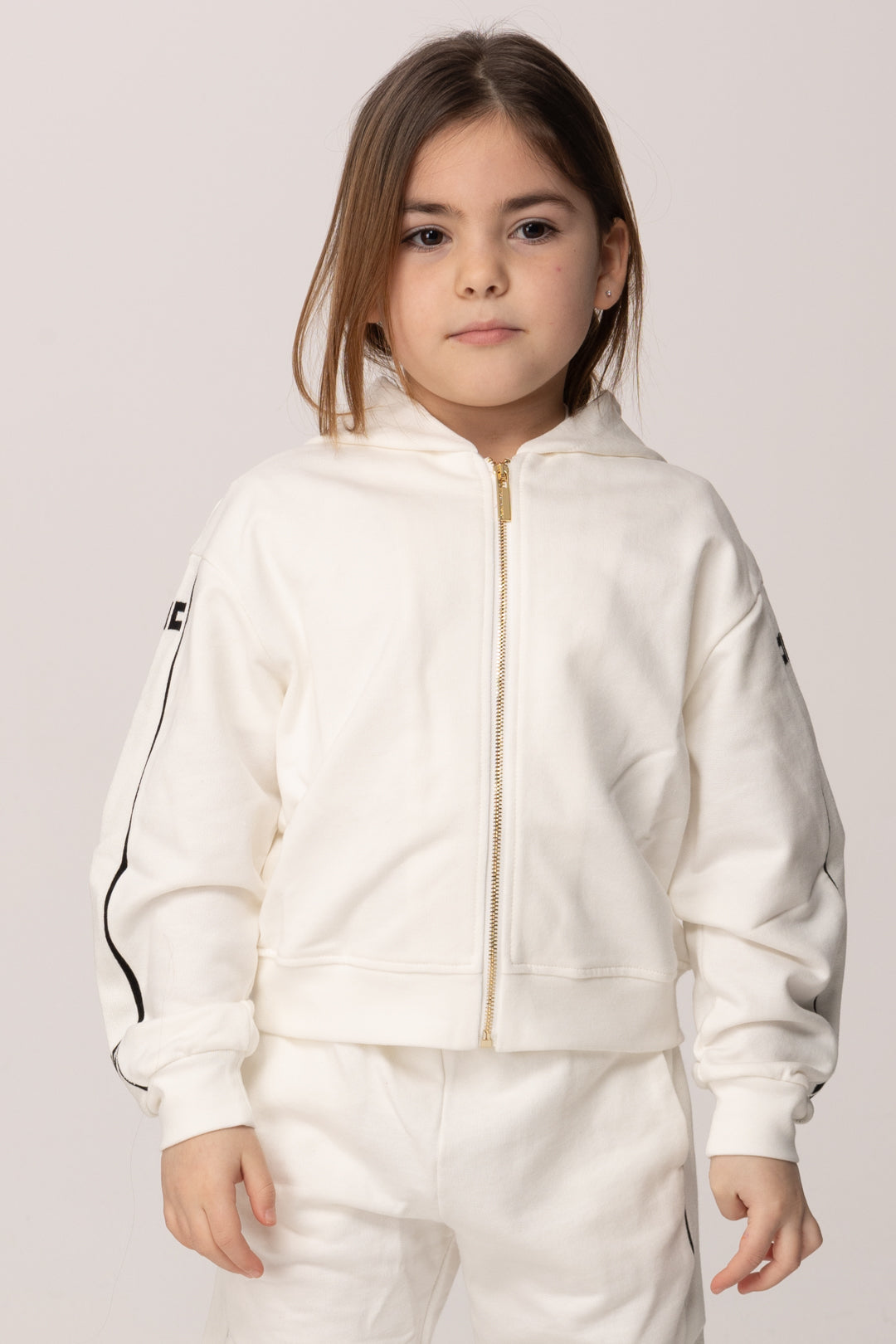 La linea morbida e leggermente boxy avvolge senza costringere, offrendo una vestibilità confortevole che segue i movimenti con naturalezza. Il cappuccio integrato aggiunge un tocco casual e funzionale, mentre la chiusura frontale con zip dorata illumina il design con un dettaglio delicato ma riconoscibile, rendendo la felpa immediatamente elegante pur restando informale.