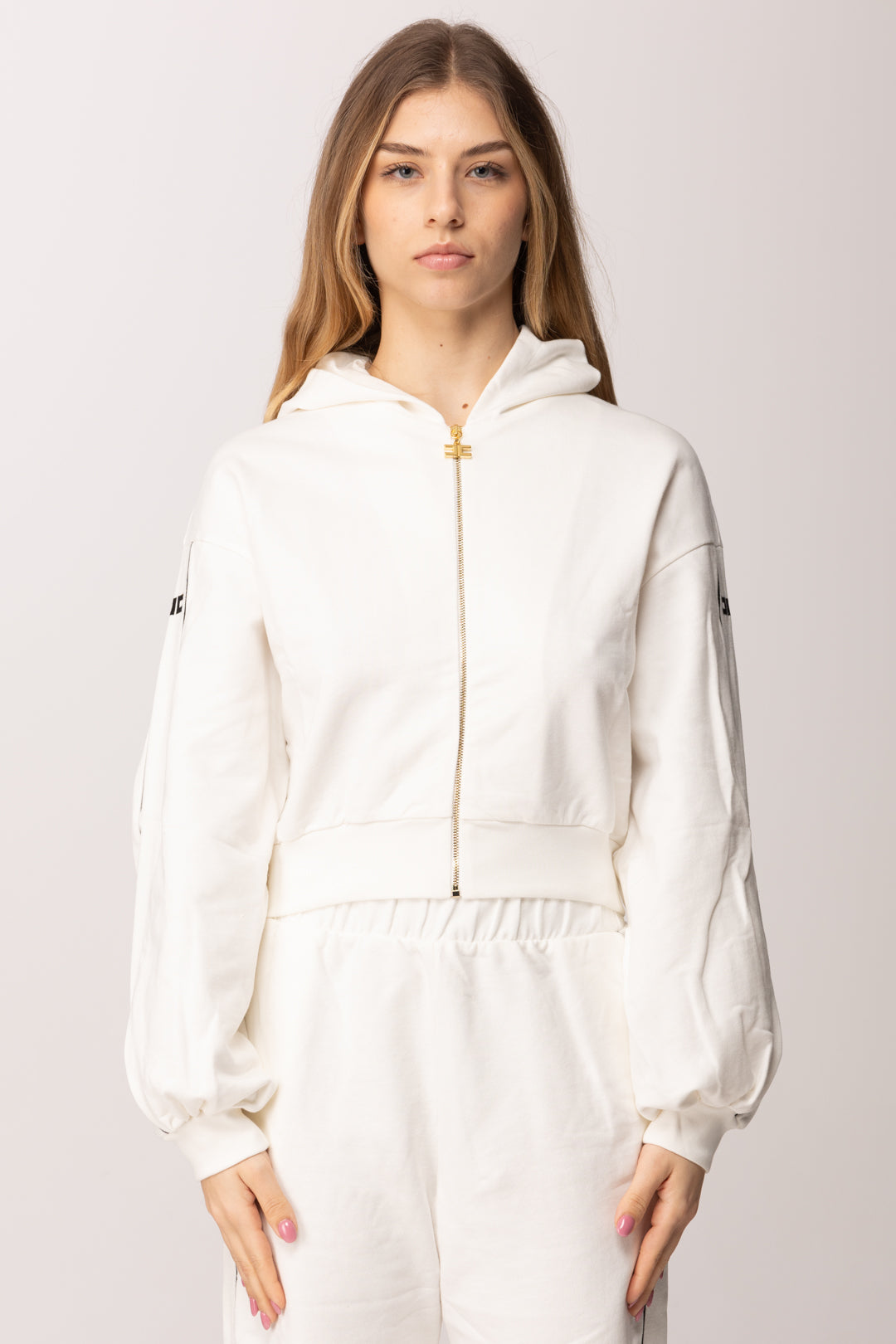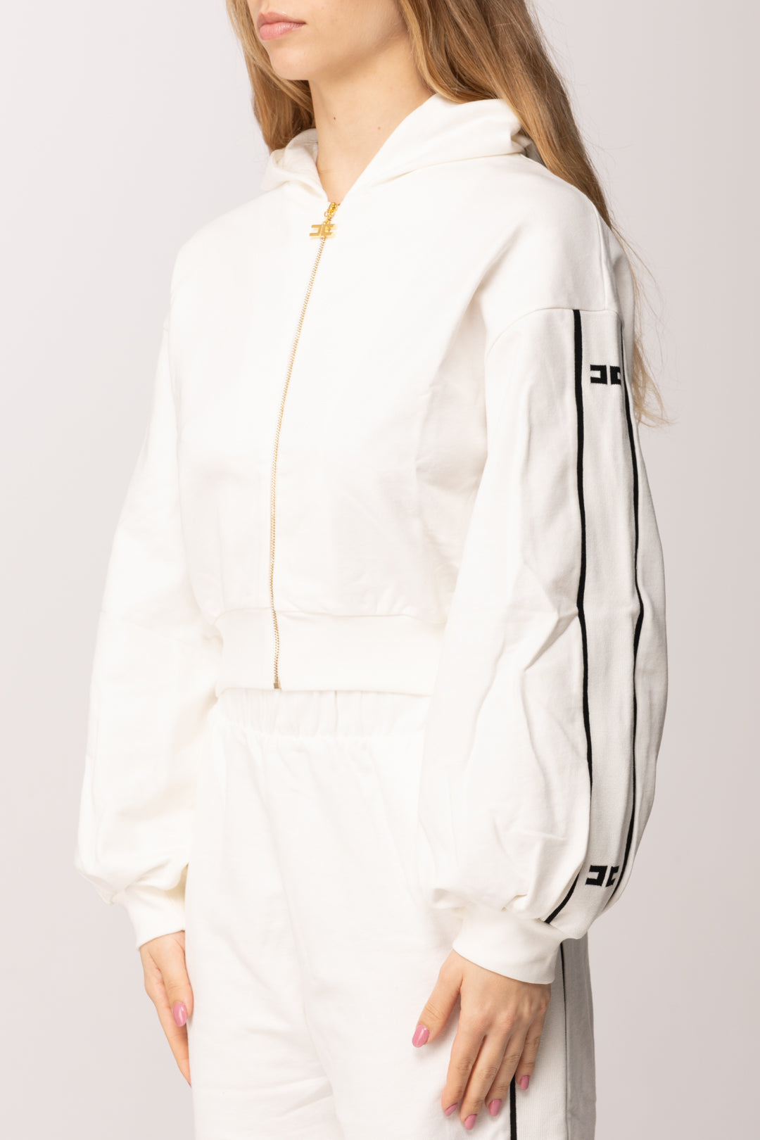Questa felpa Elisabetta Franchi La mia Bmabina unisce spirito sportivo e dettagli preziosi in un equilibrio perfetto tra comfort e stile. Il taglio leggermente corto dona modernità al capo, mentre il cappuccio aggiunge un’attitudine urbana e dinamica. La chiusura frontale con zip metallica e tiralampo logato introduce un dettaglio luminoso che richiama l’estetica iconica del brand. Le bande laterali sulle maniche rafforzano il carattere grafico, creando continuità visiva con il pantalone coordinato, che puoi trovare nel nostro catalogo online.