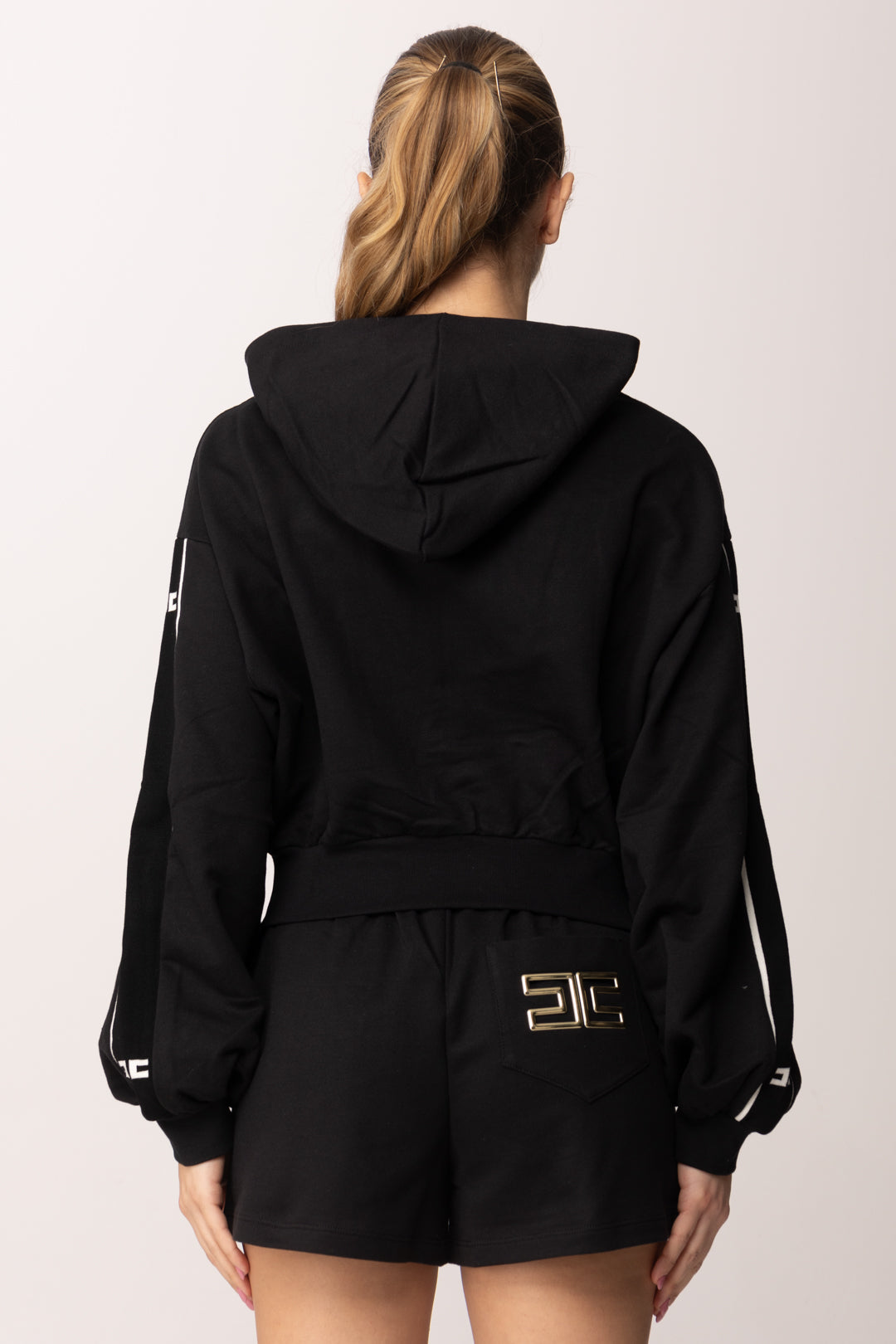 Questa felpa Elisabetta Franchi La mia Bmabina unisce spirito sportivo e dettagli preziosi in un equilibrio perfetto tra comfort e stile. Il taglio leggermente corto dona modernità al capo, mentre il cappuccio aggiunge un’attitudine urbana e dinamica. La chiusura frontale con zip metallica e tiralampo logato introduce un dettaglio luminoso che richiama l’estetica iconica del brand. Le bande laterali sulle maniche rafforzano il carattere grafico, creando continuità visiva con il pantalone coordinato, che puoi trovare nel nostro catalogo online.