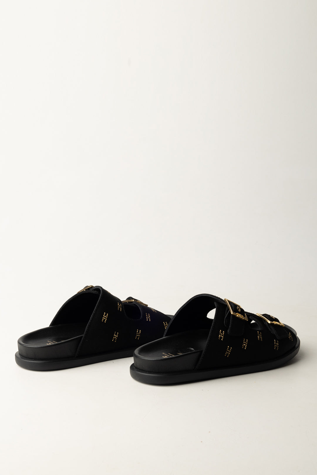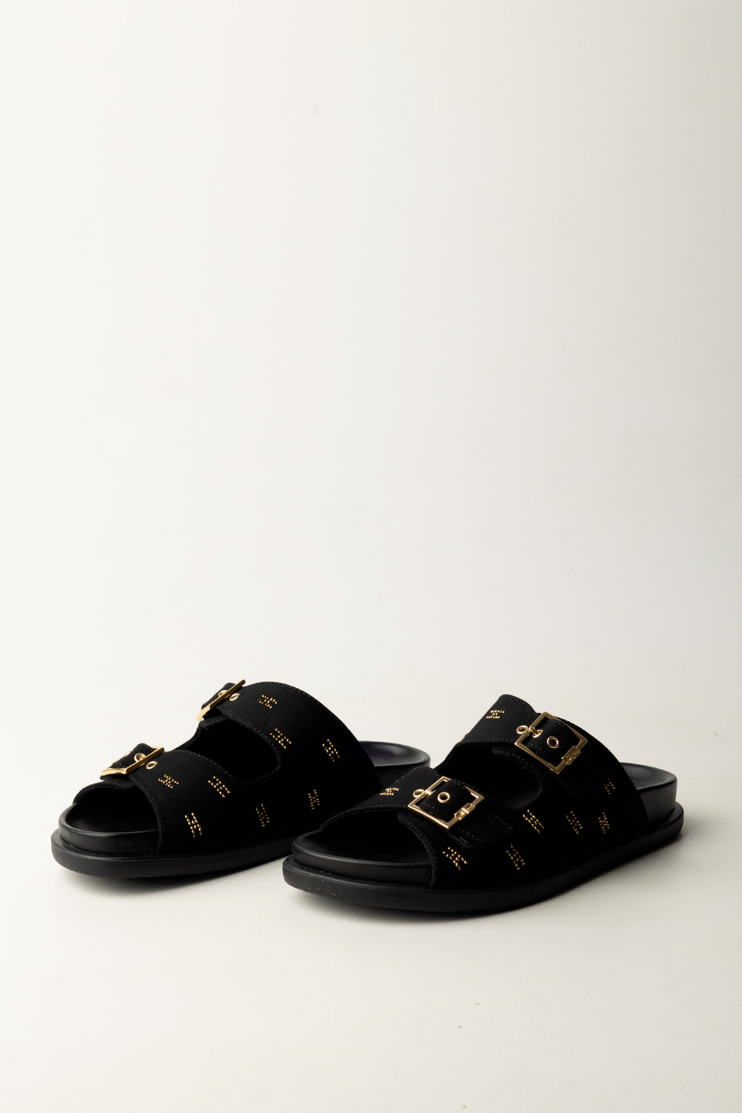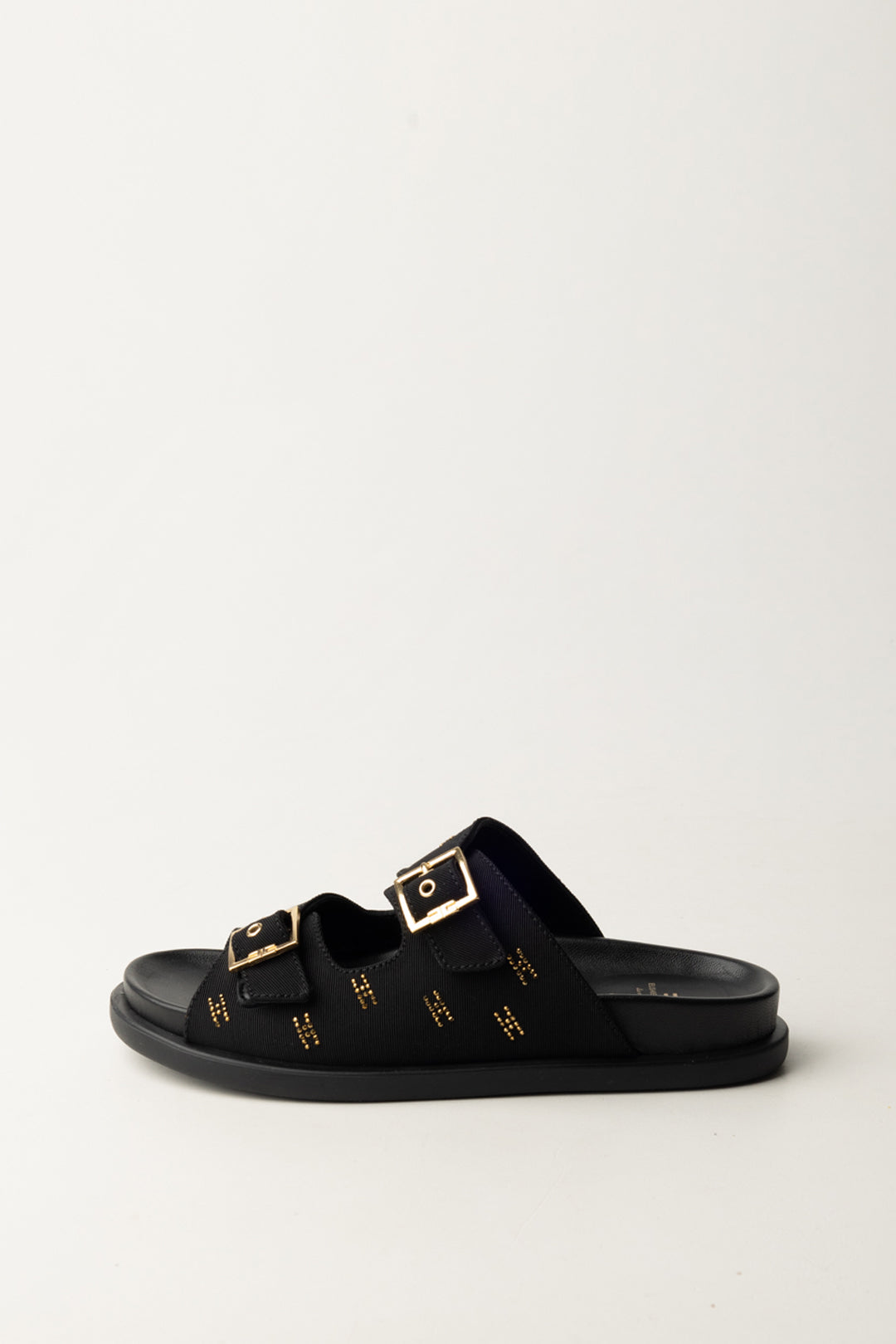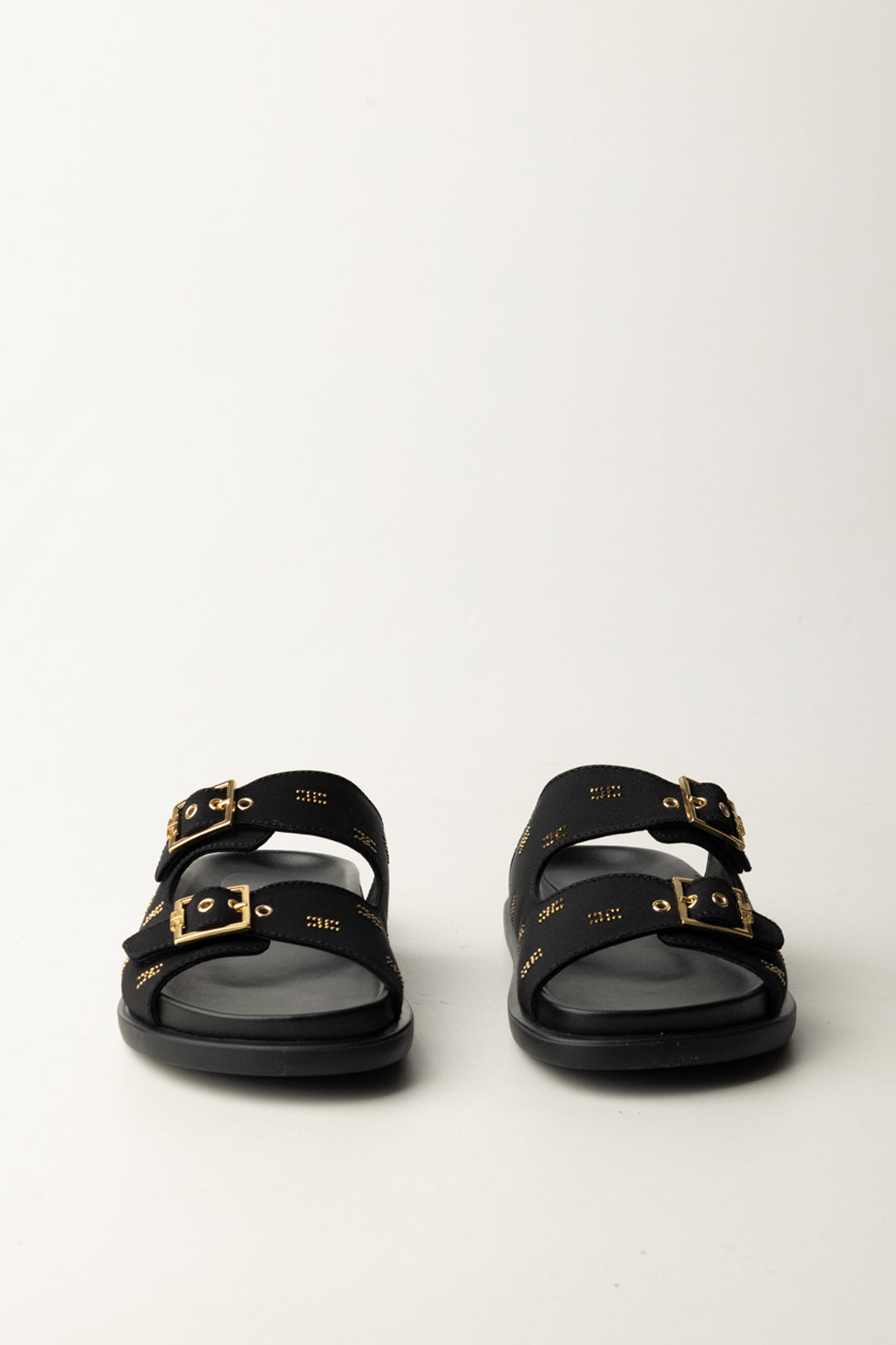 Sandales Elisabetta Franchi La Mia Bambina modèle plat avec double bride, boucles dorées et détails lumineux du logo. Essentiel, cool et super polyvalent pour compléter chaque tenue d'été.