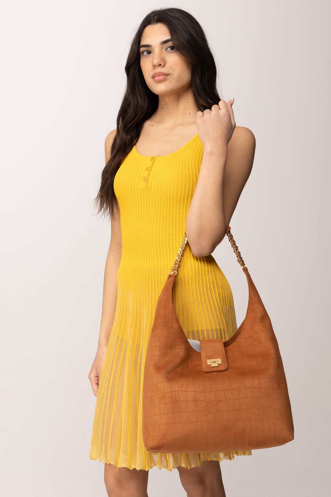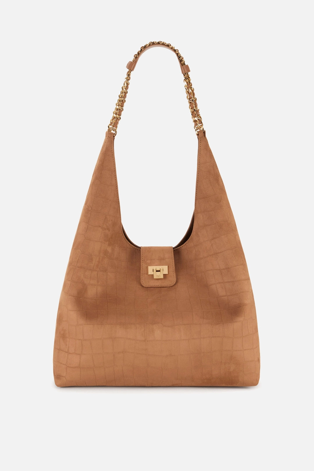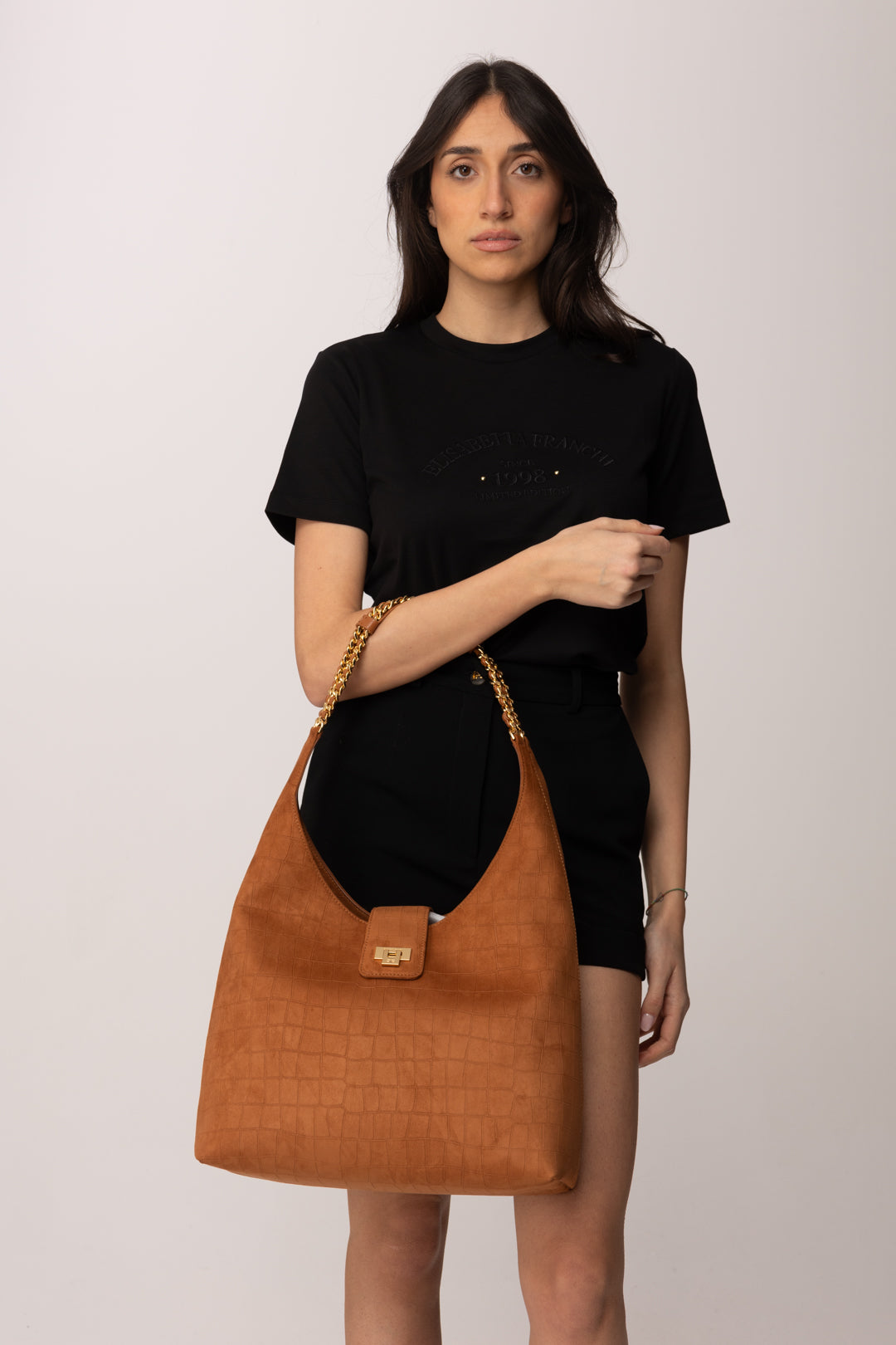 Borsa Elisabetta Franchi dalla linea hobo morbida e sofisticata, caratterizzata da un design ampio e avvolgente che unisce funzionalità ed eleganza contemporanea. La superficie in suede è impreziosita da una delicata texture a stampa cocco che dona profondità materica e un effetto visivo ricercato, rendendo la Borsa immediatamente riconoscibile. La silhouette fluida crea un volume generoso ma armonico, perfetto per accompagnare la quotidianità con stile.