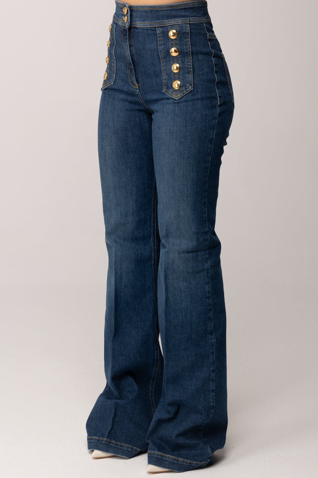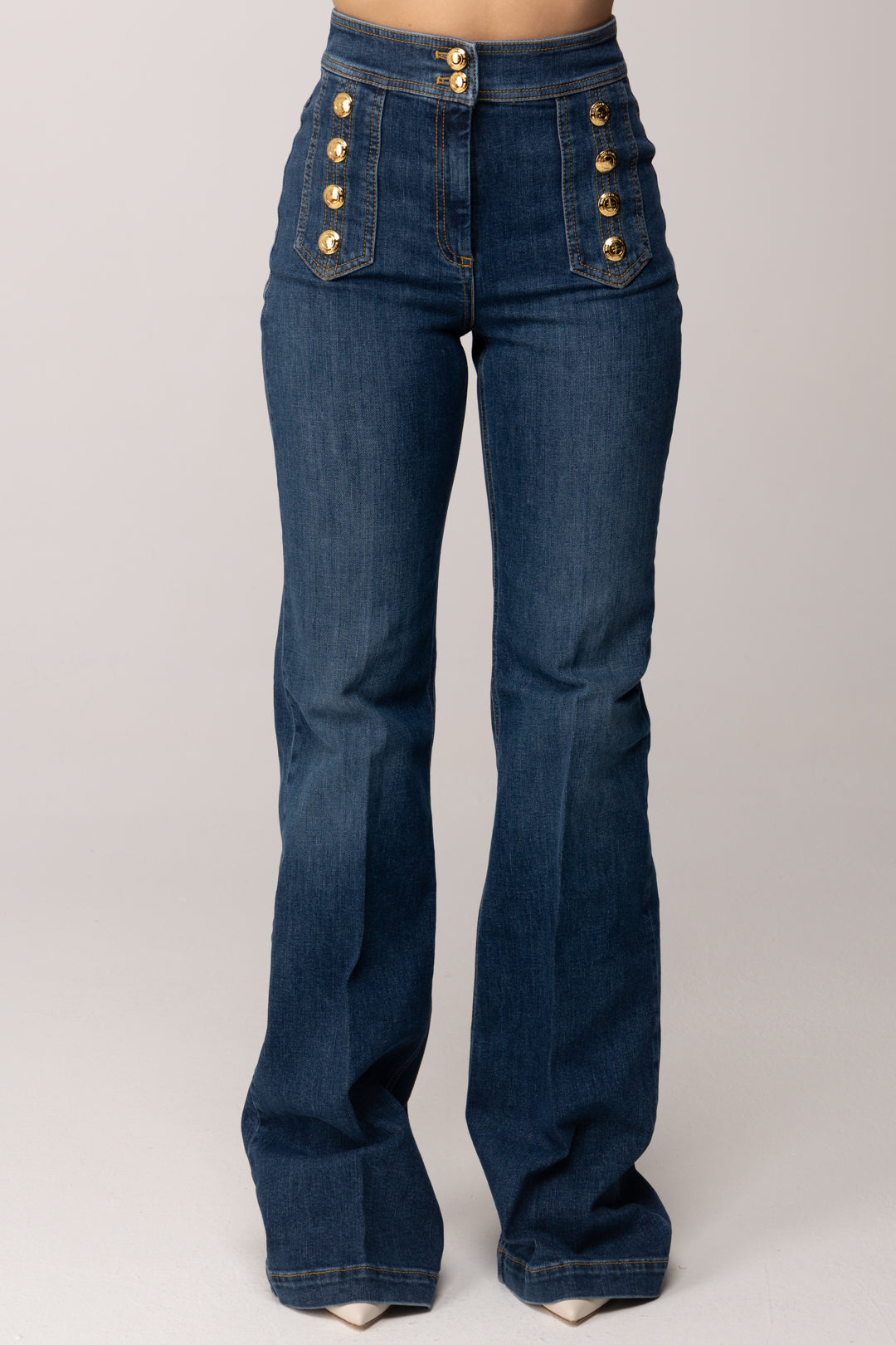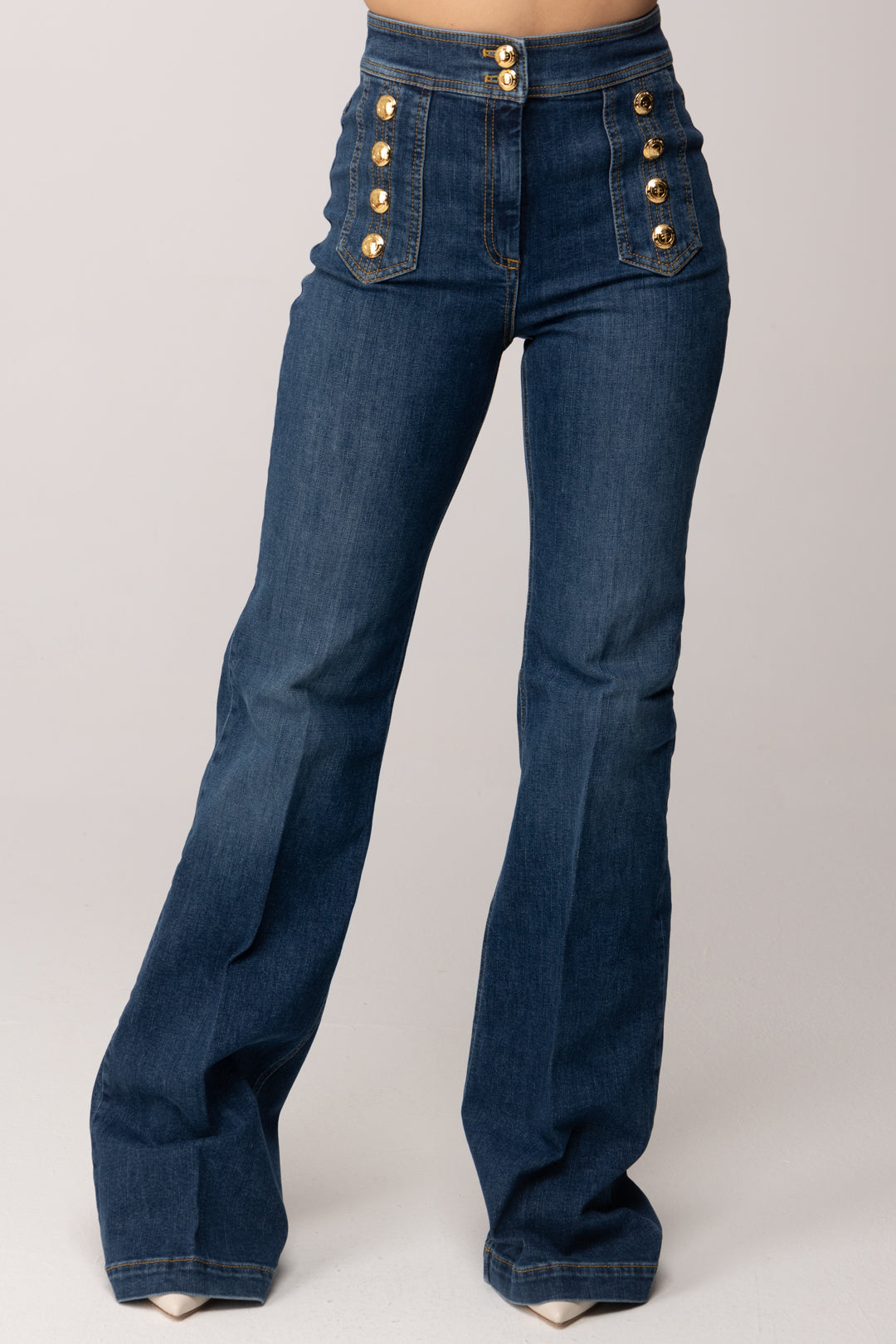 Sul davanti, i motivi di bottoni in metallo dorato con logo diventano l’elemento iconico del design, richiamando un’estetica ispirata al mondo tailoring. Il dettaglio luminoso aggiunge personalità al jeans, mantenendo al tempo stesso un’eleganza misurata e coerente con l’identità del brand.