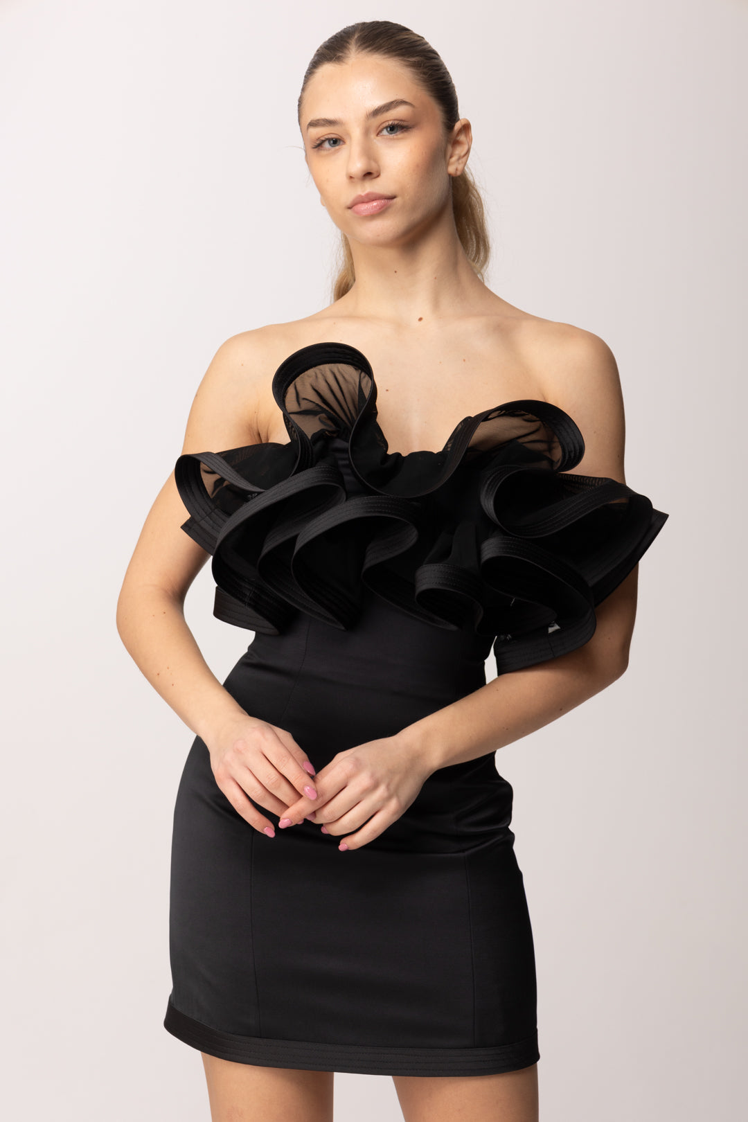 Questo mini abito Elisabetta Franchi interpreta la femminilità in chiave scultorea e sofisticata. La struttura, confermata dalla scelta del duchesse, è compatta e luminosa, arricchita dalla maxi ruche al petto che diventa fulcro visivo del design, creando movimento e teatralità. Le spalle sono lasciate scoperte, mentr il retro riproduce una chiusura a corsetto, per un abito che si ammira a 360 gradi.
