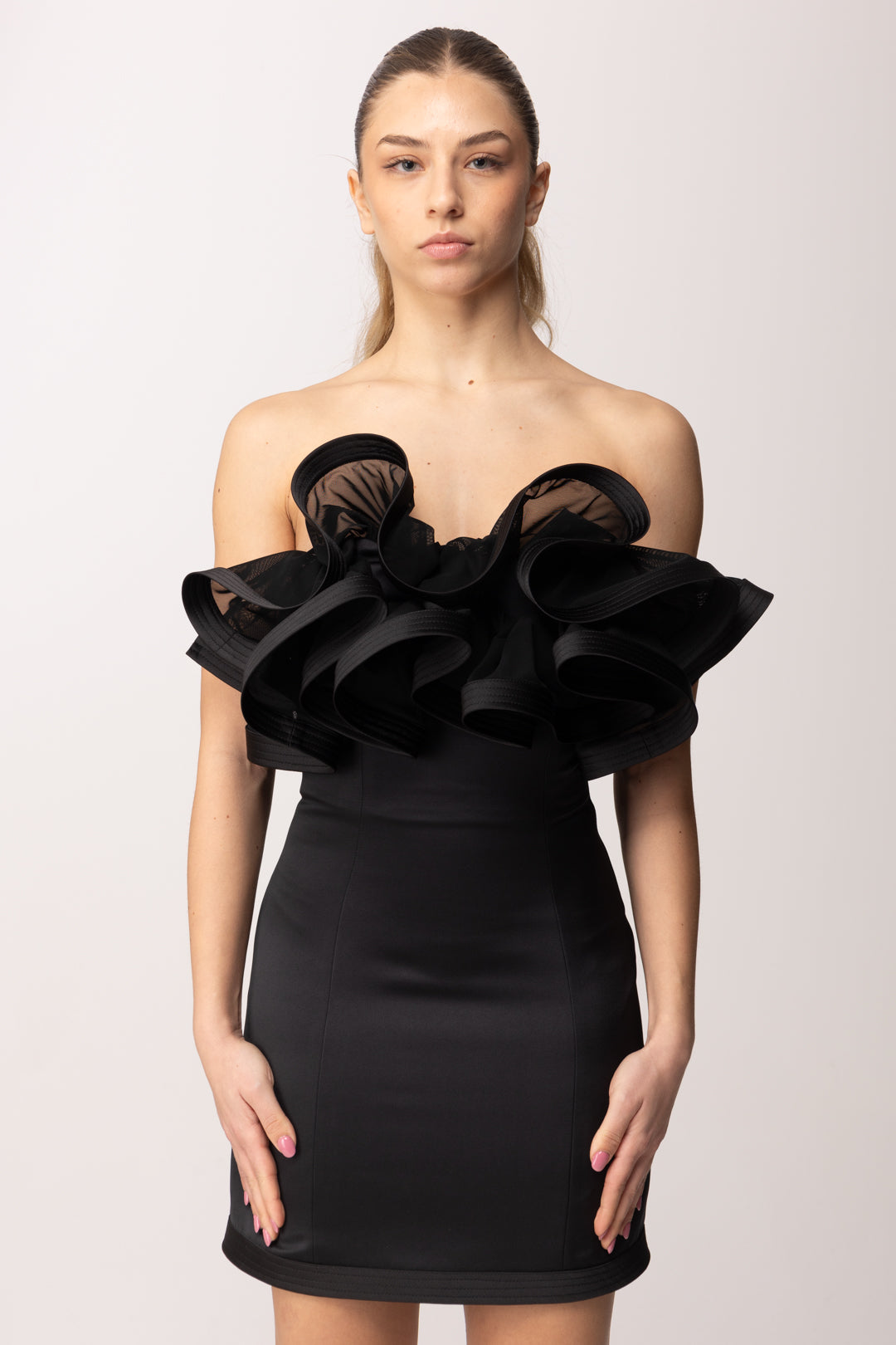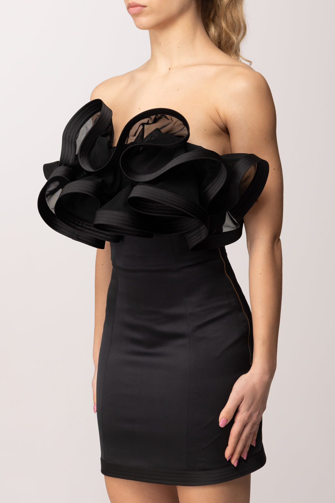 L’impatto è deciso ma raffinato: l’abito cattura la luce e attira l’attenzione grazie alla costruzione strutturata e alla ricchezza del dettaglio. Funziona bene anche senza capispalla - quindi puoi optare per una stola leggera o una fusciacca all'occorrenza - così da non togliere nulla alla partolarità della scollatura o del retro bustier, indossalo per un cocktail chic, una cerimonia non formale, un party esclusivo: funziona bene con sandali gioiello minimal per un red carpet contemporaneo, o con classiche Decolleté affusolate per una versione più elegante del tuo look. Raccogli i capelli per rafforzare la linea delle spalle e aggiungi orecchini e altri dettagli metal: un look potente e senza sforzo.