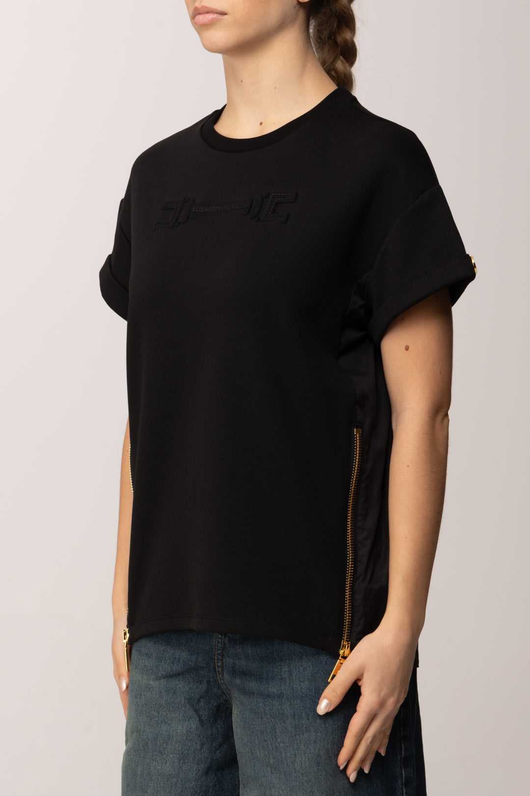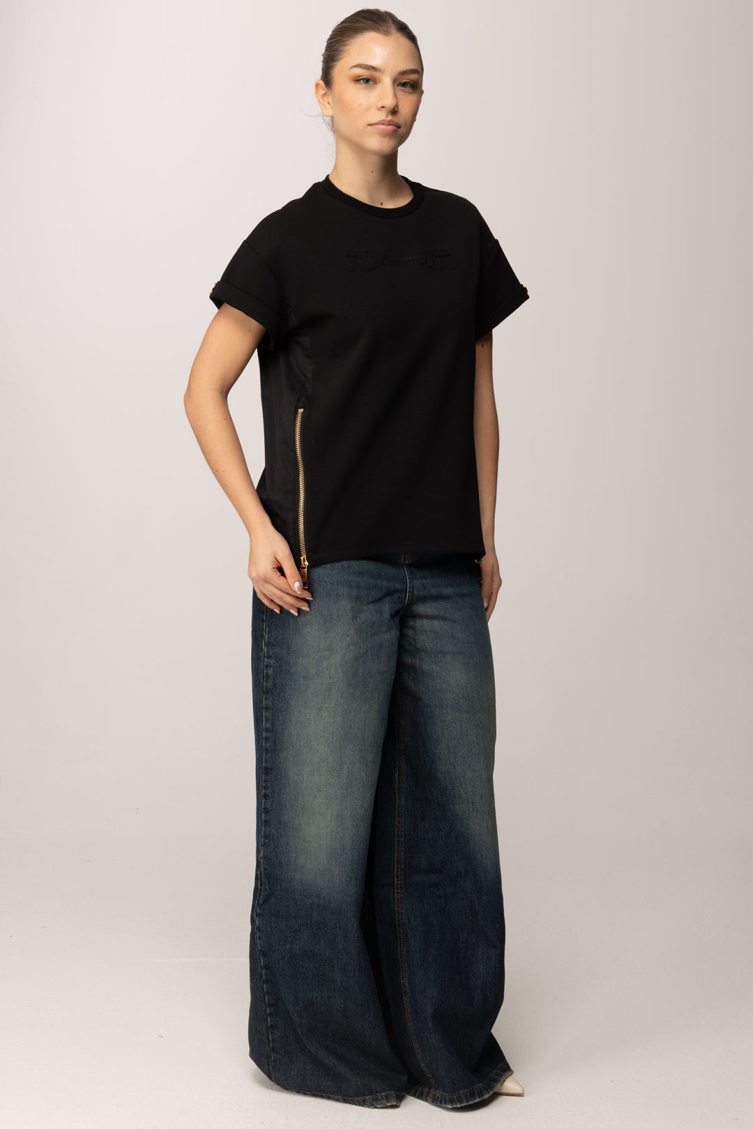 Le zip laterali con finitura dorata introducono un tocco funzionale e decorativo, permettendo di modulare la vestibilità e dare movimento alla linea. Un dettaglio che eleva il design e consente di personalizzare il modo di indossare la t-shirt, adattandola a look più lineari o più dinamici a seconda dello styling scelto.