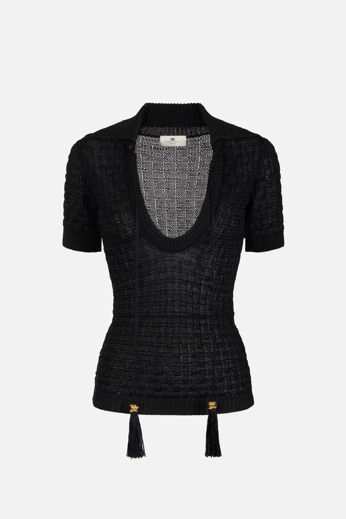 Grafico ma dinamico, essenziale ma ricco di carattere: questo Top Elisabetta Franchi trasforma la maglieria in un elemento espressivo e contemporaneo. La lavorazione in maglia aderente disegna la silhouette con precisione, mentre la struttura compatta valorizza il busto mantenendo comfort e fluidità. Le nappine applicate sono un elemento in movimento: ondeggiano con te ad ogni passo, sottolineando anche l'importanza della generosa scollatura, corredata di collettino.