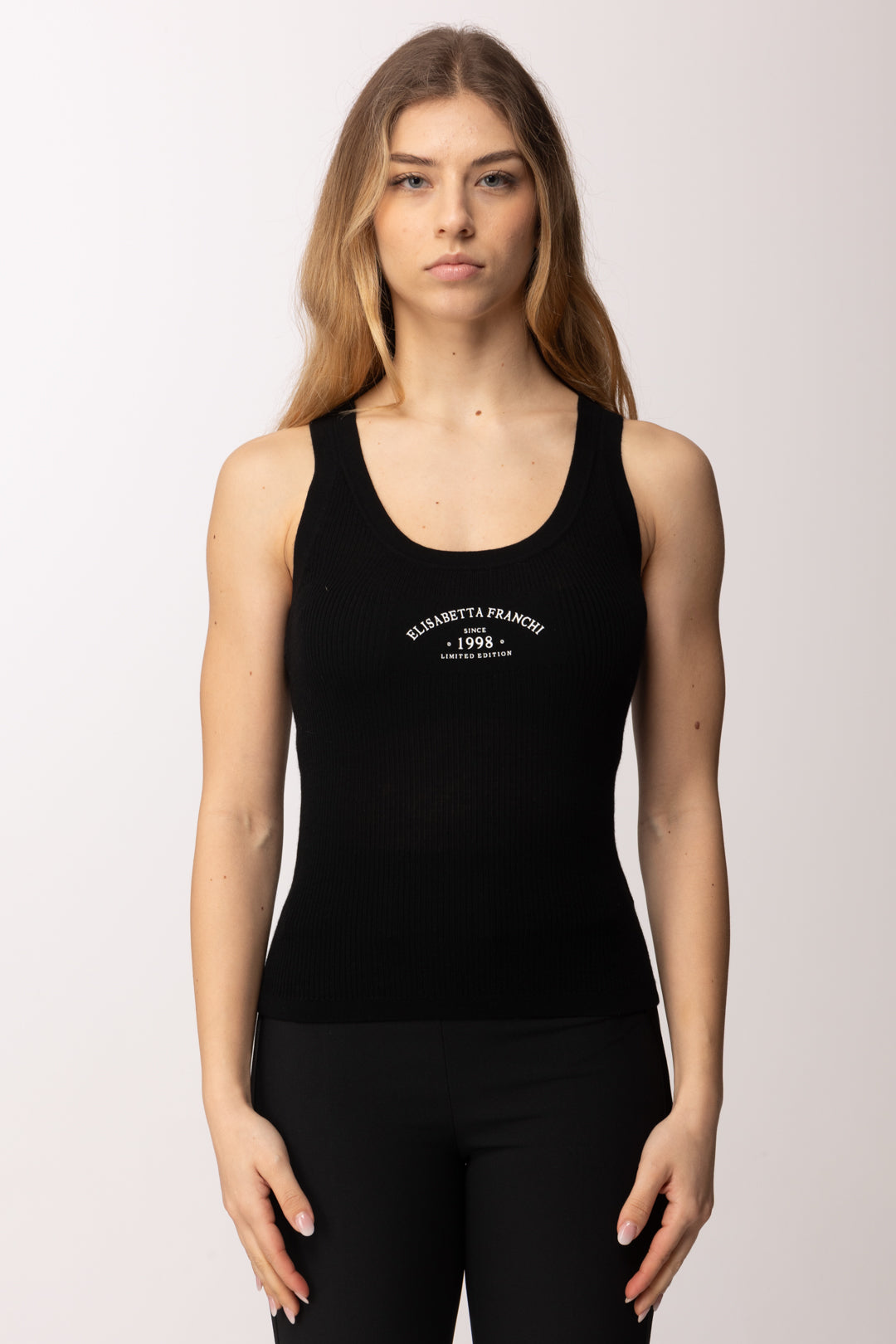 Questo top Elisabetta Franchi rappresenta l’essenza del minimalismo sofisticato, un capo essenziale che unisce pulizia formale e identità di brand in un equilibrio perfetto. La lavorazione a costine valorizza la silhouette con naturalezza, creando una linea aderente che segue il corpo senza costringerlo.