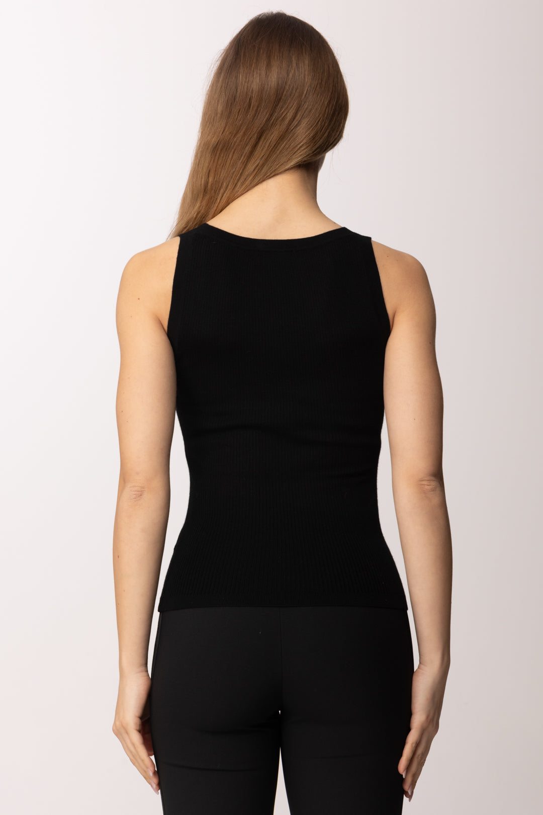 Lo scollo rotondo e il design smanicato donano versatilità al capo, rendendolo ideale sia come base per layering eleganti sia come protagonista di look più essenziali. La texture in maglia aggiunge profondità visiva, mantenendo al contempo un’estetica pulita e contemporanea.