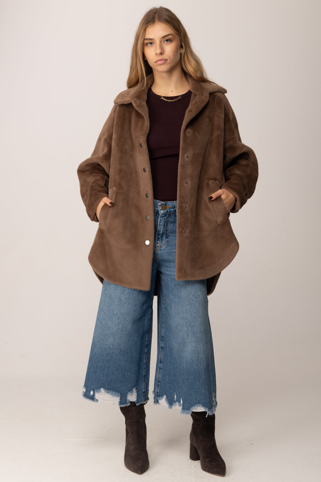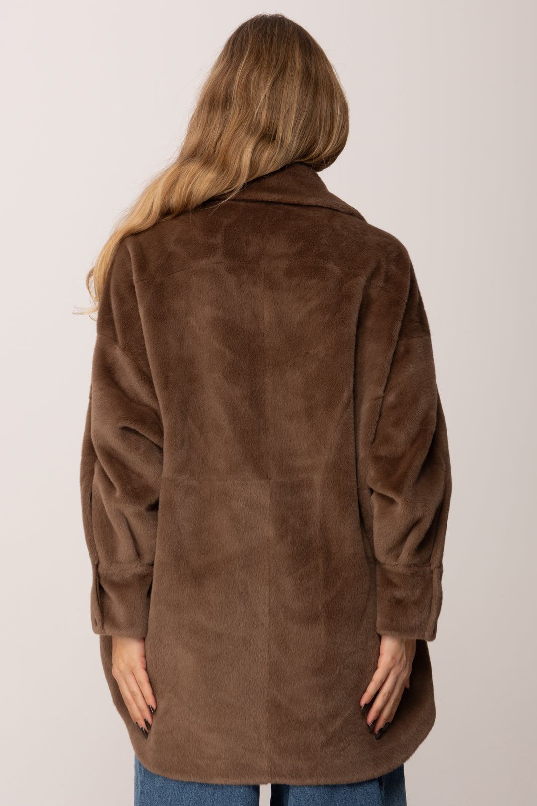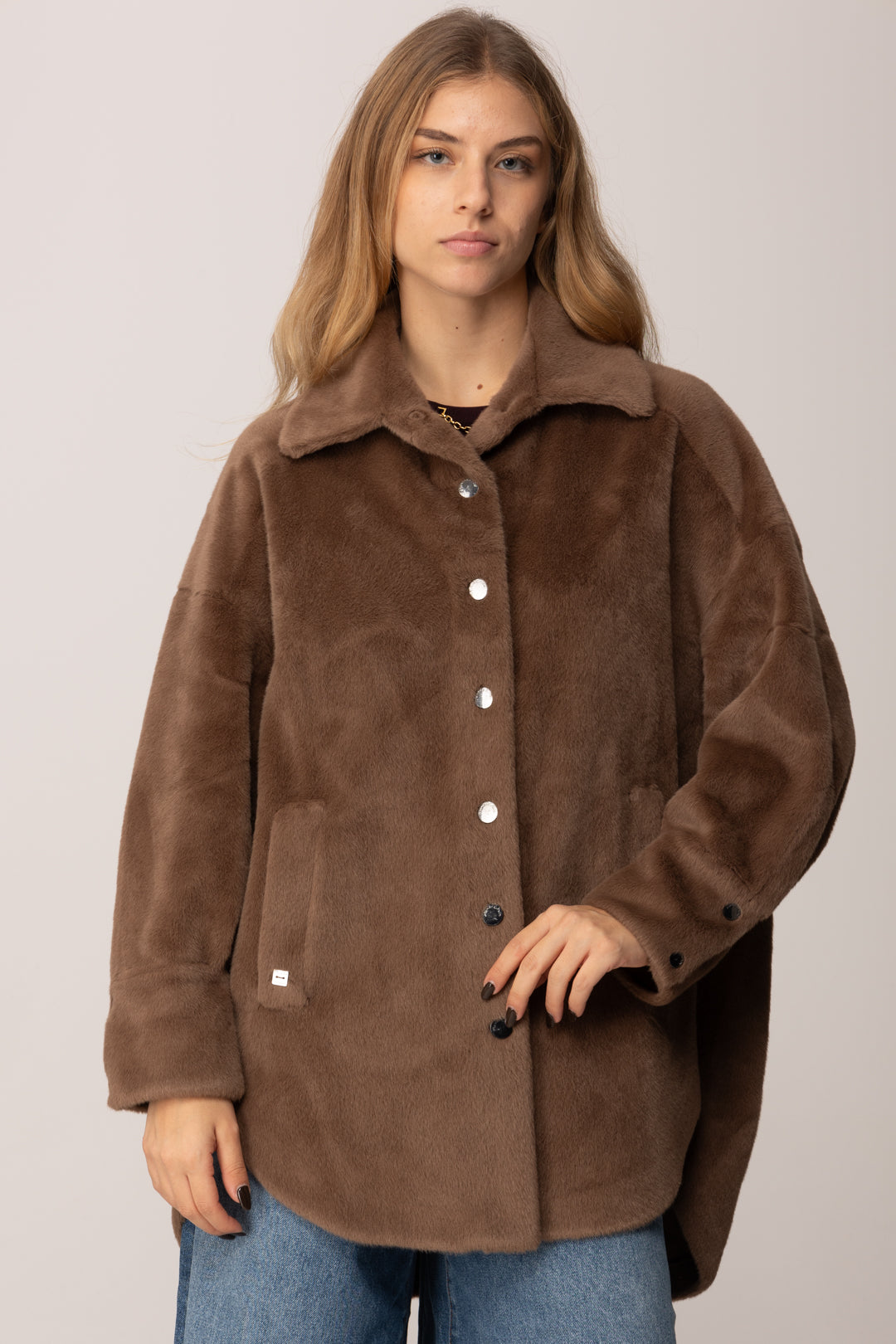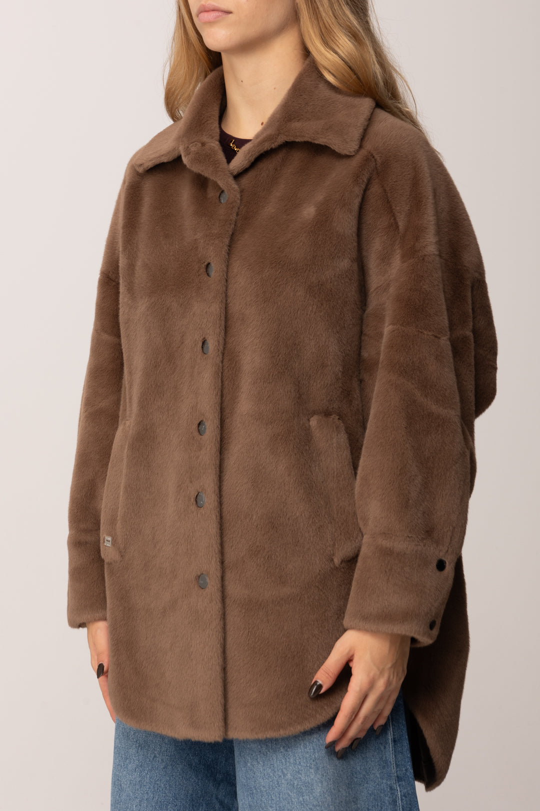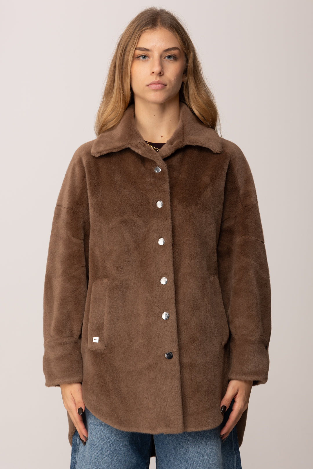 Le design épuré est rythmé par une rangée de boutons métalliques sur le devant qui ajoutent lumière et caractère, tandis que le col classique et les poches latérales complètent une esthétique polyvalente, équilibrée entre praticité et féminité. L’effet peluche apporte tridimensionnalité et douceur à la texture, faisant de cette veste un vêtement clé de la garde-robe hivernale, capable de sublimer n’importe quelle tenue avec simplicité et charme naturel.