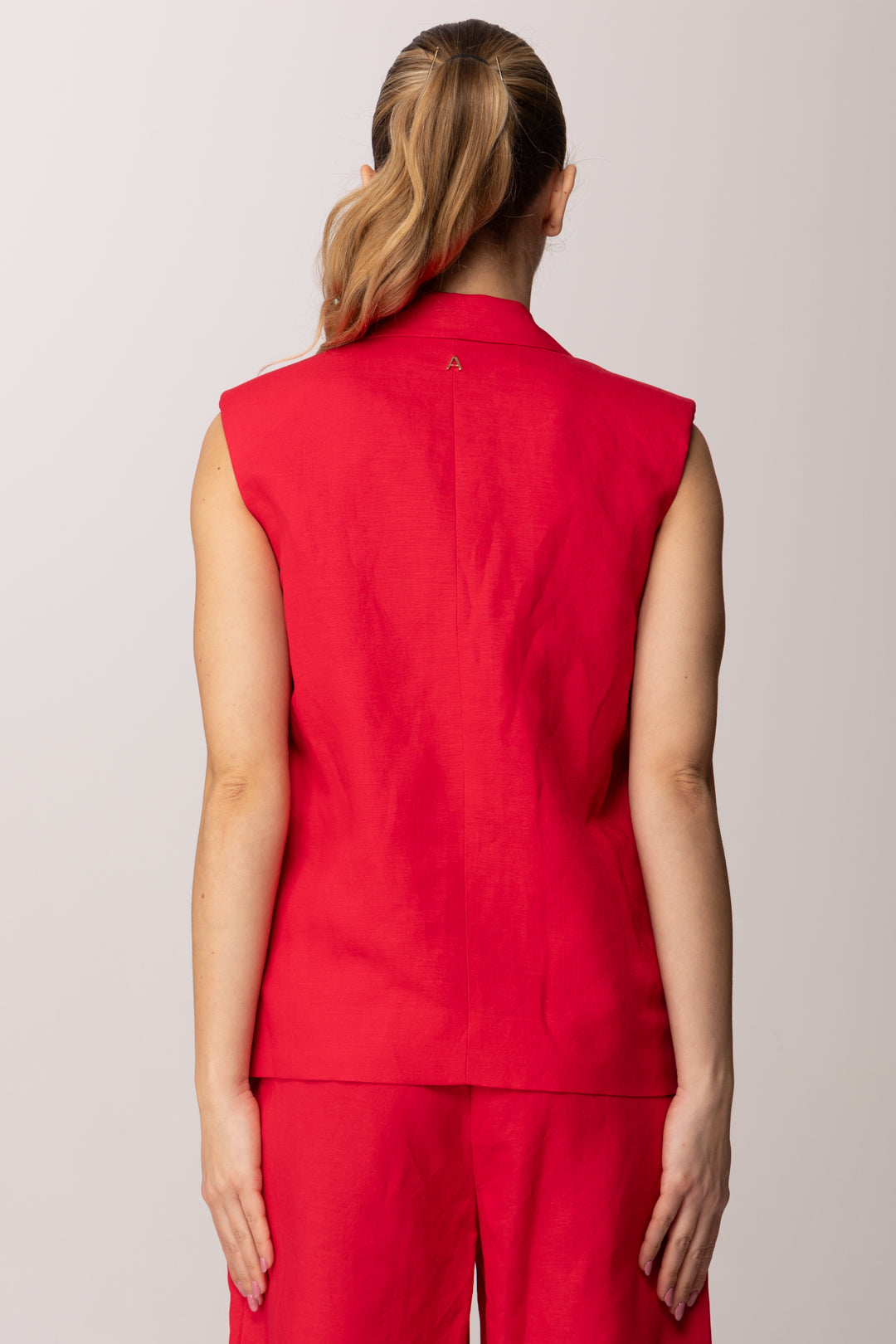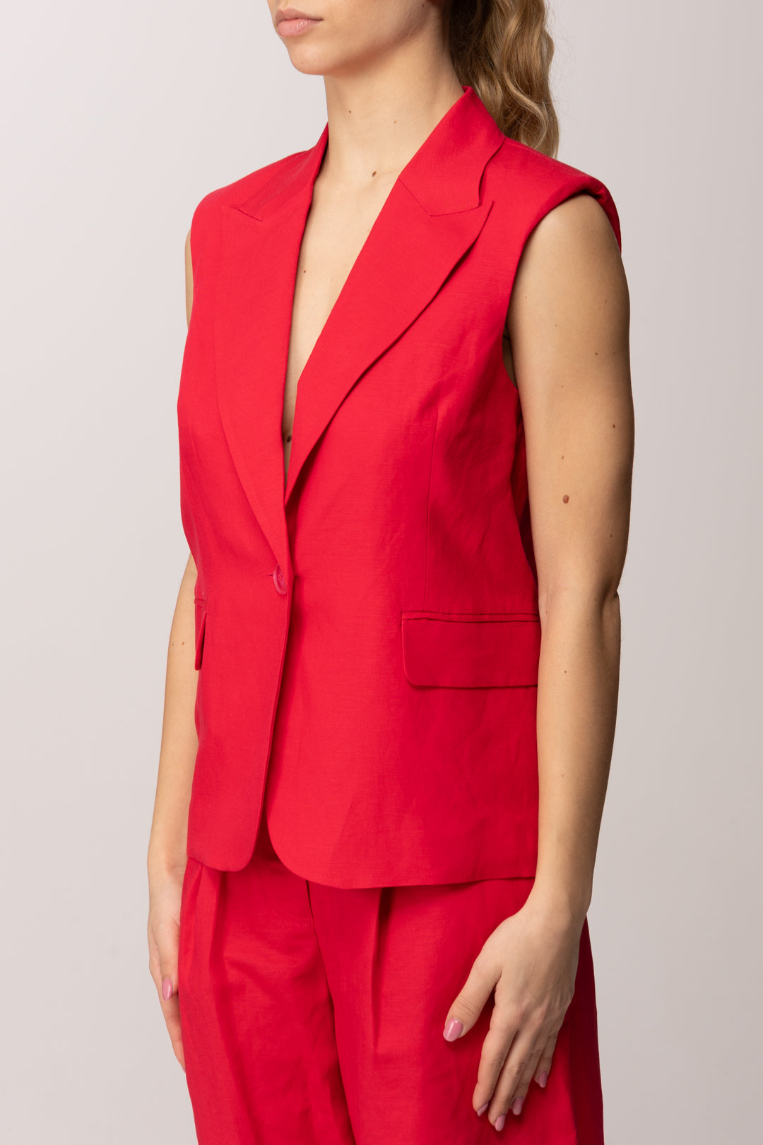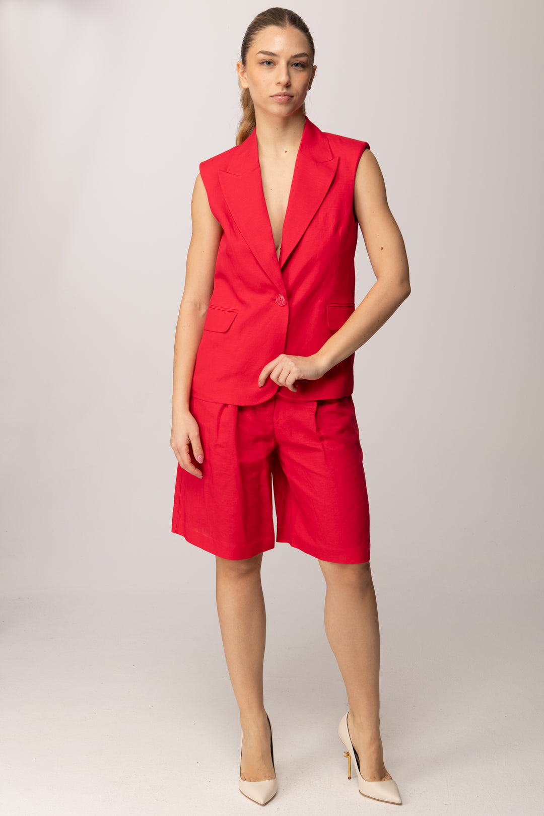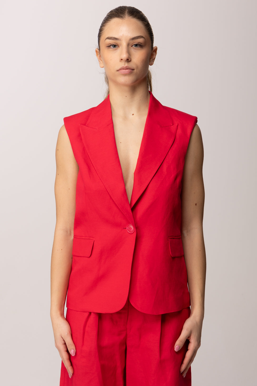 Deciso e contemporaneo, questo Gilet Twinset Actitude reinterpreta il tailoring estivo con un’attitudine moderna e femminile. Realizzato in tessuto misto lino e viscosa, unisce la freschezza naturale del lino alla fluidità della viscosa, creando una struttura leggera ma definita. Il collo con revers incornicia il décolleté con eleganza, mentre la chiusura monopetto con bottone in tono mantiene il design essenziale e raffinato.
