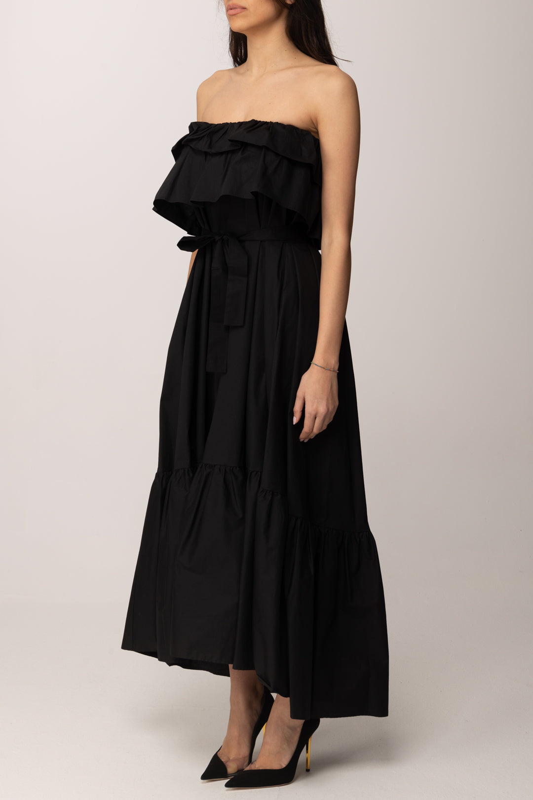 La doppia balza arricciata, posizionata al carré e al fondo, introduce movimento e volume, rendendo la silhouette fluida e dinamica ad ogni passo. La costruzione ampia accompagna il corpo senza costringerlo, valorizzando la figura attraverso il gioco delle proporzioni piuttosto che tramite linee aderenti. La cintura in tessuto rimovibile consente di modulare l’abito a seconda dello stile desiderato: indossata, sottolinea il punto vita; rimossa, lascia spazio a un’allure più morbida e rilassata.